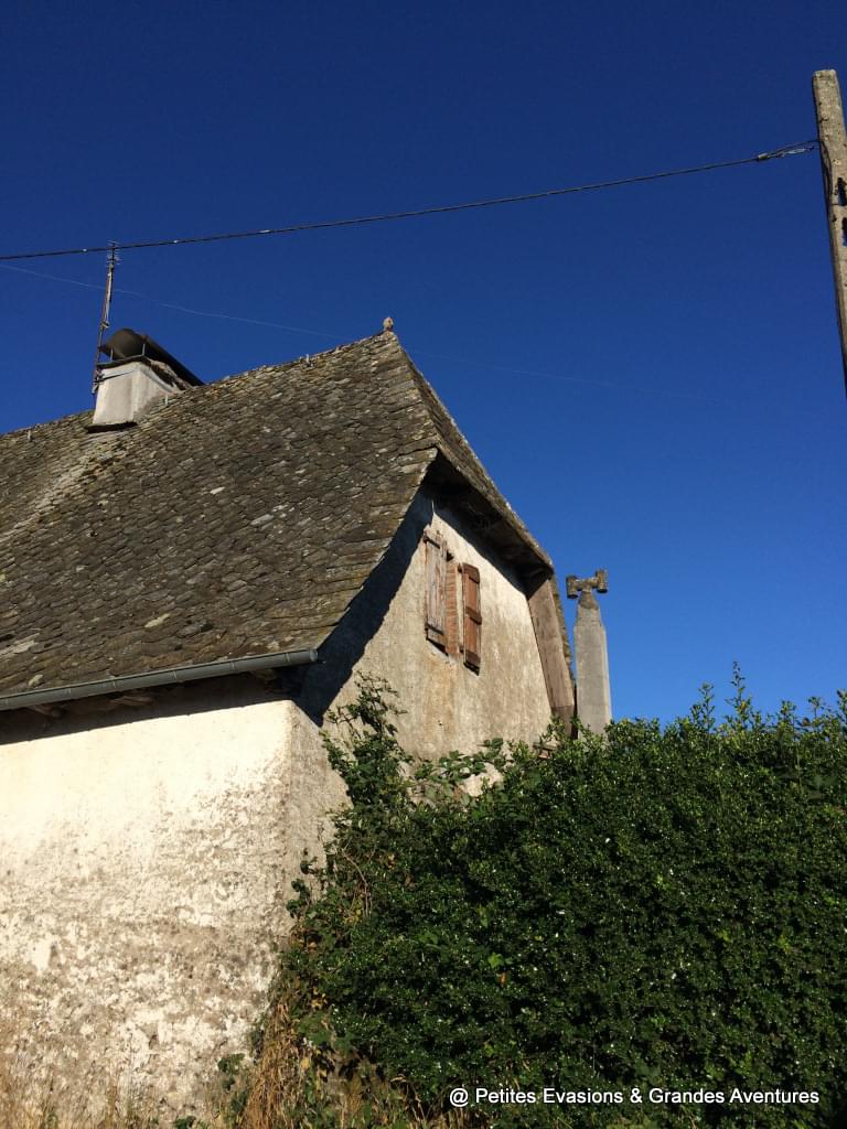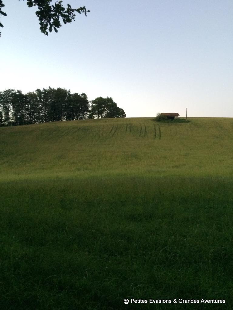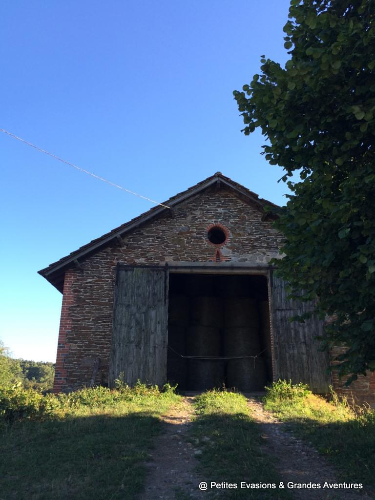Après un passage rafraîchissant dans les bois où nous découvrons un wagon échoué au pied d'un arbre (!) et les ruines d'une maison abandonnée, nous retrouvons les champs vallonnés puis un peu de civilisation dans le hameau qui nous accueille pour la deuxième étape.