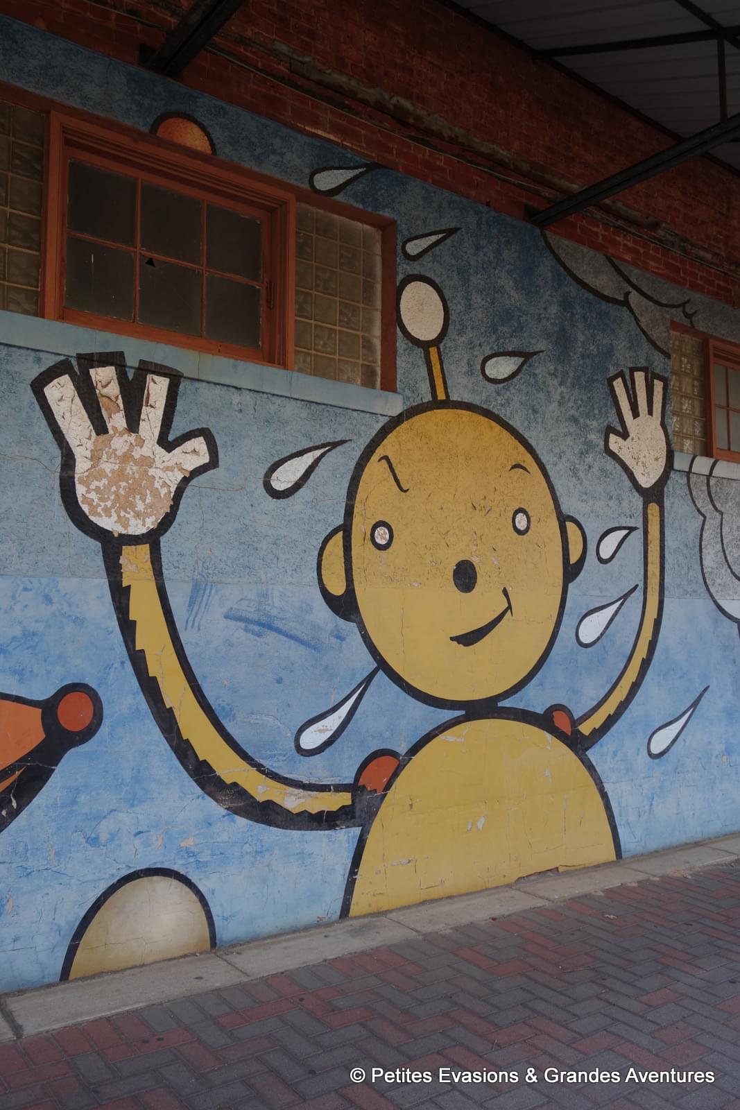 Cette oeuvre est composée de 22 panneaux sur lesquels l'artiste a dessiné des images, dans des styles parfois très différents, mais qui s'assemblent parfaitement tel un puzzle. Lorsque cette fresque a été révélée au public elle était en noir et blanc, l'objectif étant que ce soit la communauté qui lui apportent des couleurs.