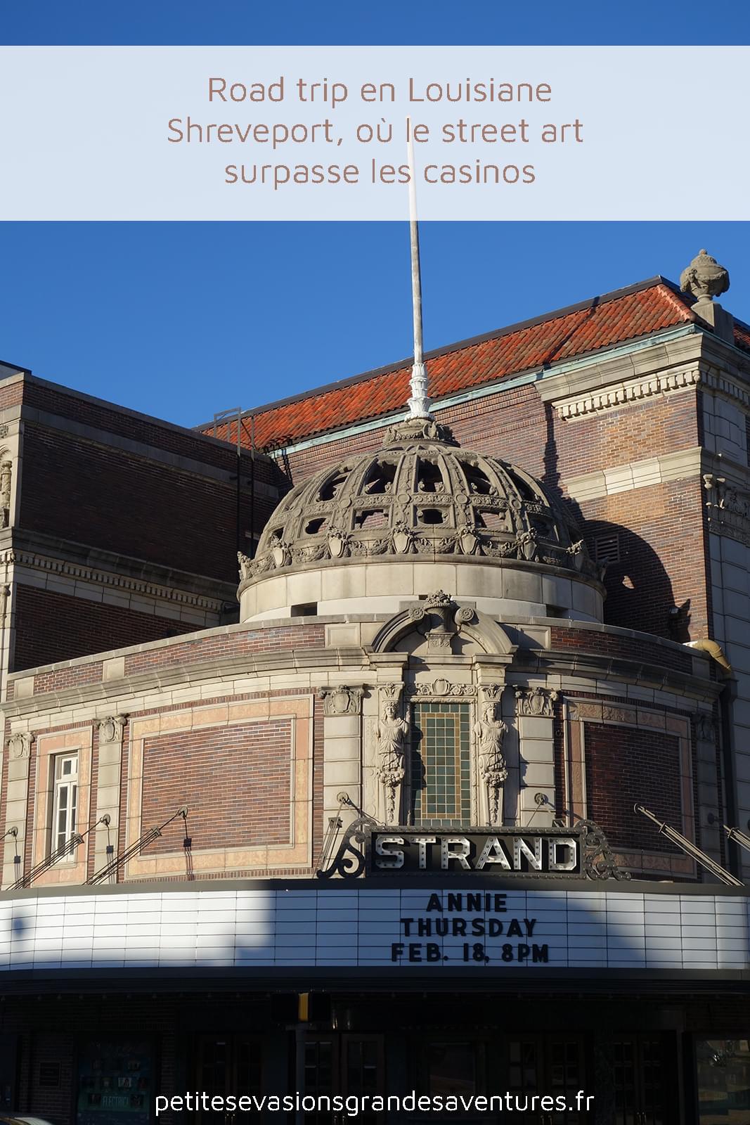 Parmi les bâtiments notables de Shreveport, il y a le Strand Theatre, qui a ouvert ses portes en 1925 et était connu comme le "Meilleur théâtre du Sud". Un temps menacé de destruction, ce bâtiment magnifique est, depuis 1977, enregistré au Registre National des Lieux Historiques.
