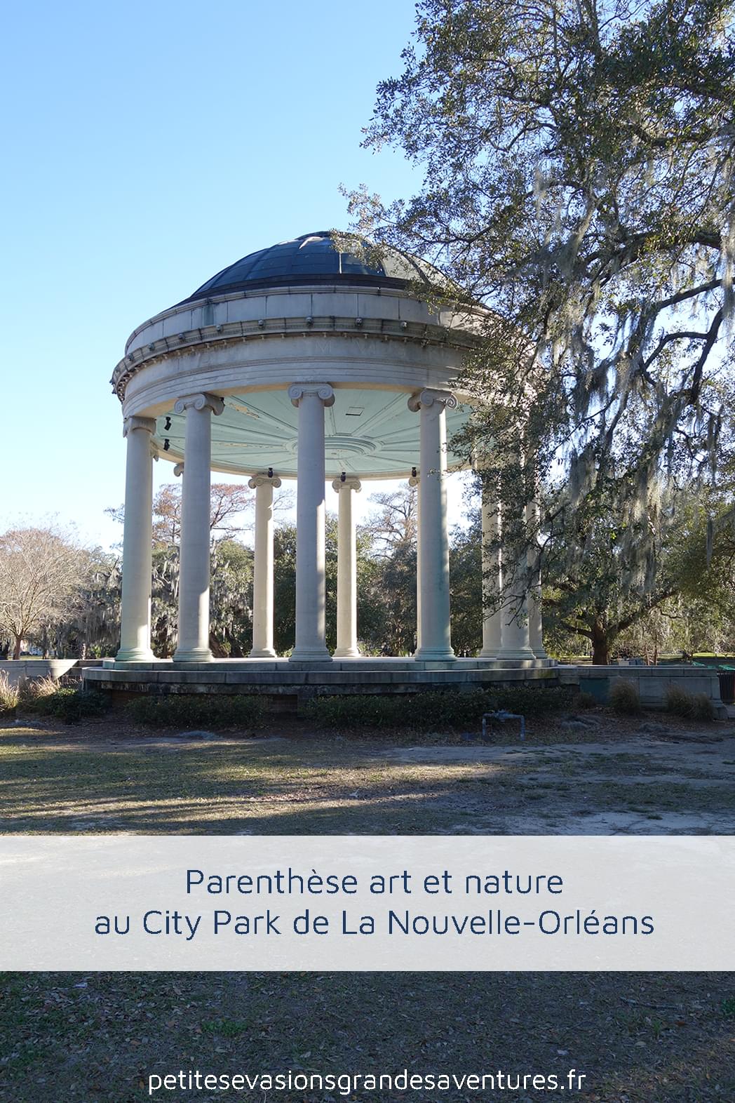 Après plusieurs journées passées à se promener dans les villes et à vivre l'agitation des parades, le besoin d'un peu de calme et de nature commençait à se faire ressentir. Heureusement pour nous, à la Nouvelle-Orléans, il existe un lieu parfait pour ce genre d'envie : le City Park. Situé dans le nord de la ville, ce parc est accessible en tramway ou (évidemment) en voiture avec la possibilité de se garer, très facilement, à l'intérieur.