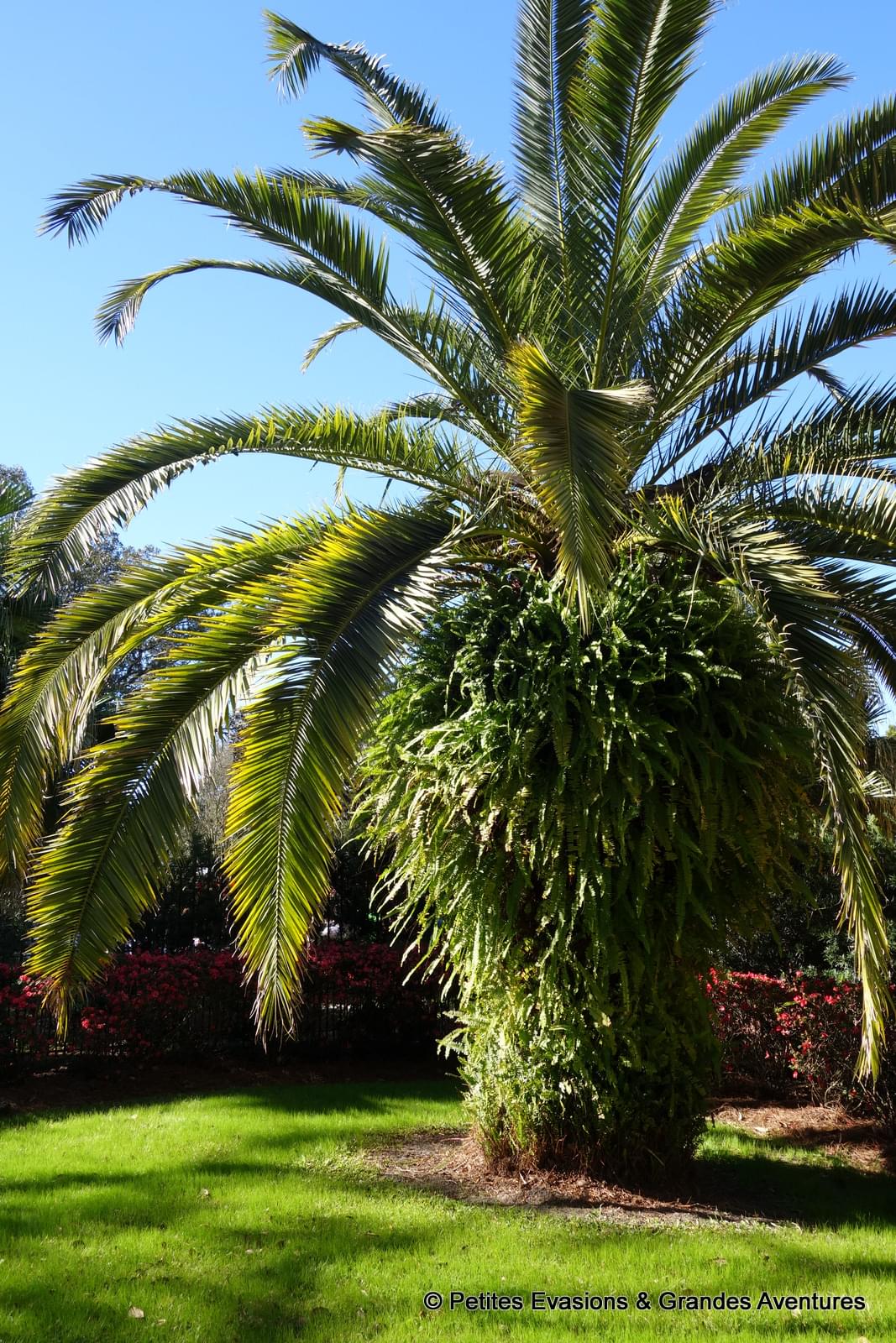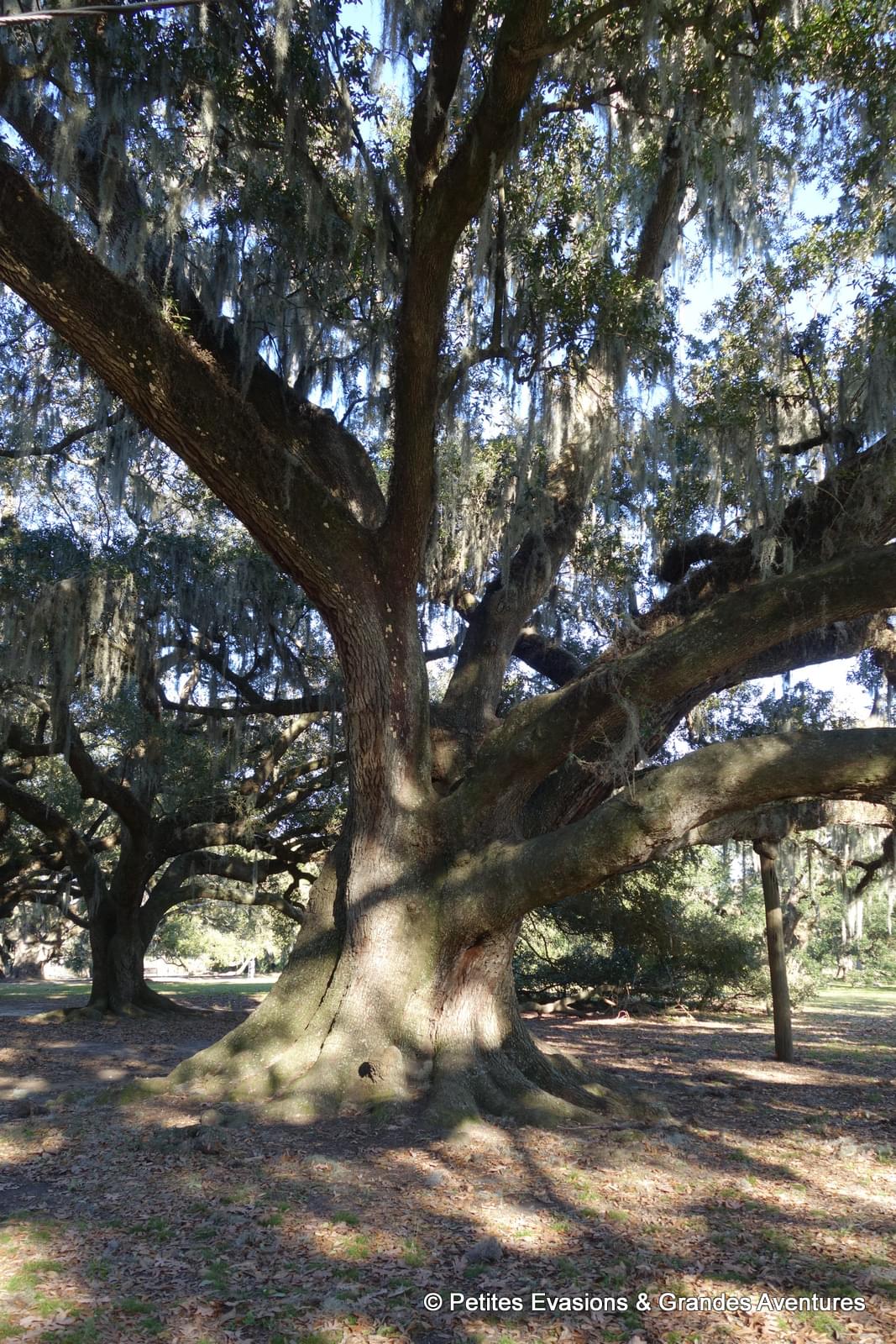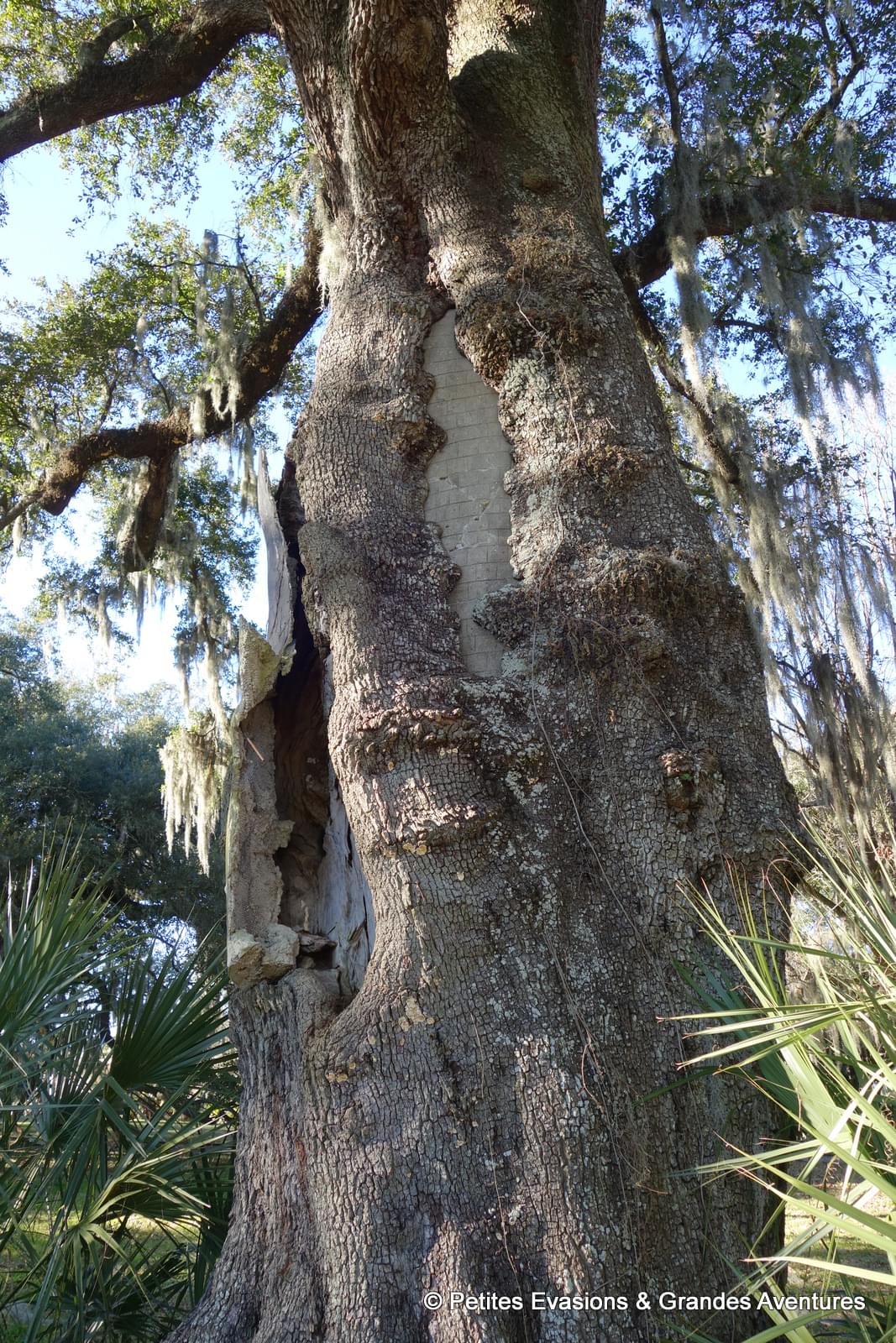 Ce parc comporte plus grande plantation de chênes à feuilles persistantes (les Quercus virginiana si vous voulez tout savoir !) dont certains ont plus de 600 ans. Ces arbres impressionnants ont des troncs monumentaux, tellement gros qu'ils sont éventrés à certains endroits et, pour éviter qu'ils cassent ou pourrissent, du béton a été coulé dans les fentes.