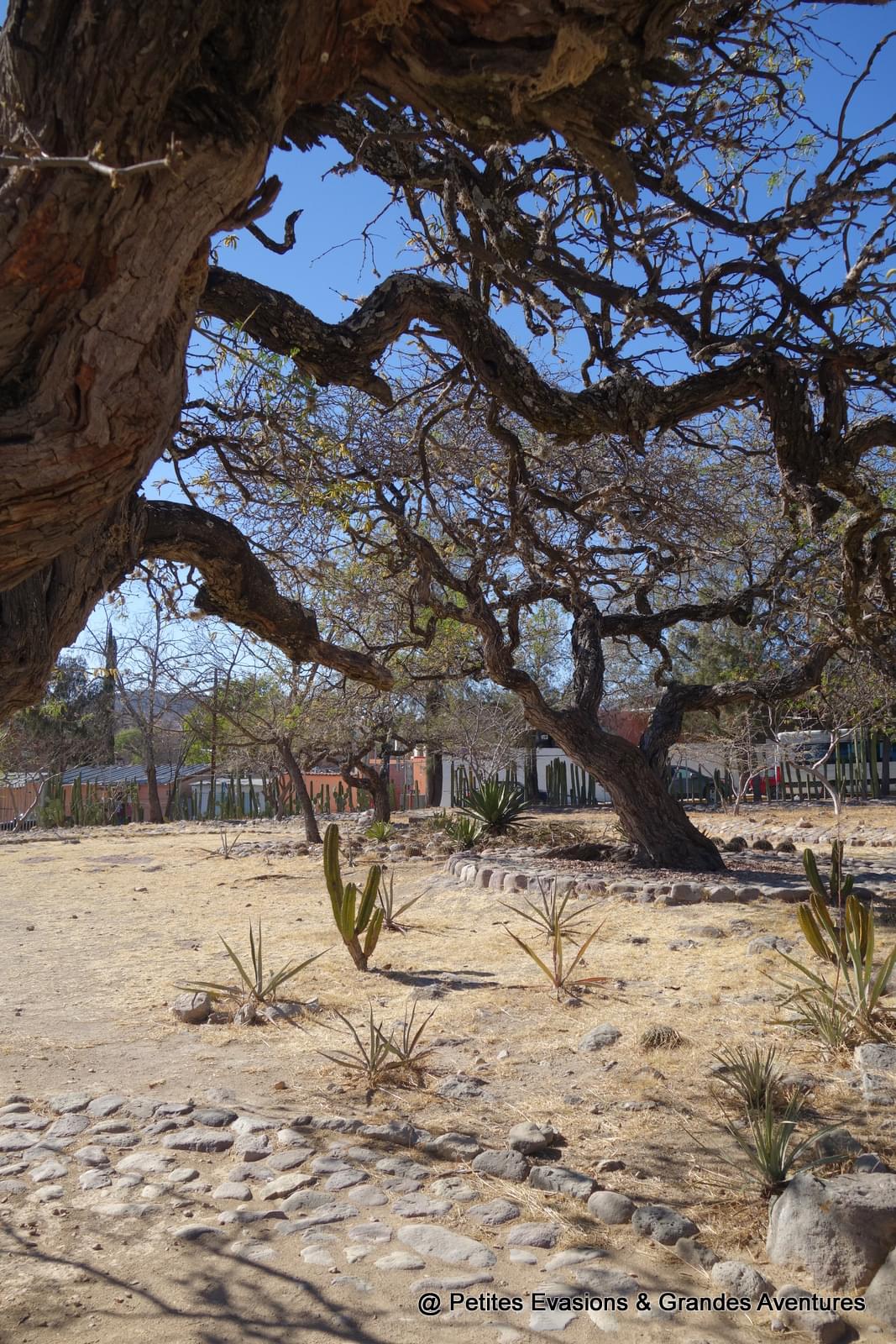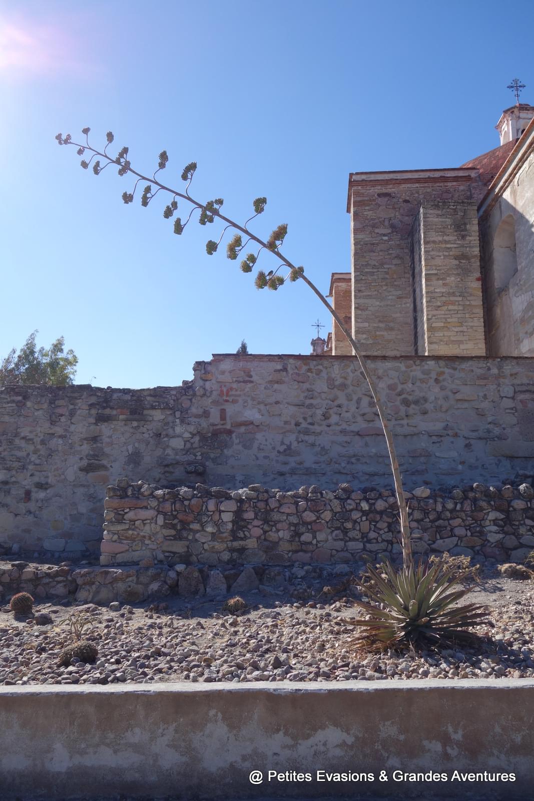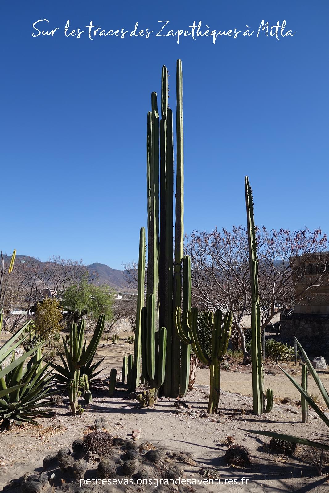 Le site archéologique de Mitla c'est aussi le paradis des cactus. Il y en a de toutes les formes et de toutes les tailles. Bien qu'hérissés de toute part, toutes ces espèces se côtoient paisiblement et offrent un beau contraste avec le gris des pierres et le bleu du ciel.