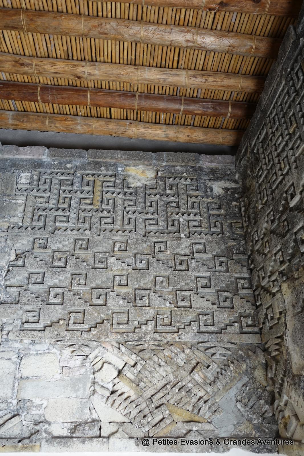 A Mitla, les grecques ornent les murs extérieurs mais également les murs intérieurs. Une des parties l’Édifice des colonnes s'appelle d'ailleurs le "Patio des Grecques", en raison de l'omniprésence de ces motifs qui ornent magnifiquement ses murs.