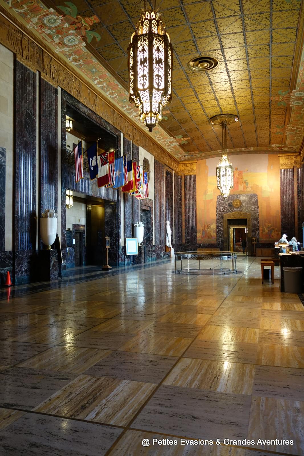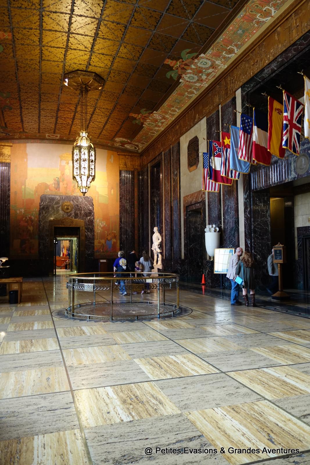 Au rez-de-chaussée, qui est habituellement le hall d'entrée du bâtiment, nous trouvons un petit guichet d'information où on nous explique comment nous rendre au 27e étage et où trouver le mur dans lequel se trouvent les impacts des balles qui ont tué le Sénateur Huey Long (c'est gentil, mais on venait pas pour ça (!)), à l'initiative de la construction du bâtiment.