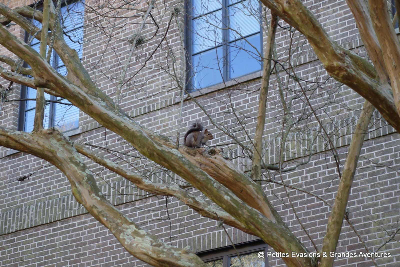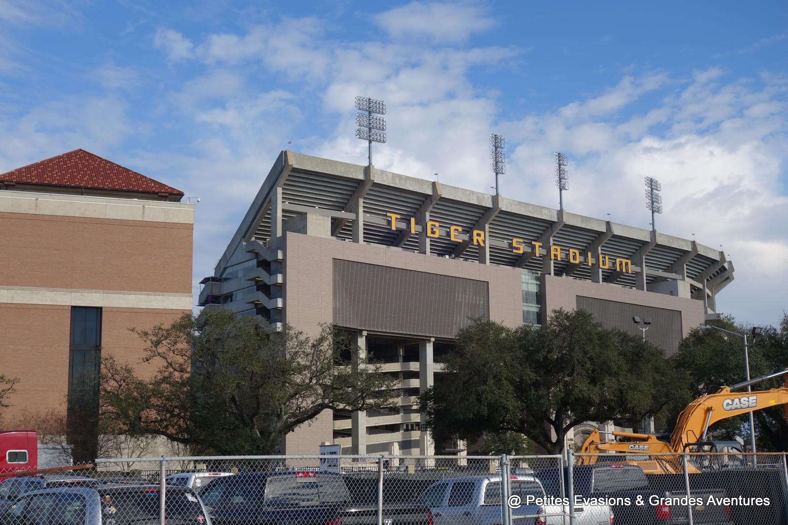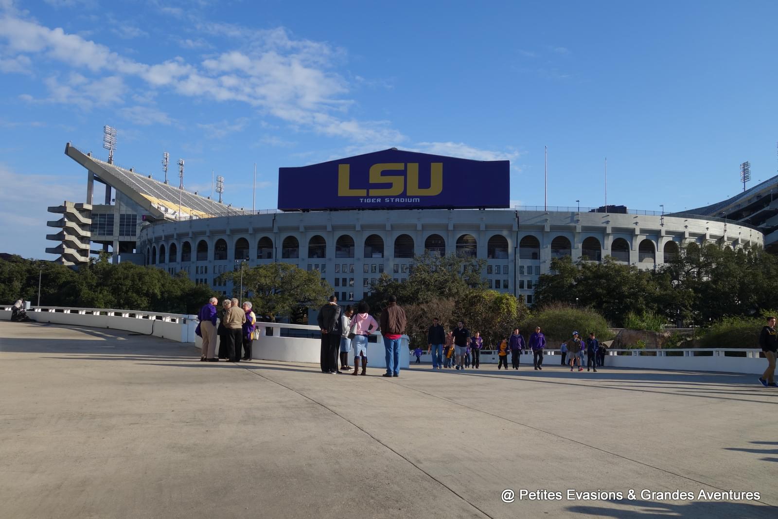 Il est possible de traverser le campus en voiture mais aussi de s'y promener à pieds et nous avons fait les deux. Pour la partie visitée à pied, nous avons opté pour la partie ouest du campus où se trouve le stade des Tigers (le club omnisports de la LSU dont l'équipe la plus célèbre est celle de football américain) et Mike the Tiger, la mascotte de l'équipe. Car oui, en plein au cœur du campus, il y a un tigre qui vit et évolue dans un enclos !