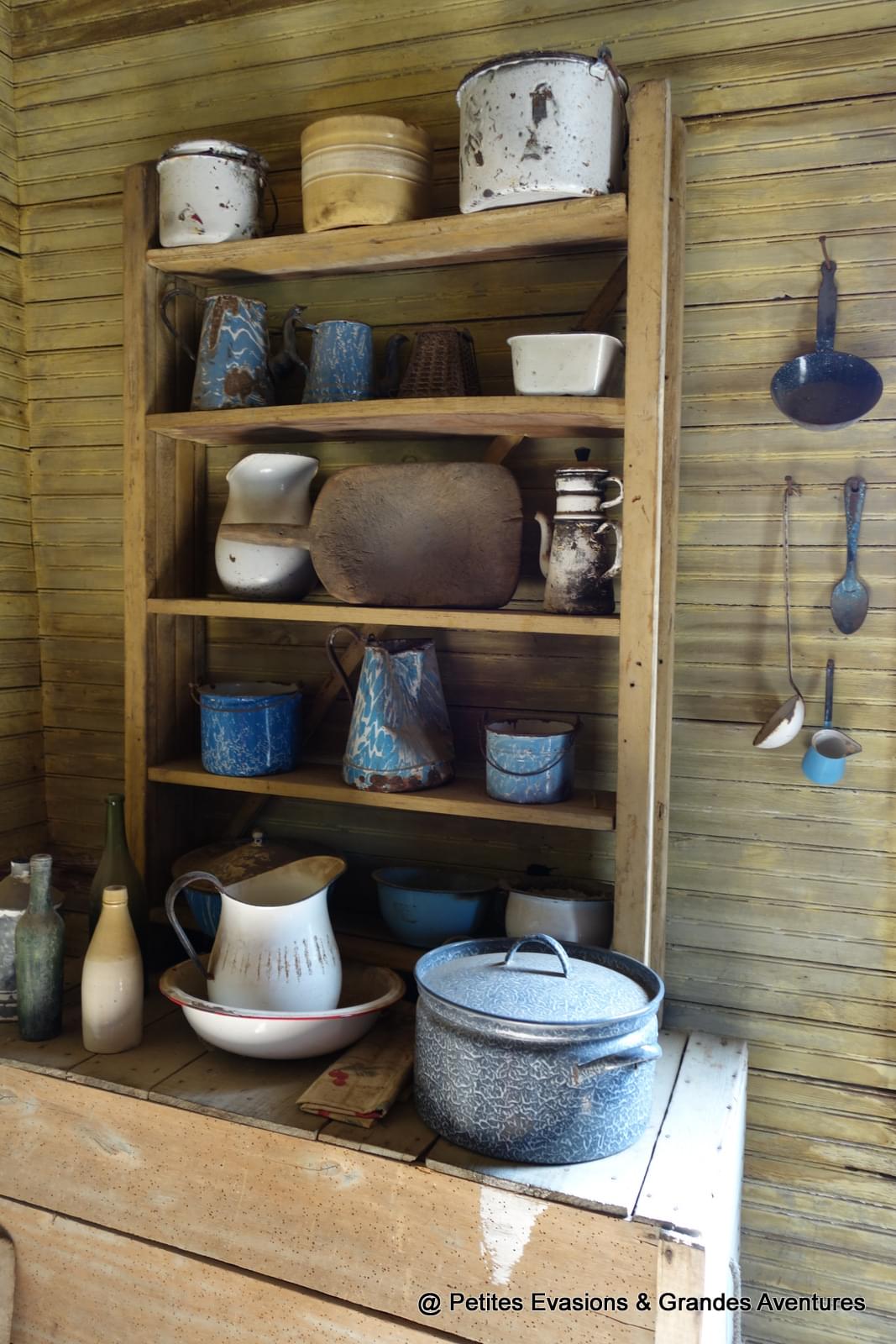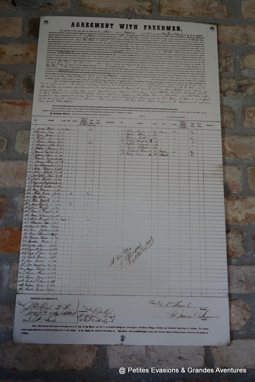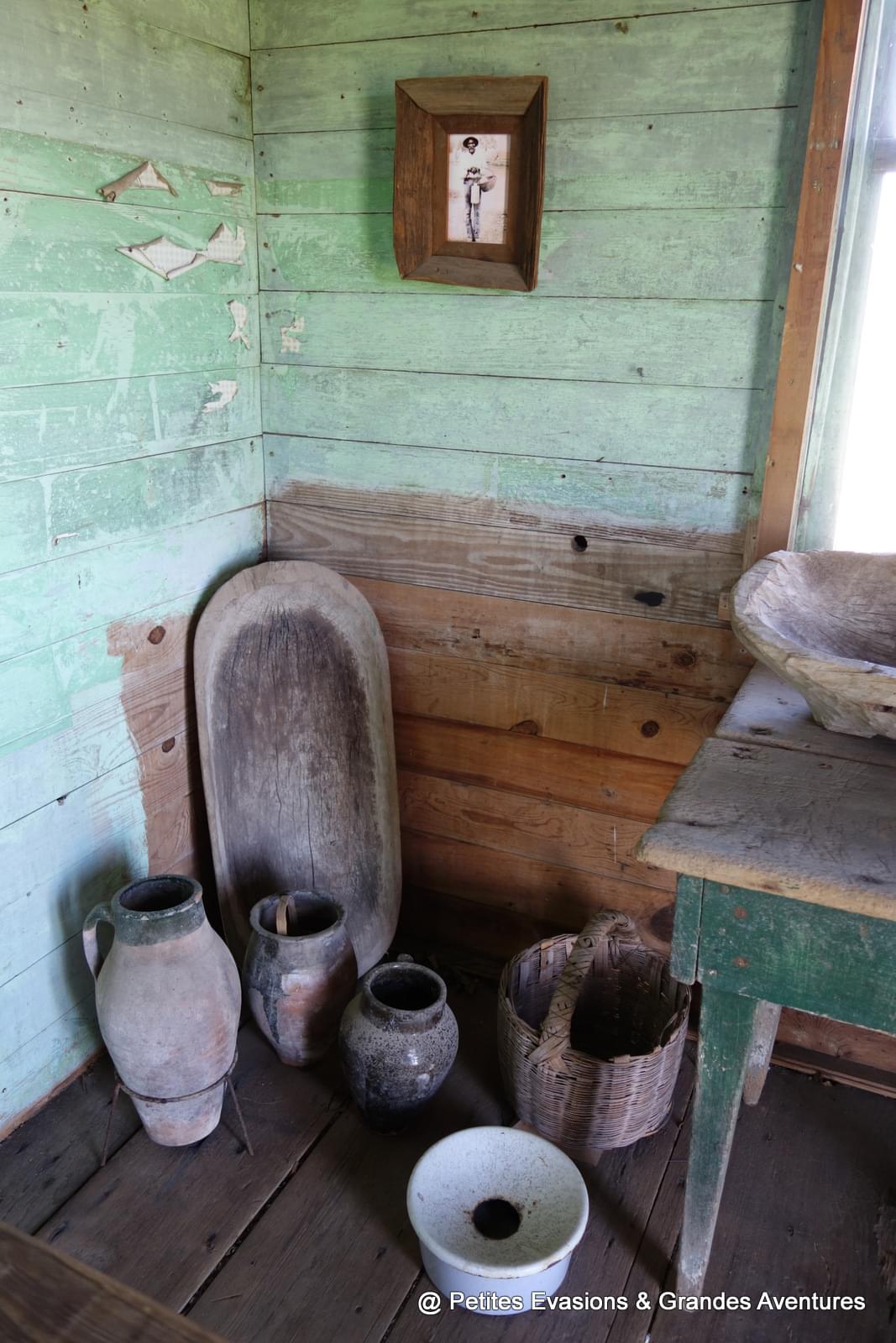 Les cabanes d'esclaves, construites elles aussi en bois, étaient généralement partagées par deux familles. Dans la cabane que l'on visite se trouve un document reprenant le nom des esclaves affranchis, l'occasion pour notre guide de nous apprendre que beaucoup, ne sachant pas quoi faire d'autre et n'ayant pas de famille en dehors, continuaient de travailler sur la plantation pour un salaire qu'ils ne pouvaient dépensaient qu'au magasin de la plantation (!) ...