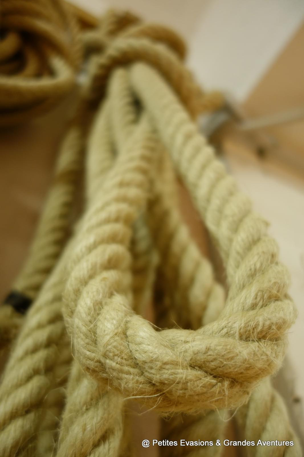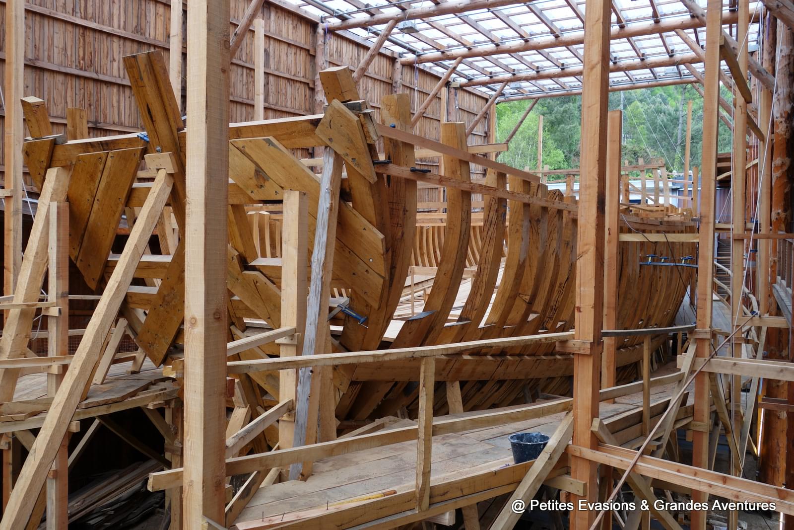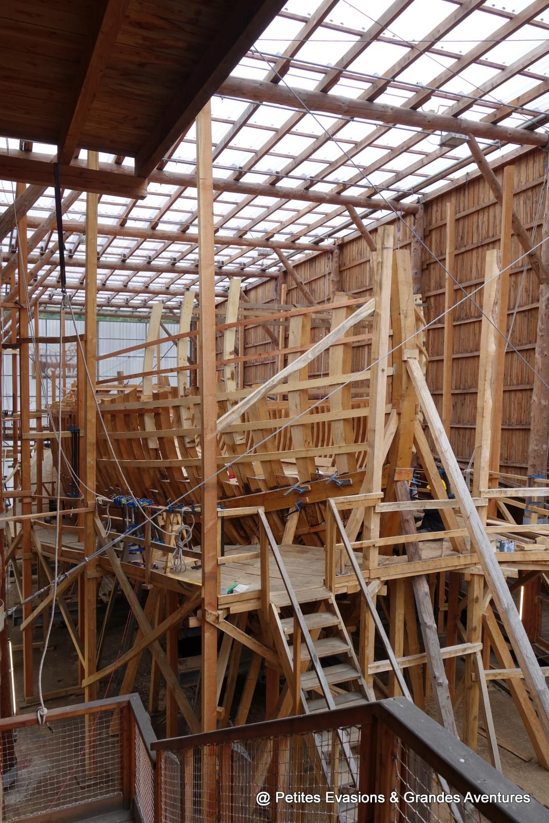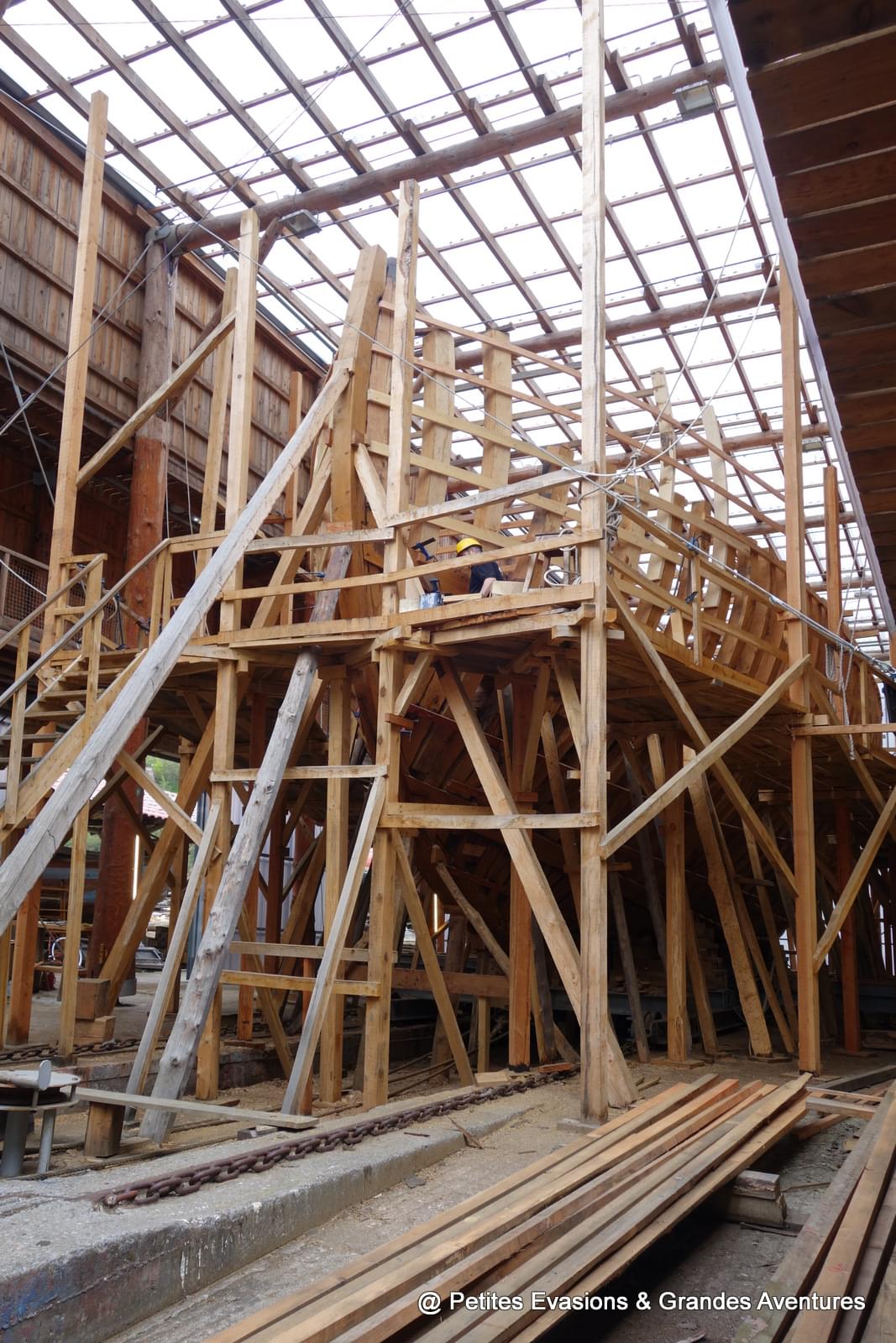 Grâce à des passerelles en bois, on peut faire le tour du baleinier. On a donc passer un long moment à admirer le travail de précision dans l'assemblage des différents morceaux de bois, une minutie nécessaire pour construire un ensemble harmonieux et solide qui un jour pourra affronter la mer sans crainte.