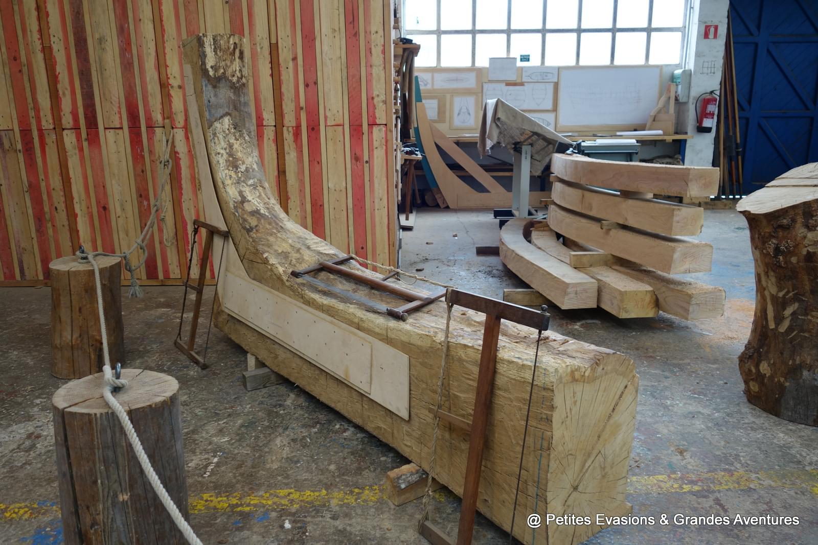 Dans cette grande salle où l'on peut regarder les artisans préparer des pièces de bois pour l'assemblage du baleinier, on retrouve des éléments présentés dans le musée. Au final, c'est comme si cet atelier remplissait un rôle de trait d'union entre le musée et le chantier, l'Histoire et le présent, la théorie et la pratique.