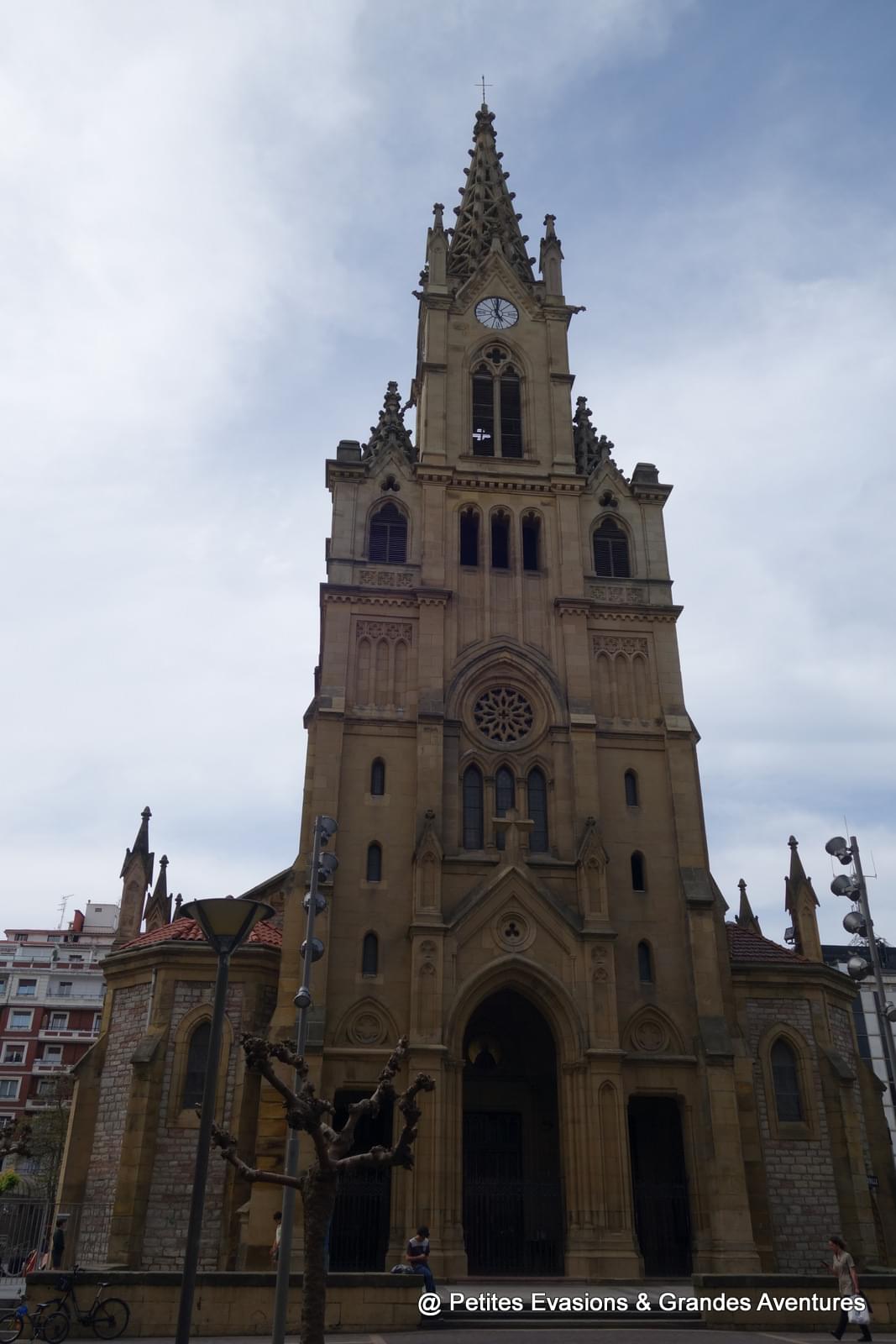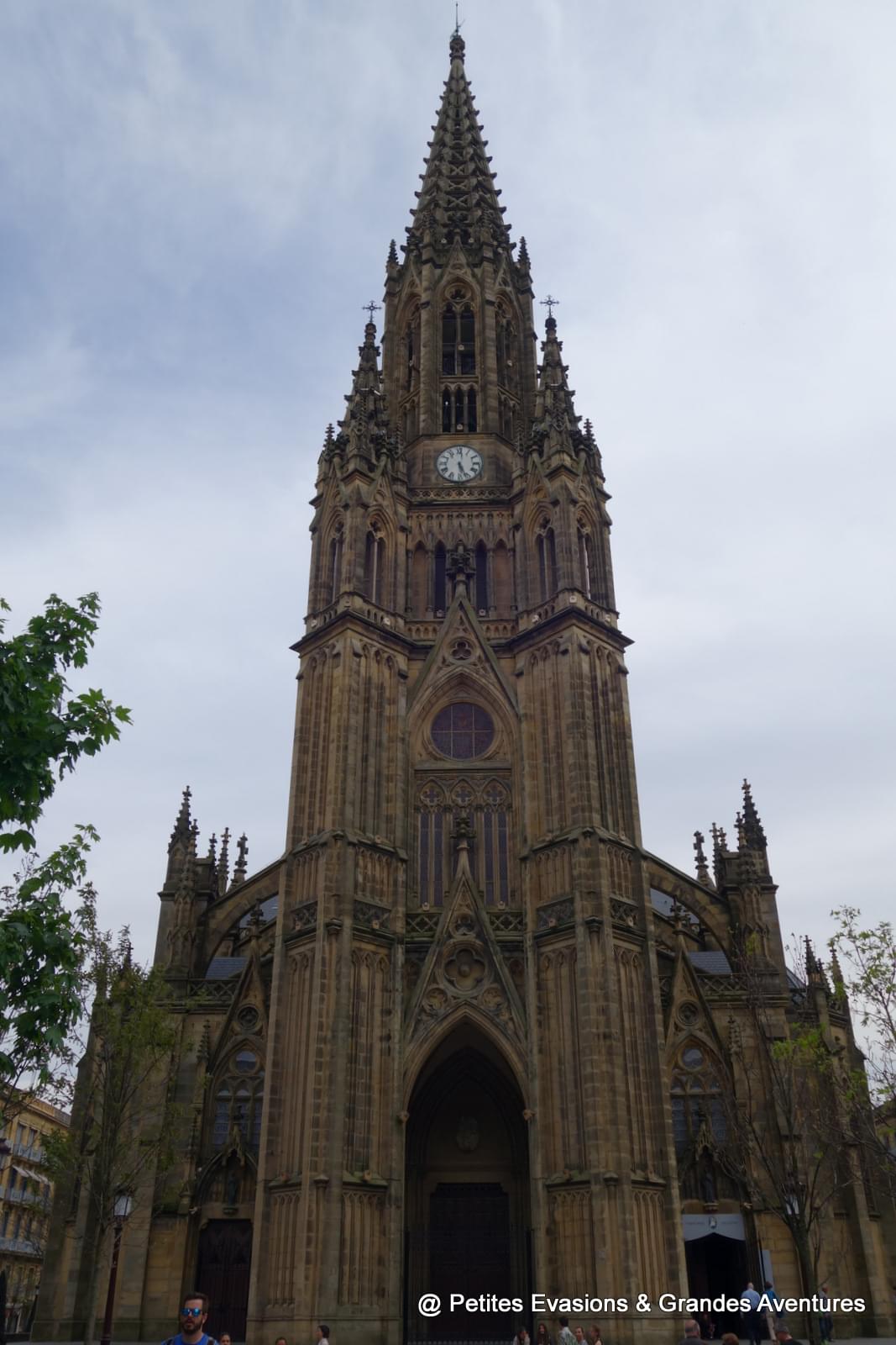 De retour sur la rive gauche de l'Urumea, on aperçoit rapidement le clocher de la Catedral del Buen Pastor de San Sebastián. Sa flèche néo-gothique dépasse fièrement de la rangée de bâtiments qui nous séparent d'elle et nous guide jusqu'à elle tel un phare.