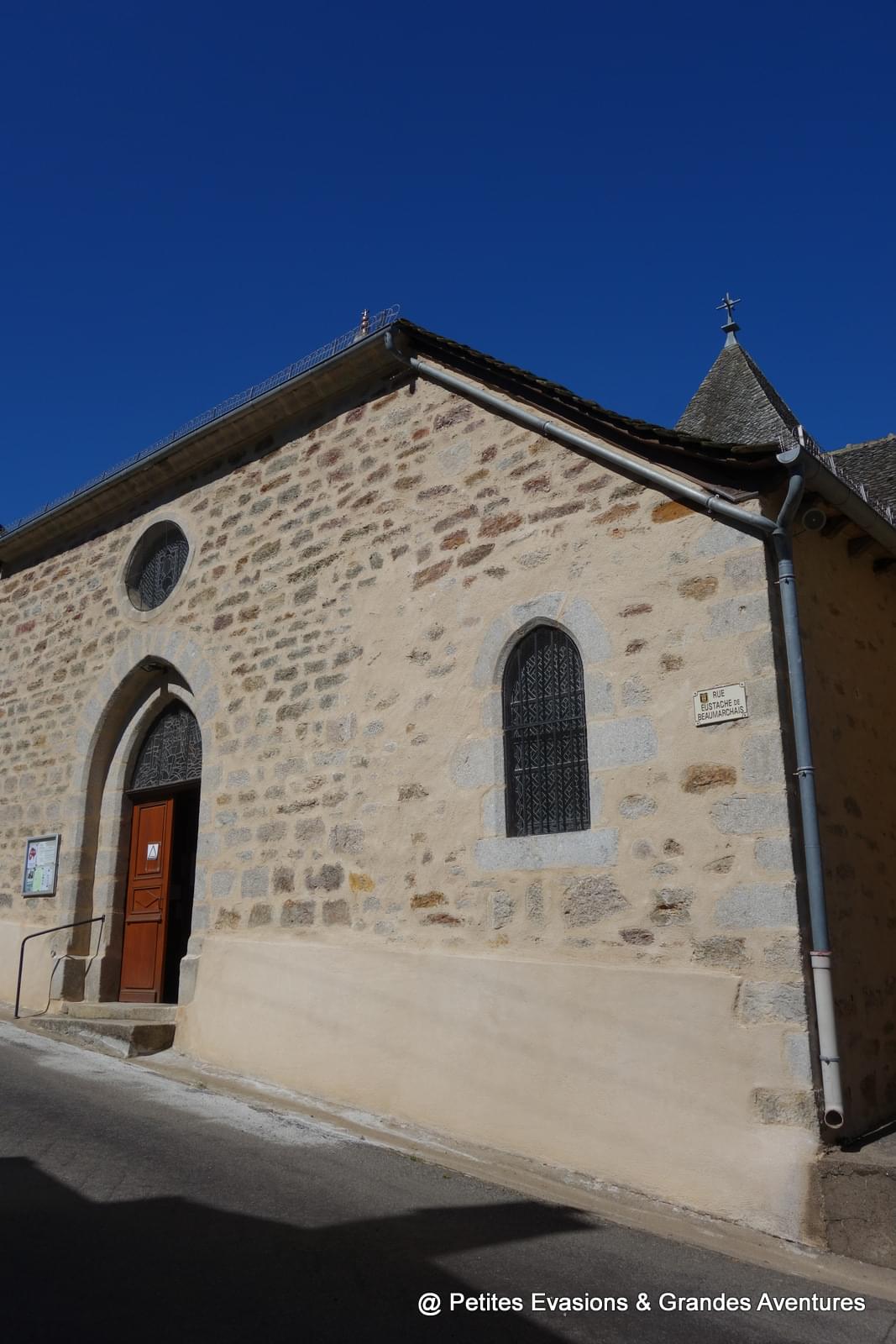 En hauteur par rapport au bourg du village, l'église Saint Barthélemy n'a pas une architecture ordinaire pour un bâtiment religieux. Vue de l'extérieur, si on ne prête pas attention au clocher recouvert lui aussi de lauzes, on pourrait passer devant sans se rendre compte qu'il s'agit d'une église. Ici pas de portail monumental à l'entrée, seulement une porte assez classique, en ogive mais sans fioritures, comme le reste de la façade.