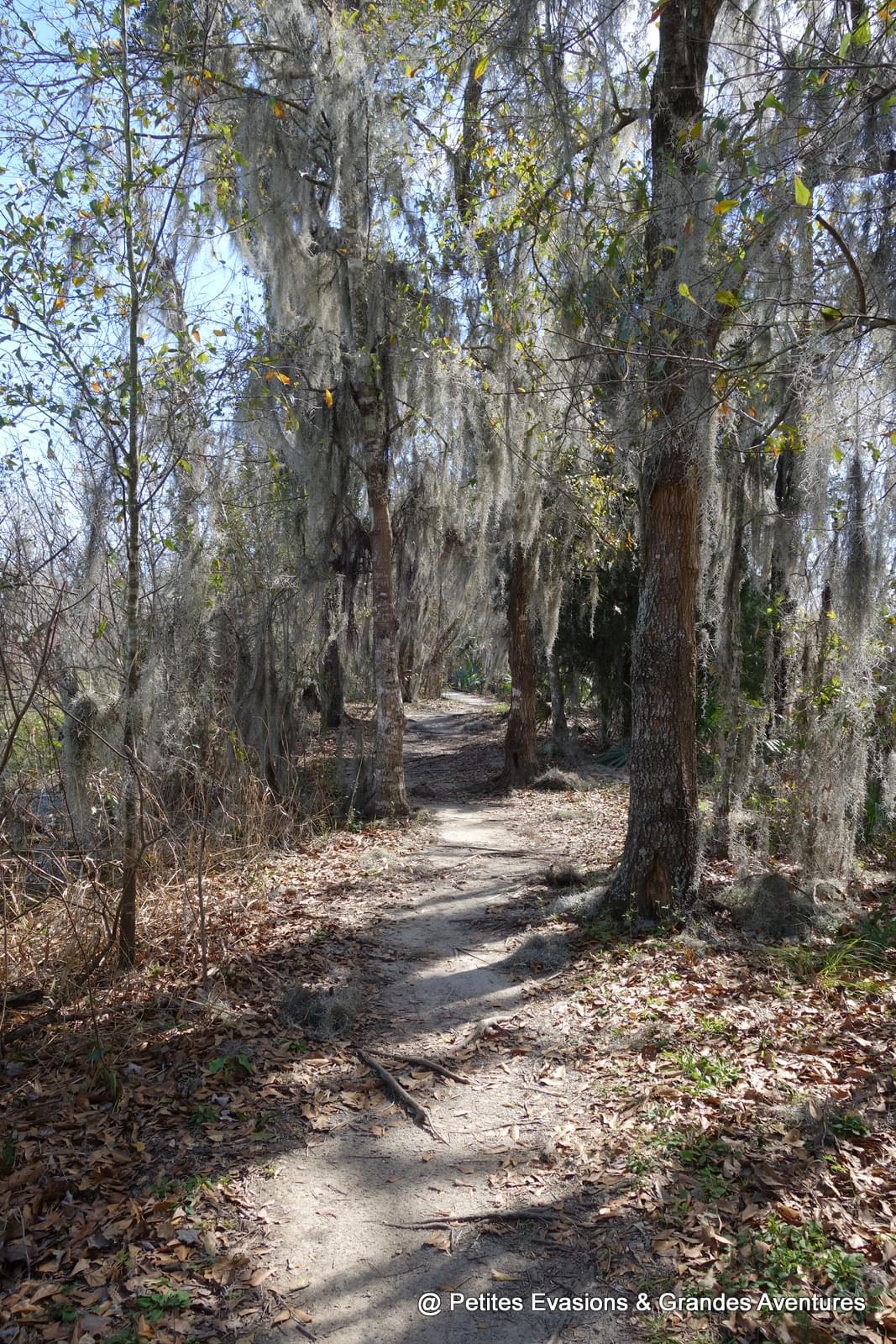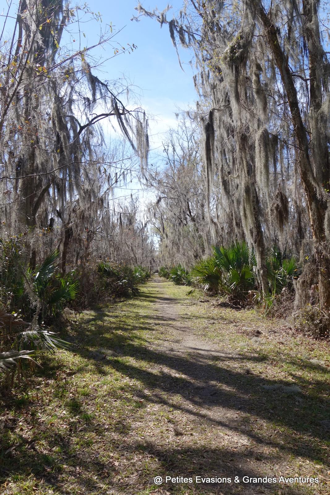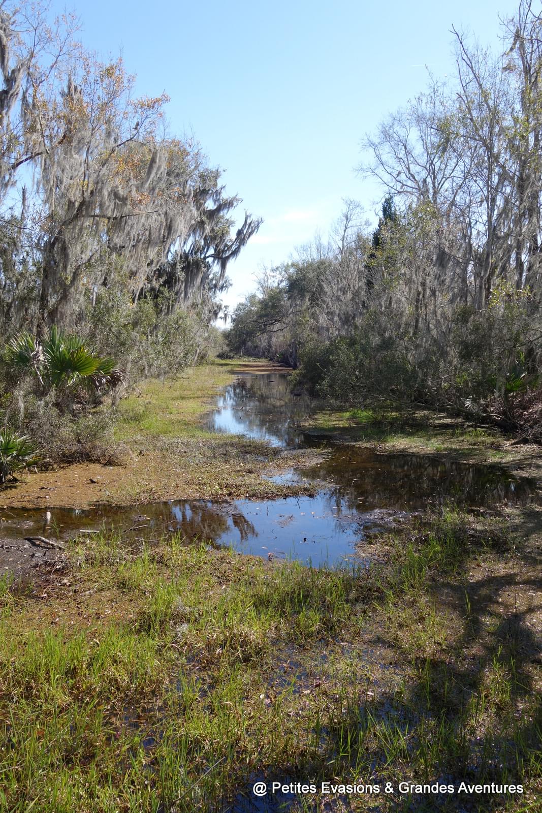 Une fois la voiture garée sur un micro-parking tout au bout de l'allée, on a continué la balade à pied, émerveillés par ce qui nous entourait. Dans ce refuge de la faune sauvage, un chemin permet de progresser à travers la flore locale qui s'en donne à cœur joie ! Mousse espagnole suspendue aux arbres, cyprès chauves et lataniers balisent le chemin en offrant une vision de carte postale louisianaise.