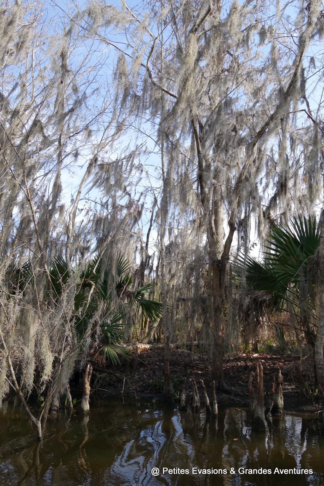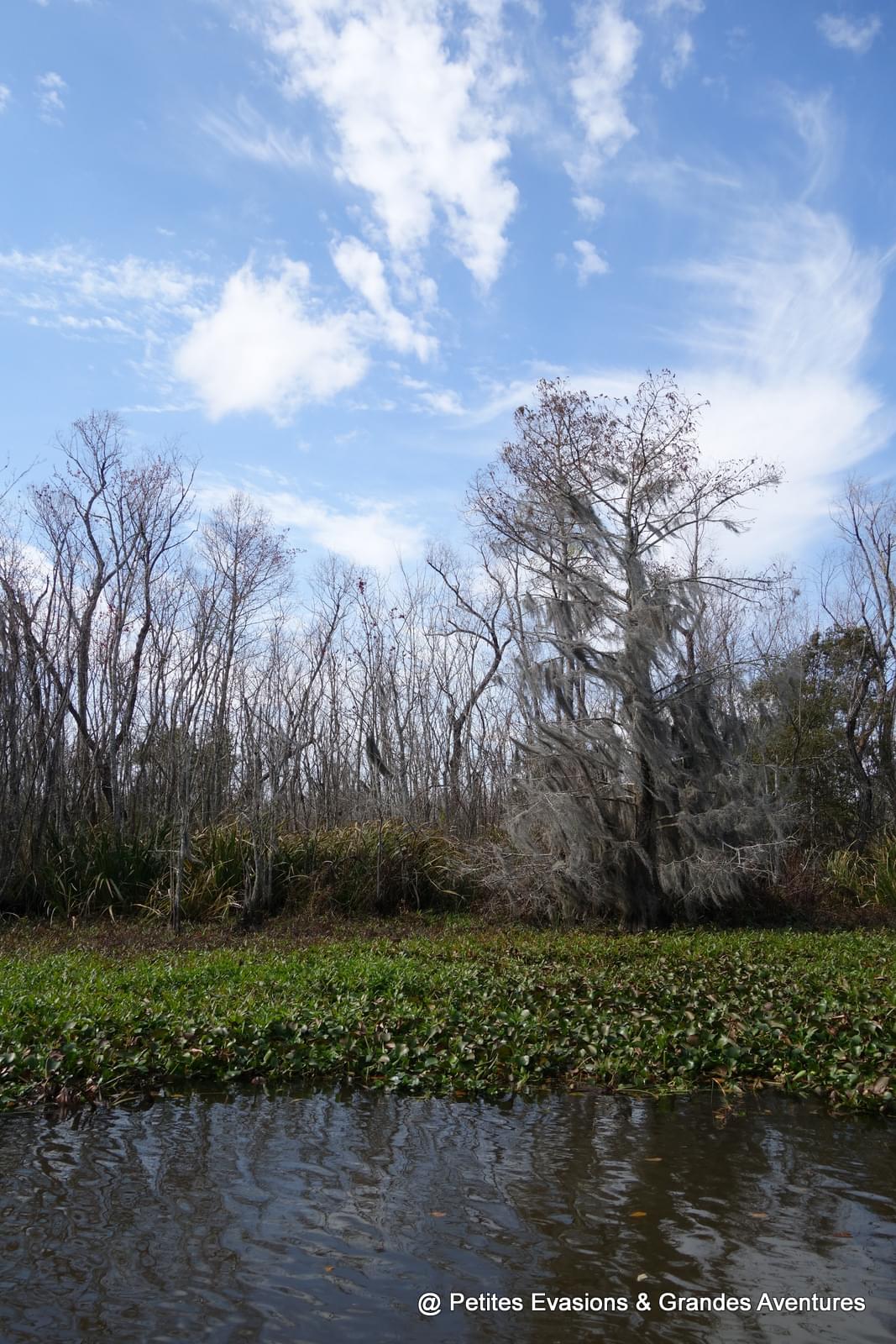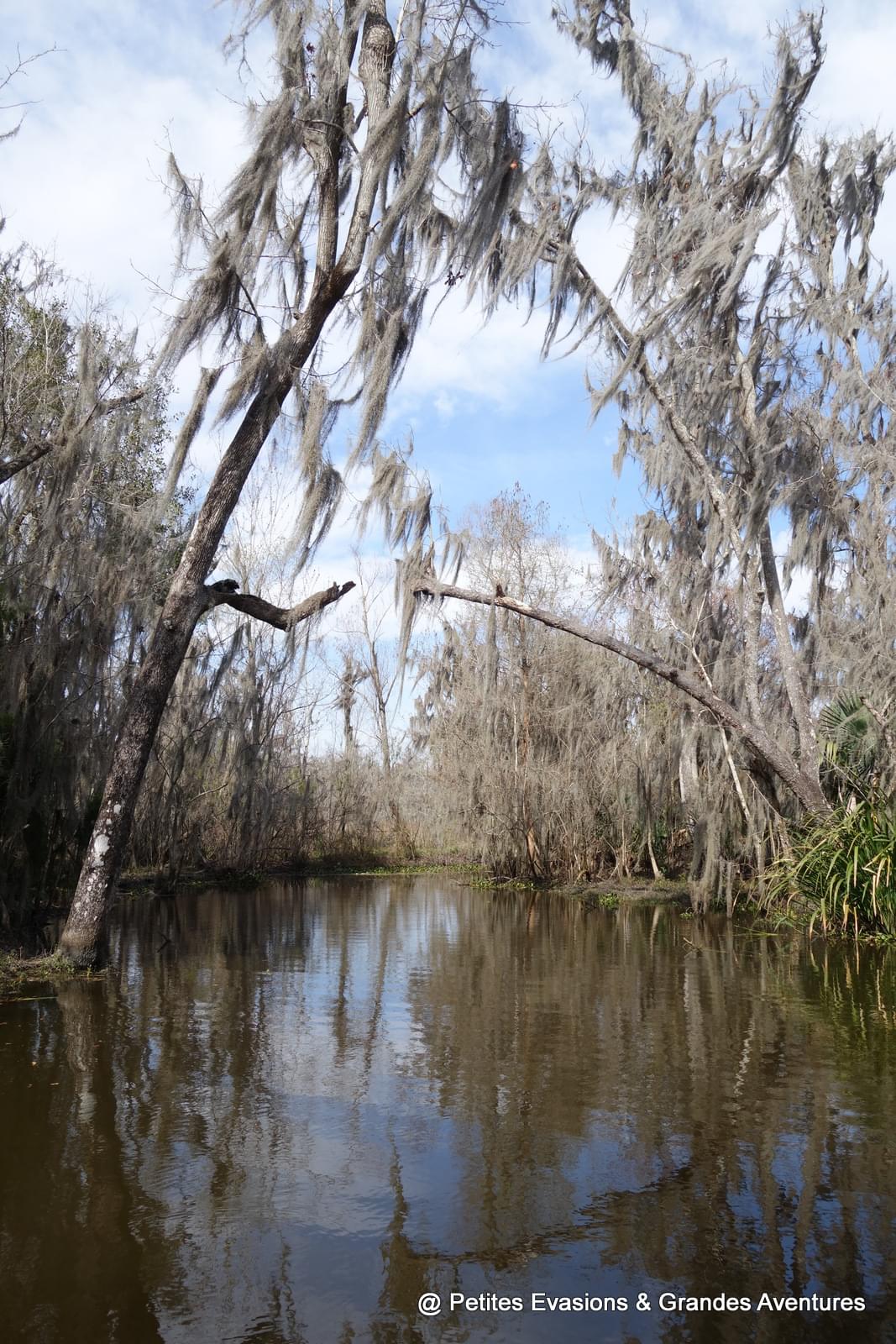 Et puis il a ralenti, la barque a glissé vers un bras d'eau moins large, les histoires et les explications ont continué, les arrêts photos aussi. Avant de nous emmener voir les alligators, Jimmy nous a montré son endroit préféré du swamp, un tout petit bras d'eau calme, paisible et magnifique, comme il y en a sûrement des dizaines mais voilà, celui-là, il l'adore. On est resté quelques minutes à observer son petit coin de paradis, charmés nous aussi par la beauté de l'endroit.