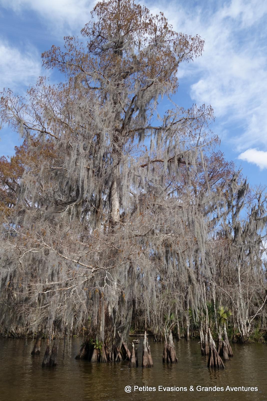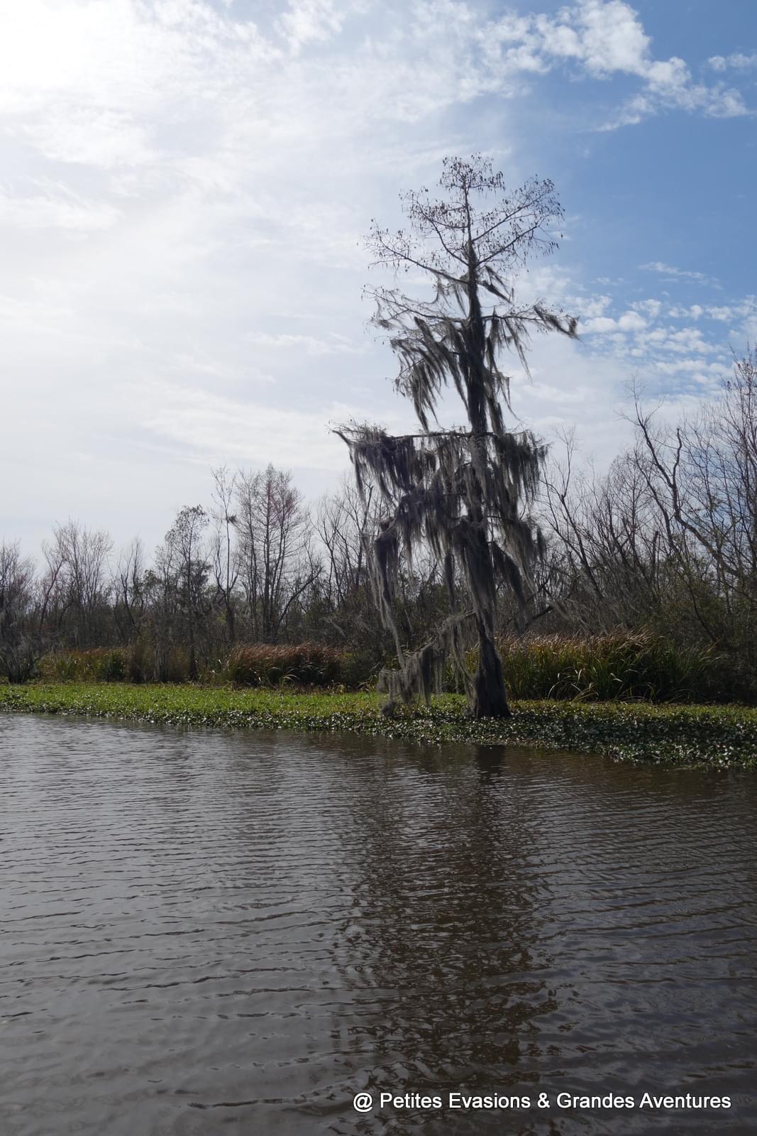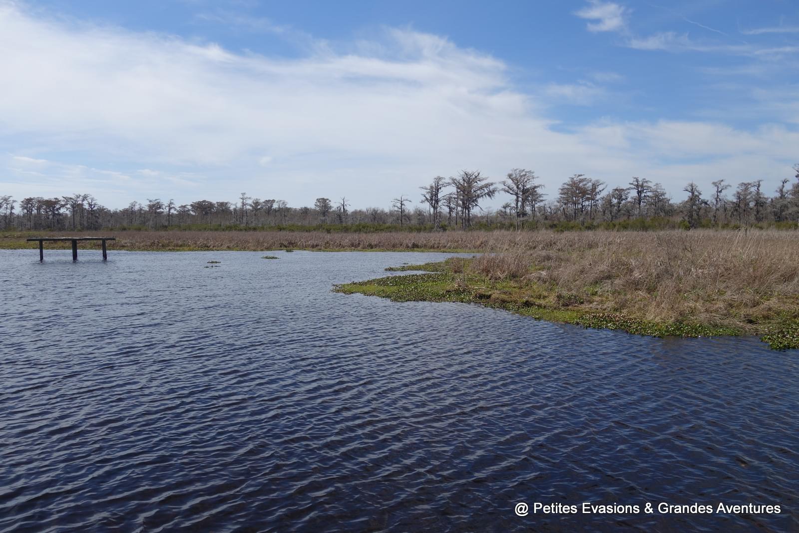 Et puis il a ralenti, la barque a glissé vers un bras d'eau moins large, les histoires et les explications ont continué, les arrêts photos aussi. Avant de nous emmener voir les alligators, Jimmy nous a montré son endroit préféré du swamp, un tout petit bras d'eau calme, paisible et magnifique, comme il y en a sûrement des dizaines mais voilà, celui-là, il l'adore. On est resté quelques minutes à observer son petit coin de paradis, charmés nous aussi par la beauté de l'endroit.