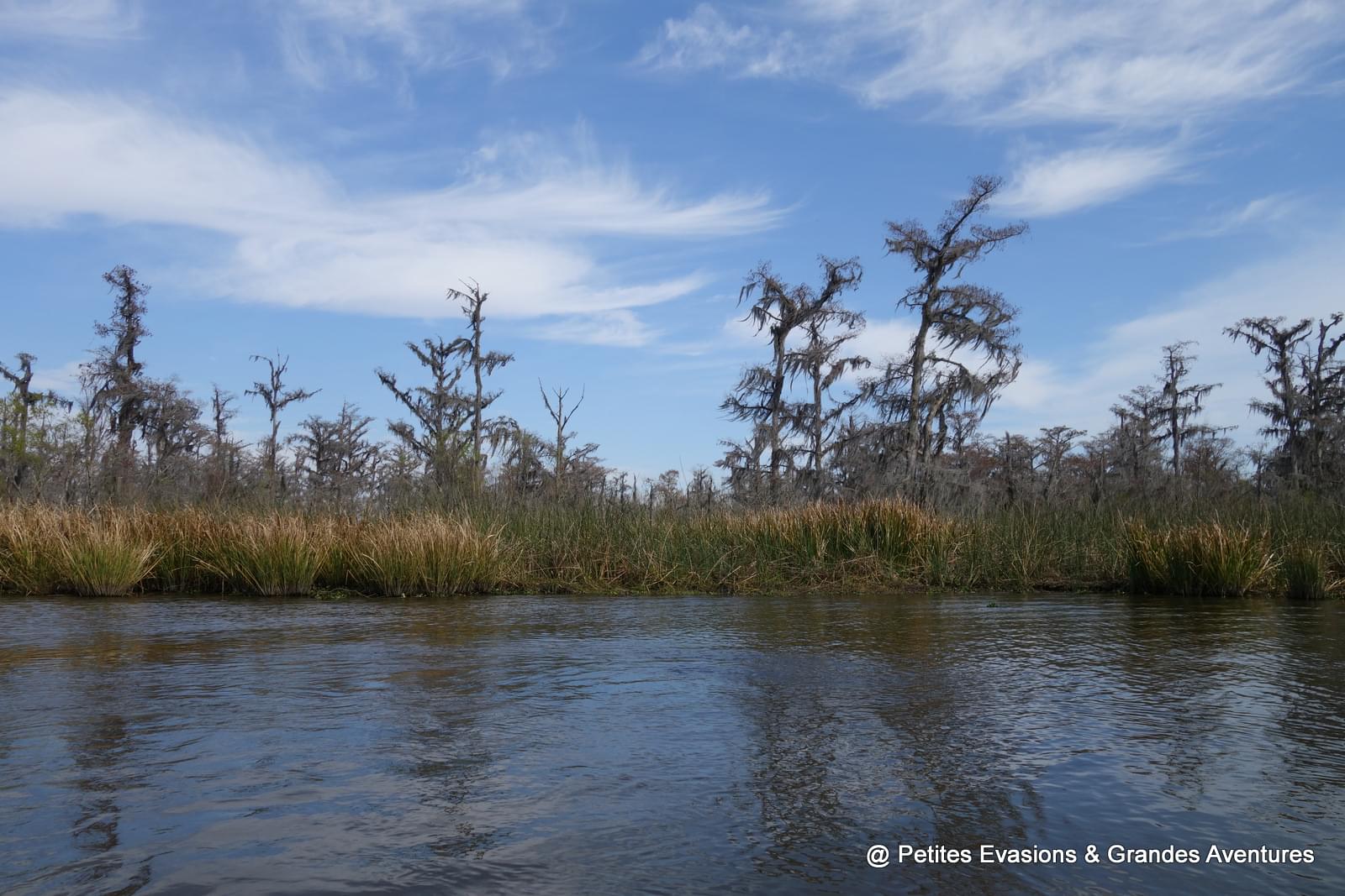 A chaque fois qu'il apercevait un oiseau ou un arbre particulier, Jimmy s'arrêtait pour nous expliquer, raconter une histoire, laisser du temps pour prendre une photo. On a fini par rejoindre un plus grand bras d'eau, dans lequel notre embarcation a filé, tapant sur l'eau avec un bruit sourd, régulier ; le bruit du moteur et du vent couvraient un peu la voix de Jimmy qui continuait, imperturbable à nous raconter son swamp adoré.
