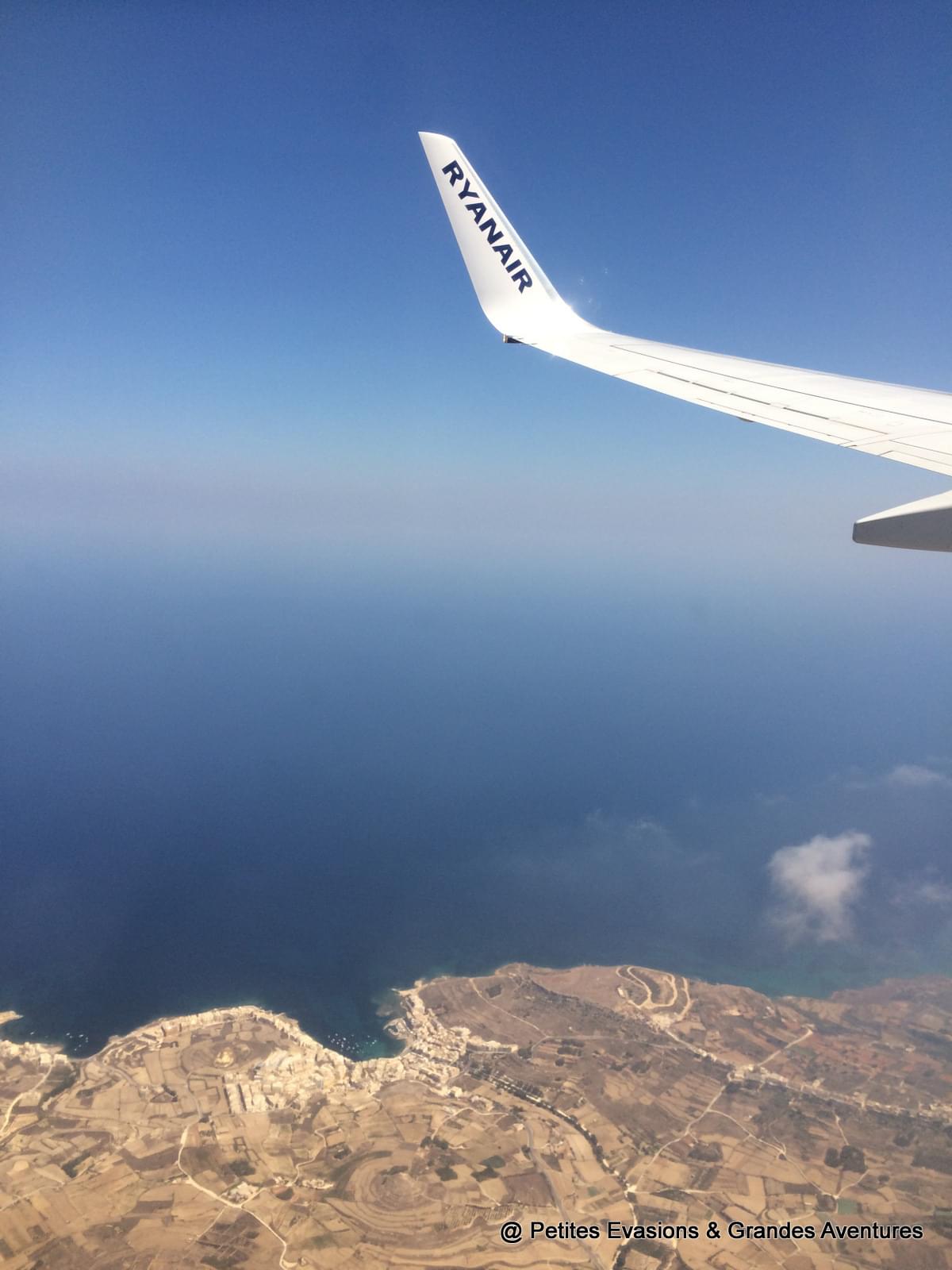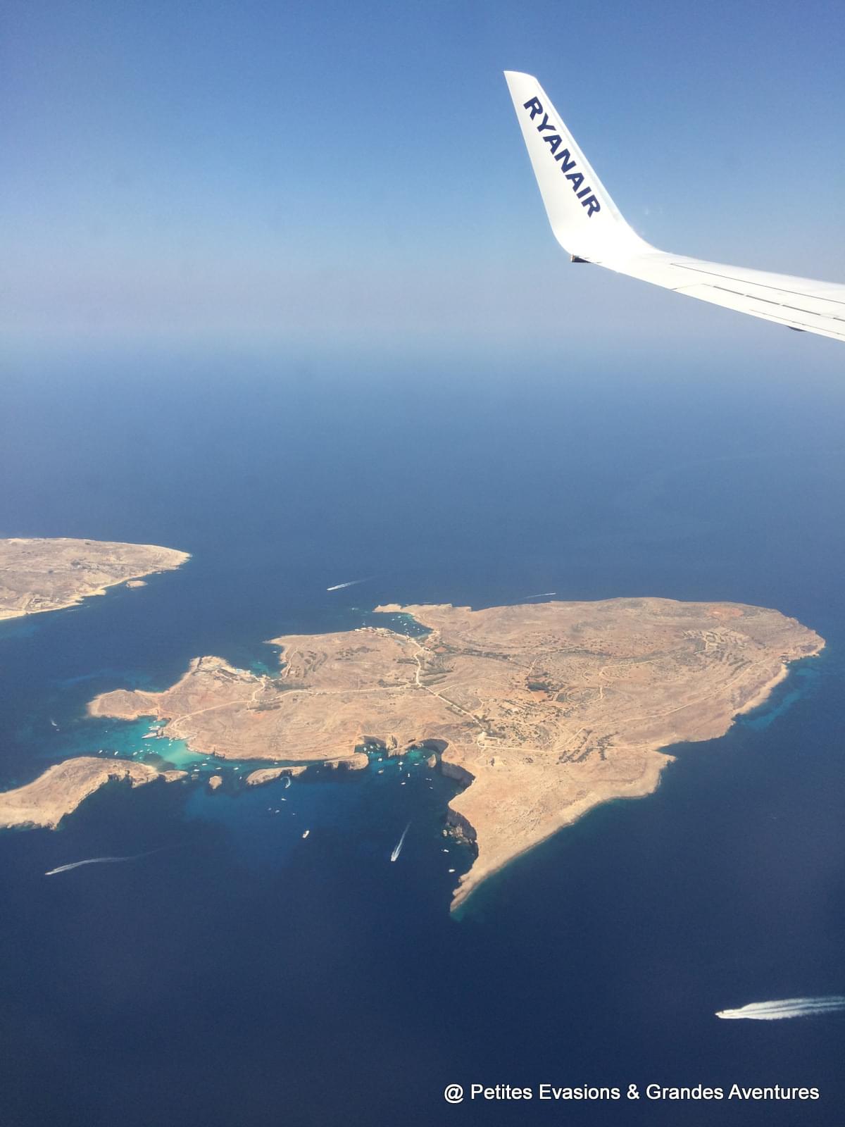 Déjà, depuis l’avion et le ciel, la couleur cuivrée des terres arides de Gozo et Comino se détachant du bleu de la mer m’a impressionnée. Et puis, en allant vers l'est, une touche de bleu turquoise, coincée entre Comino, Cominotto et un bleu plus sombre est venu chatouiller mes yeux émerveillés : nous survolions l'emblématique Blue Lagoon.