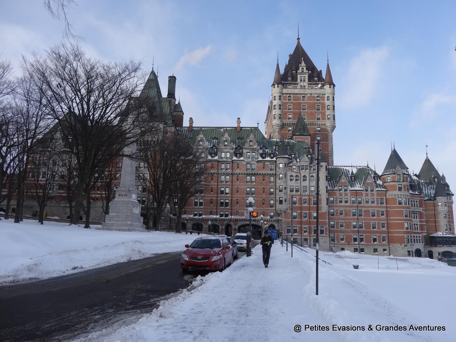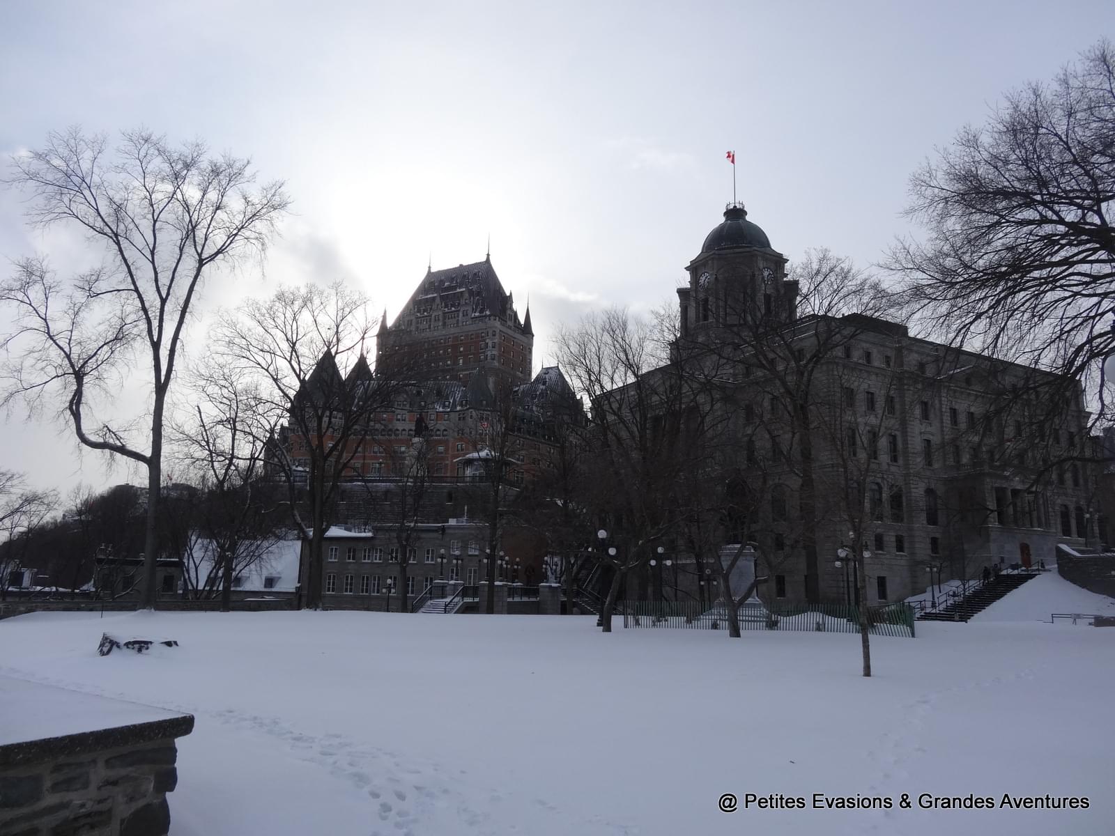 Depuis la Côte de la Montagne, nous apercevions déjà notre objectif, le Château de Frontenac, magnifique et imposant, qui se dressait, fièrement, plus haut que tous les autres bâtiments de la ville. Après un petit arrêt au Montmorency Park National Historic Site (qui a été le site de l'évêché puis du Parlement du Canada-Uni) pour regarder le Saint-Laurent gelé et la vue sur Lévis, nous sommes finalement arrivés aux pieds du Château de Frontenac.