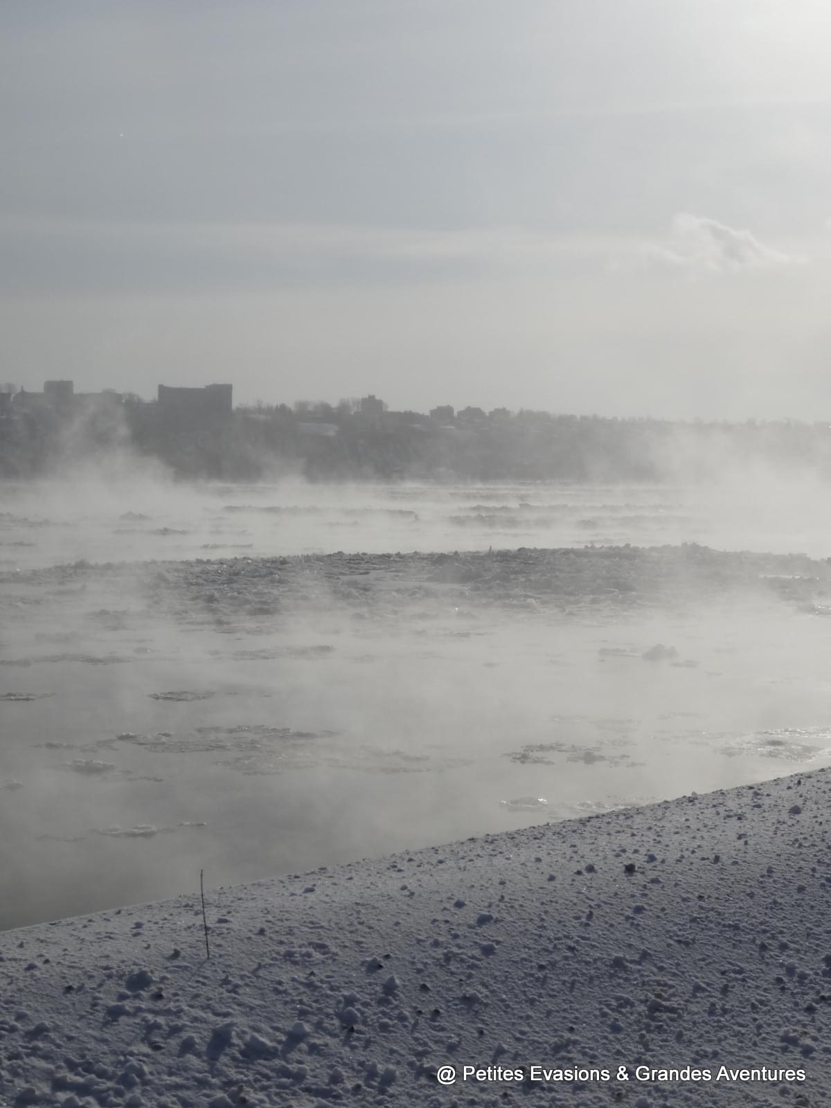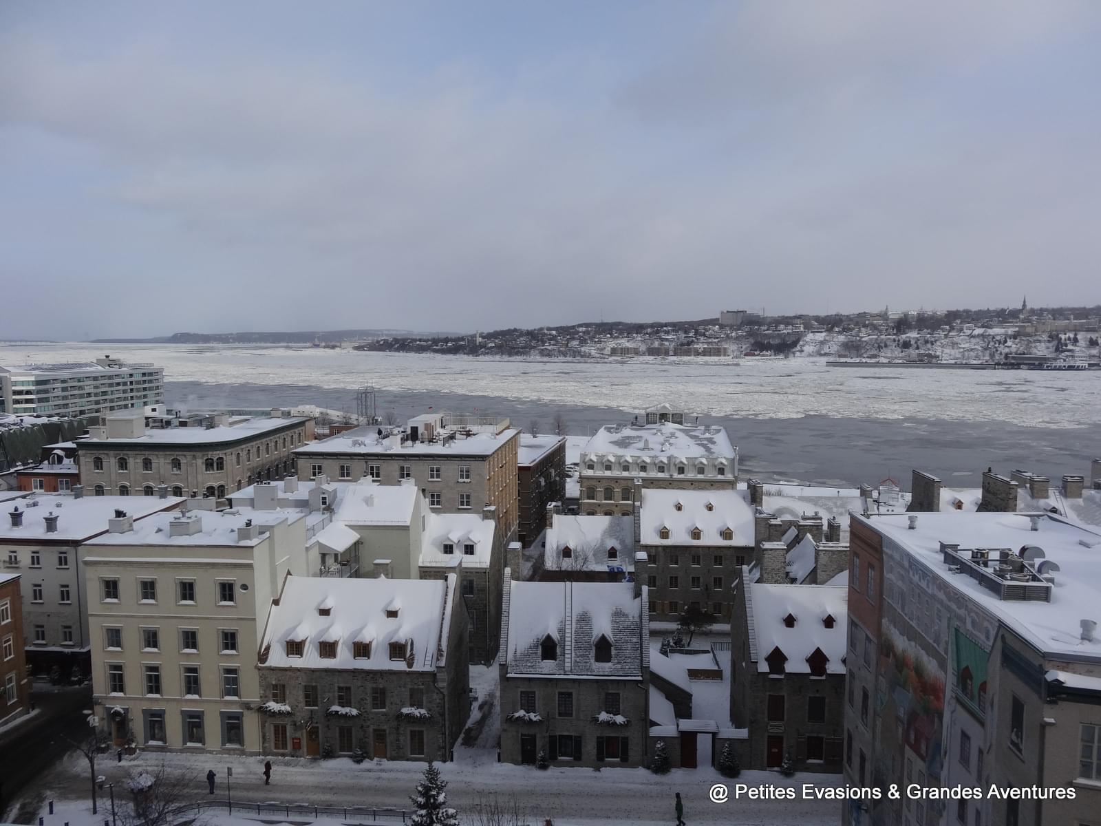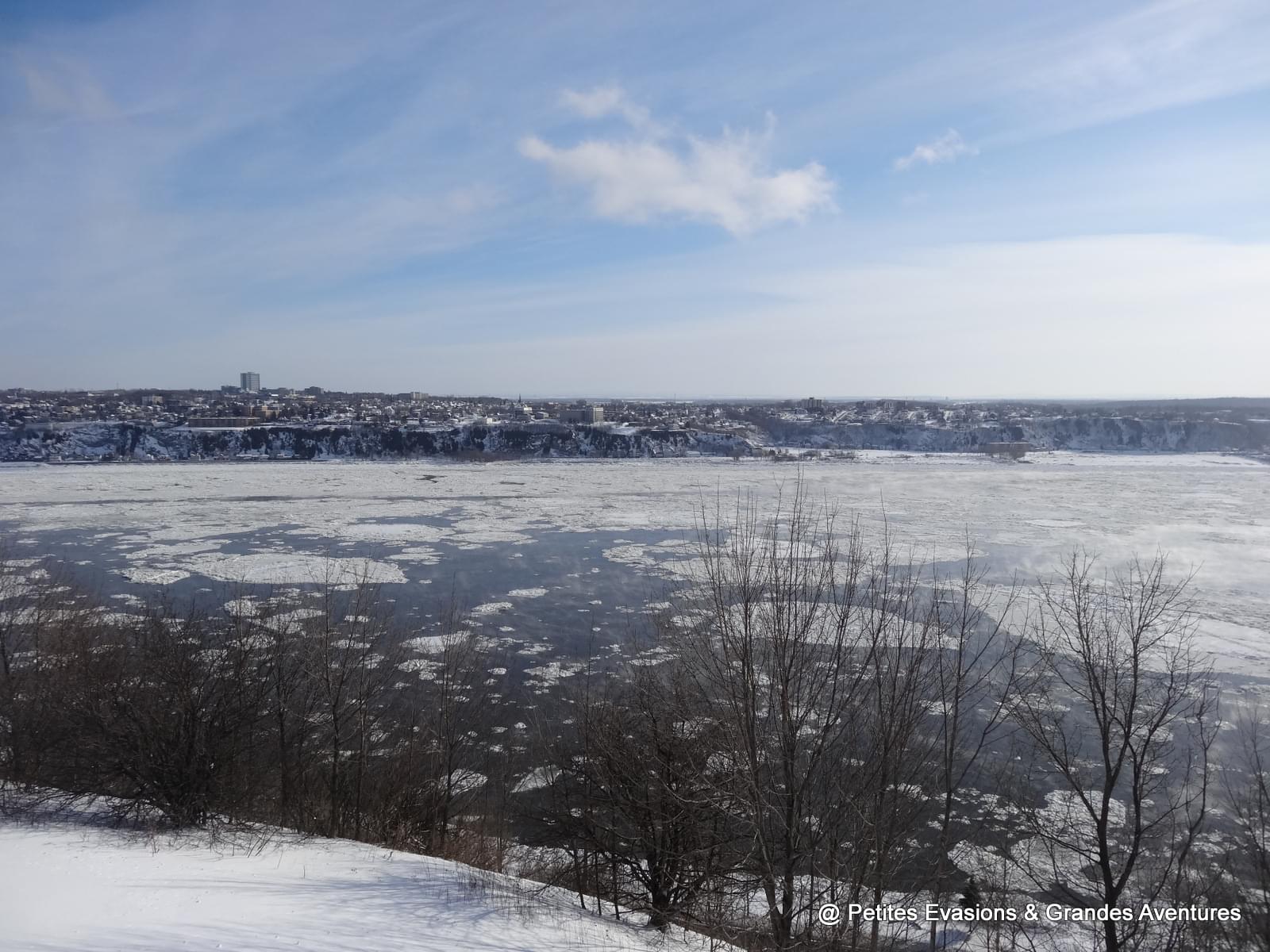 Depuis les Plaines d'Abraham, nous avons pu observé un long moment le Saint-Laurent gelé et le ballet des bateaux qui y circulaient quand même, parfois difficilement. Dans notre dos, la silhouette de la ville se dessinait et dépassait parfois des collines enneigées du parc.