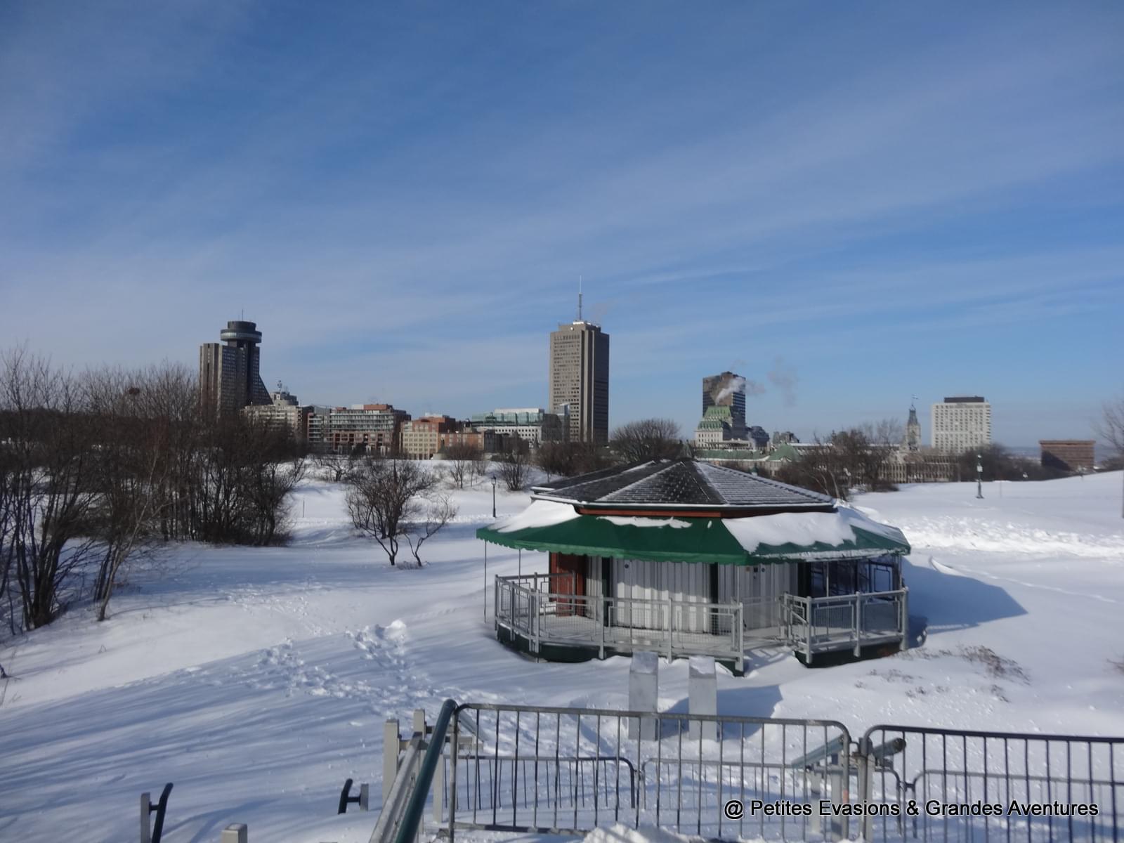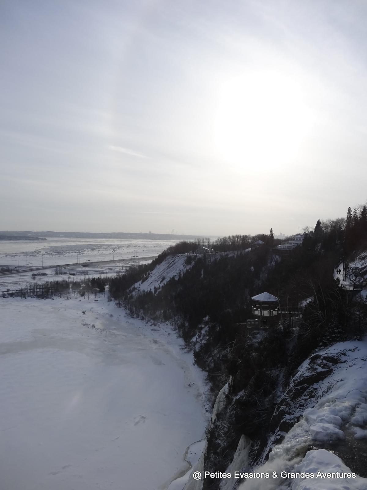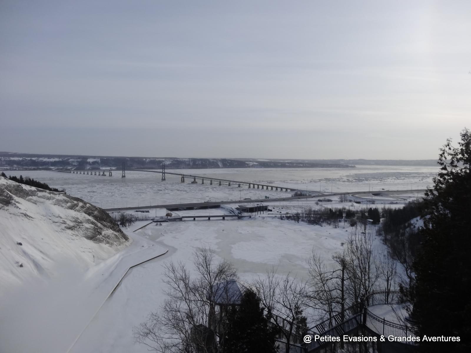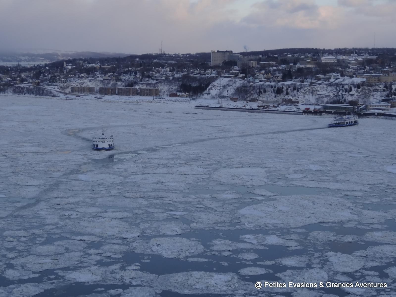 Depuis les Plaines d'Abraham, nous avons pu observé un long moment le Saint-Laurent gelé et le ballet des bateaux qui y circulaient quand même, parfois difficilement. Dans notre dos, la silhouette de la ville se dessinait et dépassait parfois des collines enneigées du parc.
