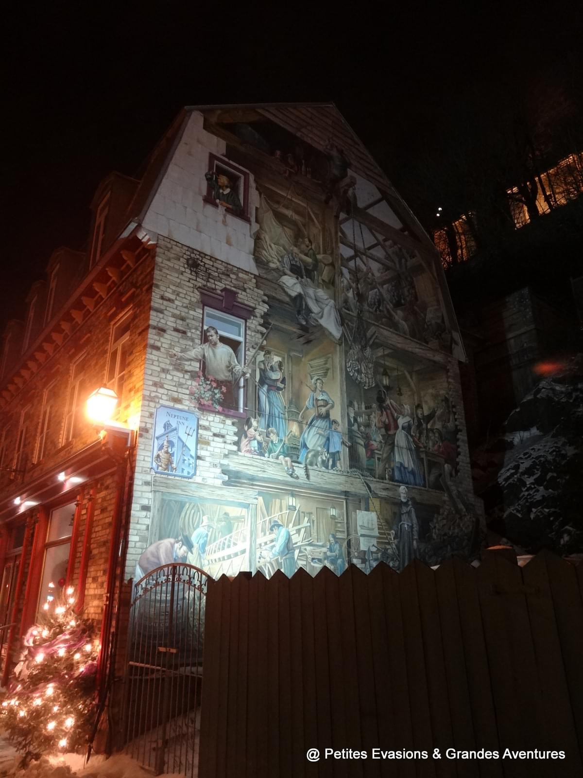 Curieux de voir de plus près le célèbre et emblématique Château de Frontenac, nous avons ensuite rejoint la partie haute de la ville, en empruntant la Côte de la Montagne pour voir la Fresque des Québecois. Inaugurée en 1999, cette fresque de 420 mètres carrés (!) est un trompe-l’œil qui raconte 400 ans de l'histoire de la ville. On y voit des personnalités importantes et des monuments emblématiques de Québec.