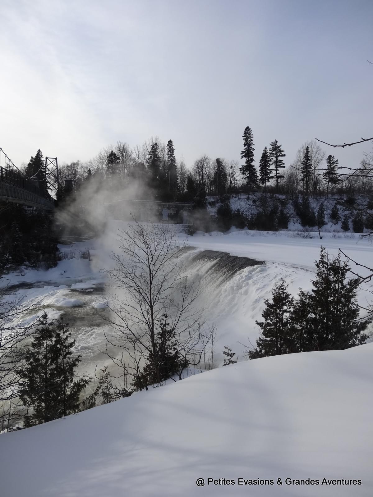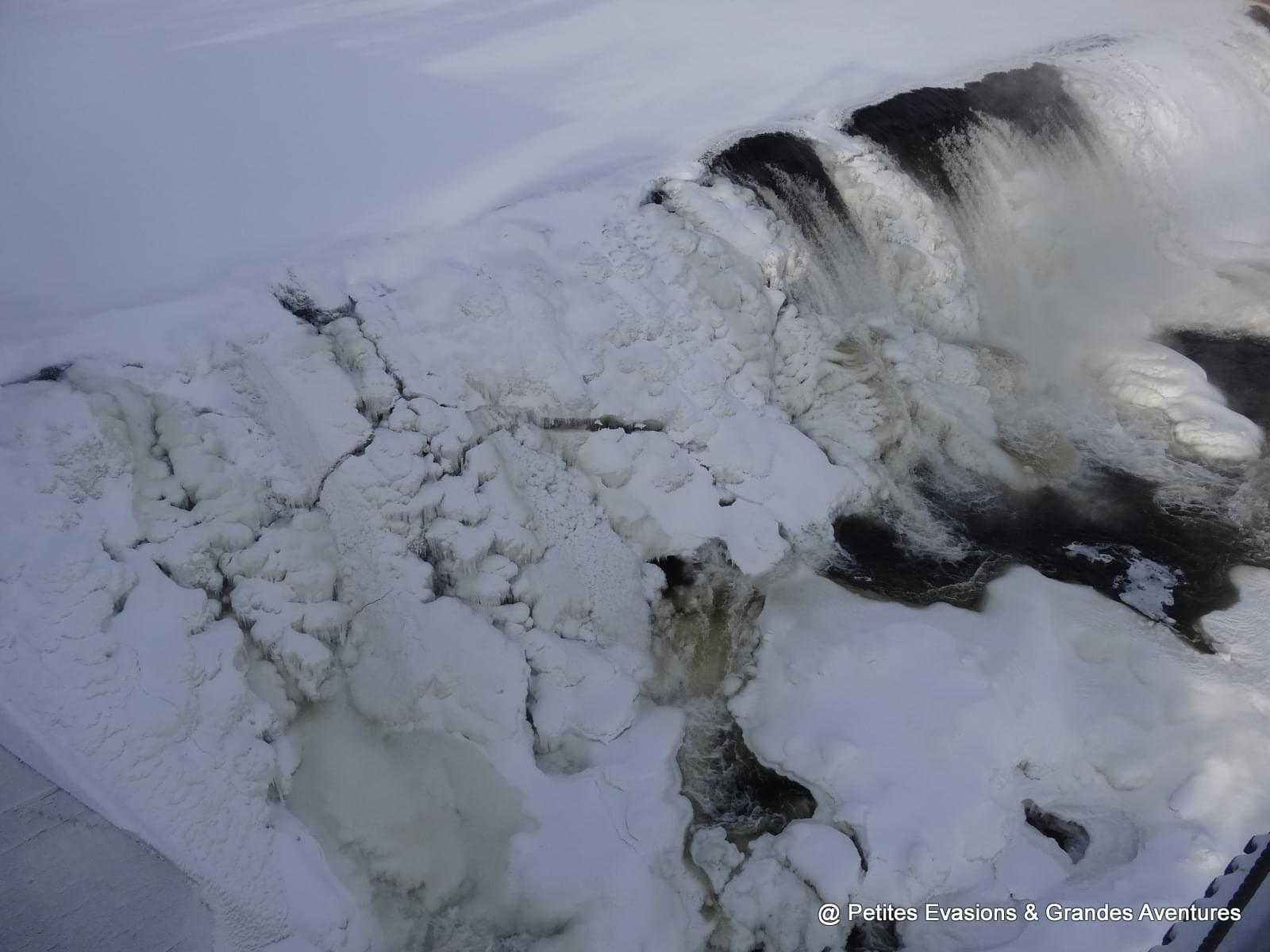 Nous traversons le pont qui enjambe la chute assourdis et abasourdis par le bruit de la Chute et tout la force qui s'en dégage. Malgré le froid et la glace qui paralyse une partie de son eau, la Chute s'écoule, impressionnante, puissante. Le contraste entre l'eau, presque noire, et la glace, immaculée, est saisissant ; celui entre la force de l'eau et l'immobilité de la glace l'est tout autant.