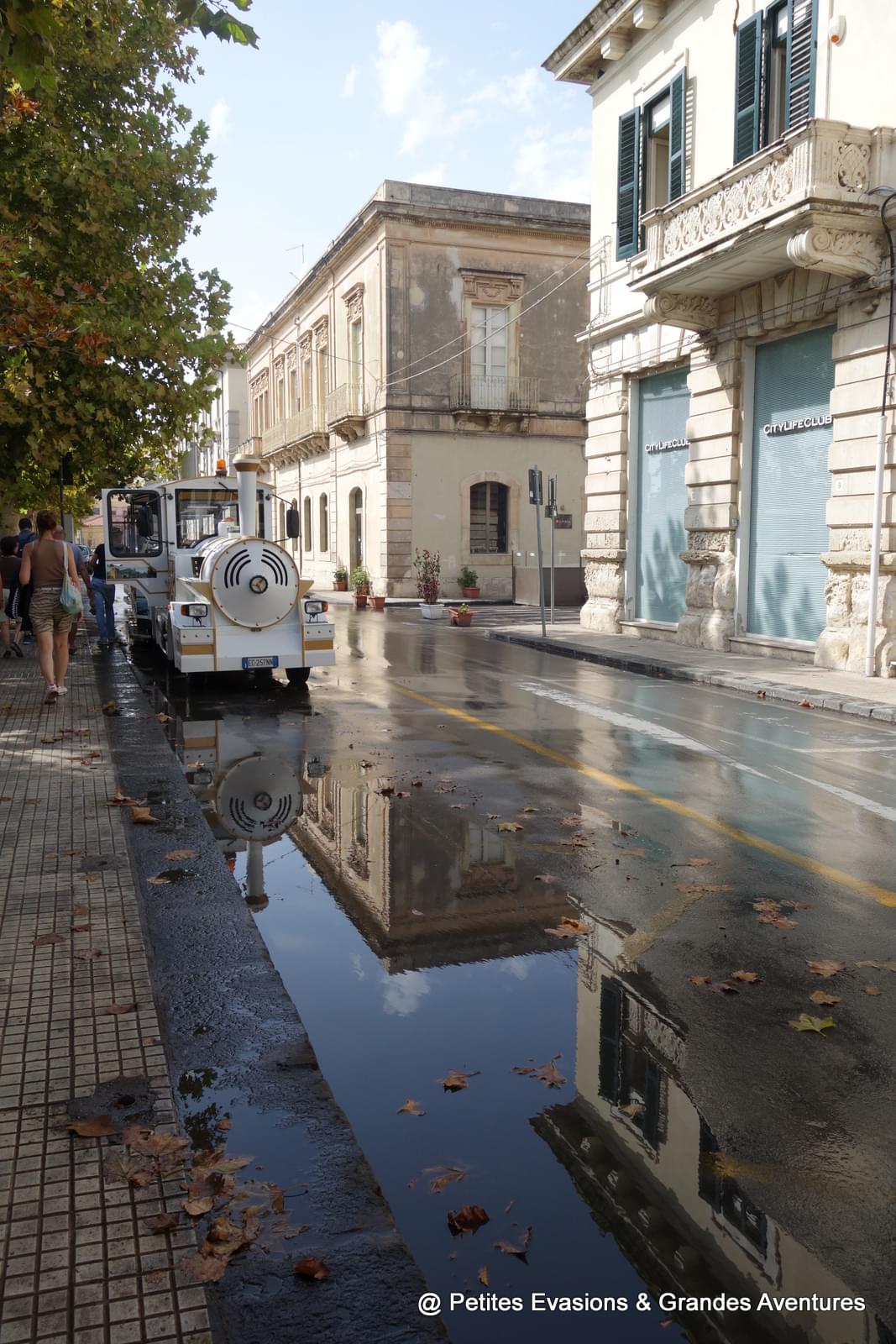 Dans les rues de Syracuse, quelques grandes flaques baignent les trottoirs et la route, souvenirs de la journée pluvieuse de la veille. Les nuages sont moins nombreux ici et le soleil commence à réchauffer doucement la ville.