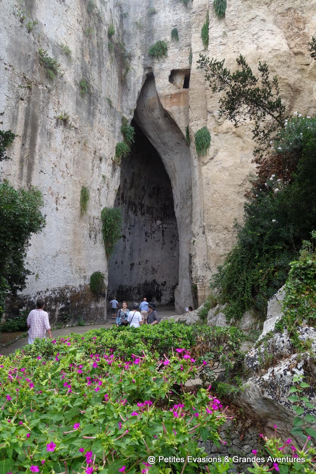 Dans ce jardin arboré se trouve aussi une grotte artificielle, emblématique du site et sujet de nombreux peintres : l’Orecchio di Dionisio. Elle doit d'ailleurs son nom au peintre Caravaggio qui trouve à cette grotte en forme de S, longue de 65 mètres et haute de 23 mètres environ, une ressemblance avec une oreille. La référence à Dionisio, tyran du 4e siècle avant notre ère, vient, elle, du fait que ce-dernier emprisonnait ses ennemis dans cette grotte et pouvait entendre leurs conversations et leurs secrets grâce à l'acoustique du lieu.