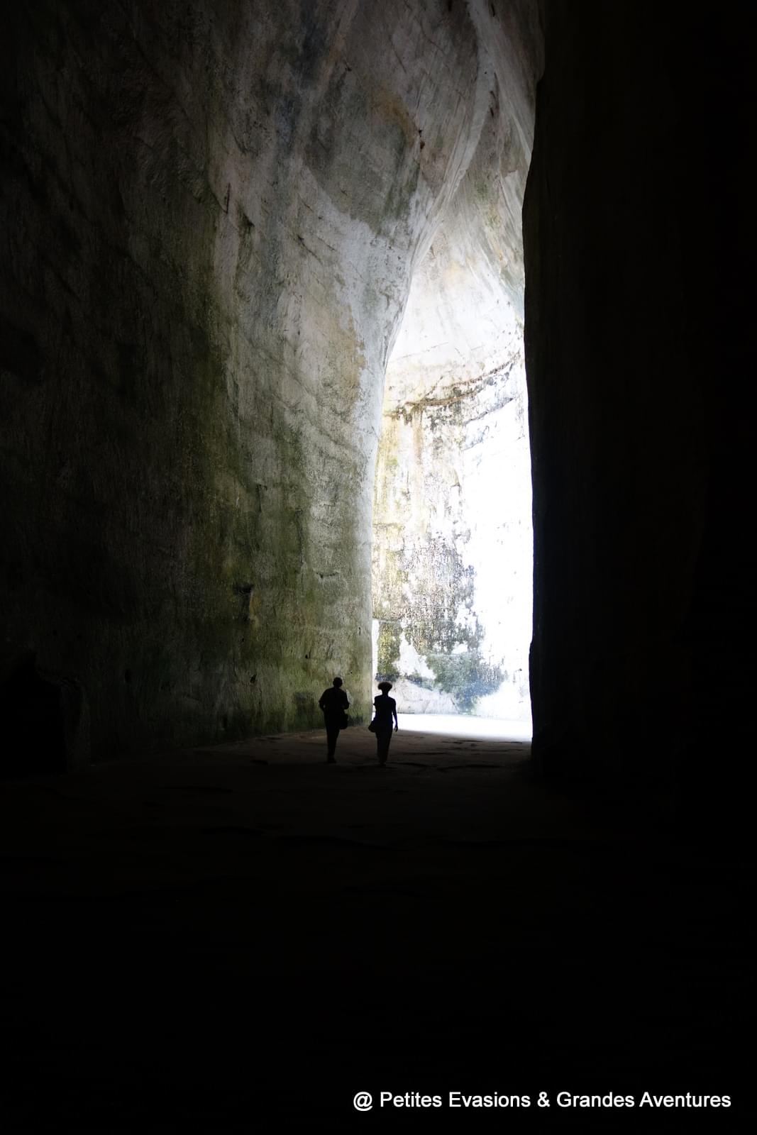 Rapidement, nous arrivons au niveau des latomies, les carrières souterraines dont ont été extraits les blocs de calcaires de cette cité antique. Aujourd’hui, l’affaissement naturel des galeries et les tremblements de terre successifs ont détruit les carrières jusqu’à créer de véritables cratères, recouverts par une végétation luxuriante.