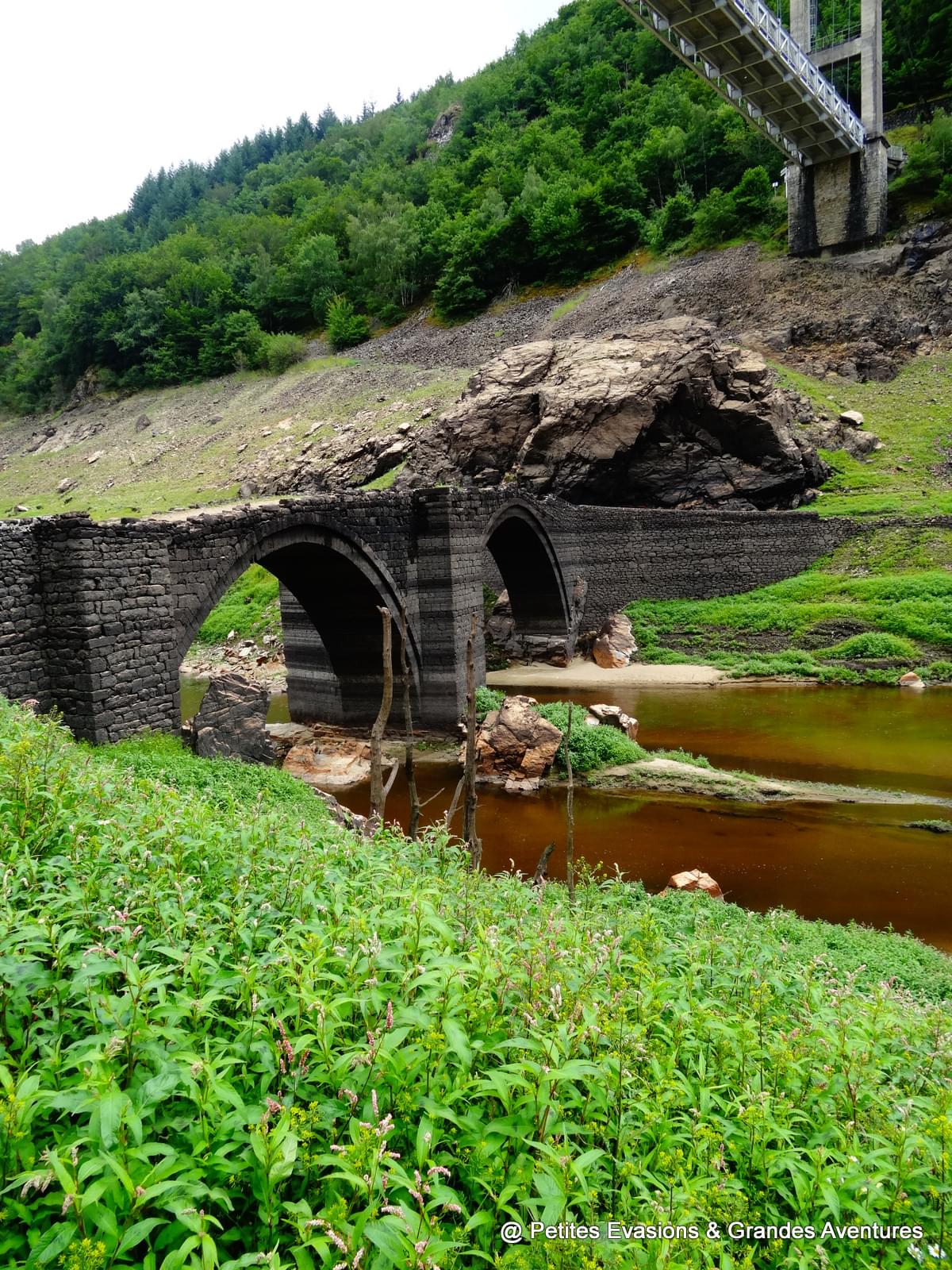 J'ai vu ce pont pour la première fois en 2014, lors de la vidange du Barrage de Sarrans. Depuis, quand j'y pense, je me demande s'il est toujours dans le même état qu'il y a quatre ans, et, surtout, j'attends avec impatience la prochaine vidange du barrage (dans 40 ans !) pour aller le revoir !
