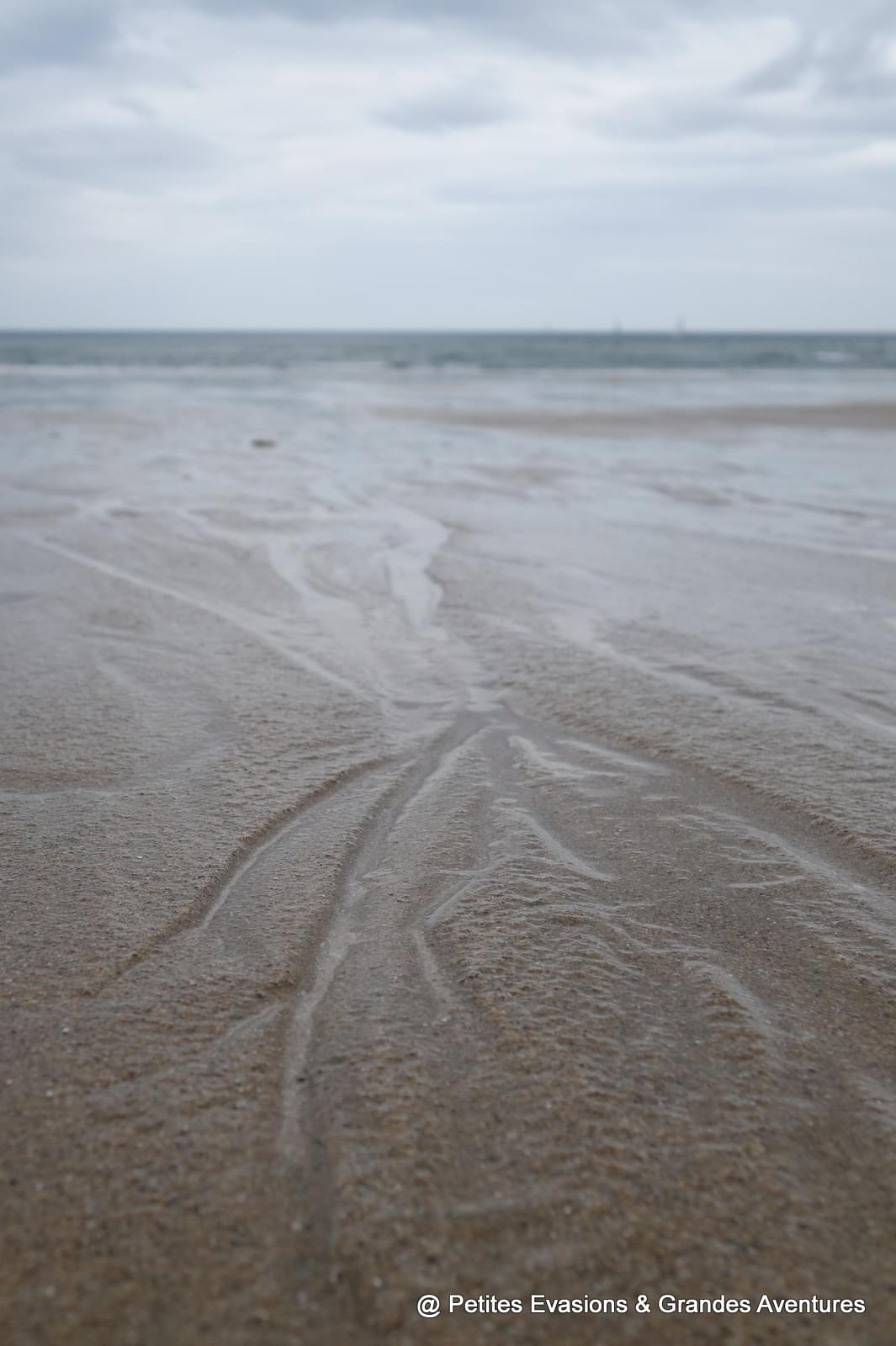 Les Deux Jumeaux se reflétaient sur la plage, les nuages gris et les maisons du front de mer aussi ; l'eau creusait des sillons dans le sable pour rejoindre la mer en créant des dessins singuliers et poétiques. Et on était bien à regarder tout ça, cette magie infinie qui se dégage de ces petites choses auxquelles on ne prête pas toujours attention.