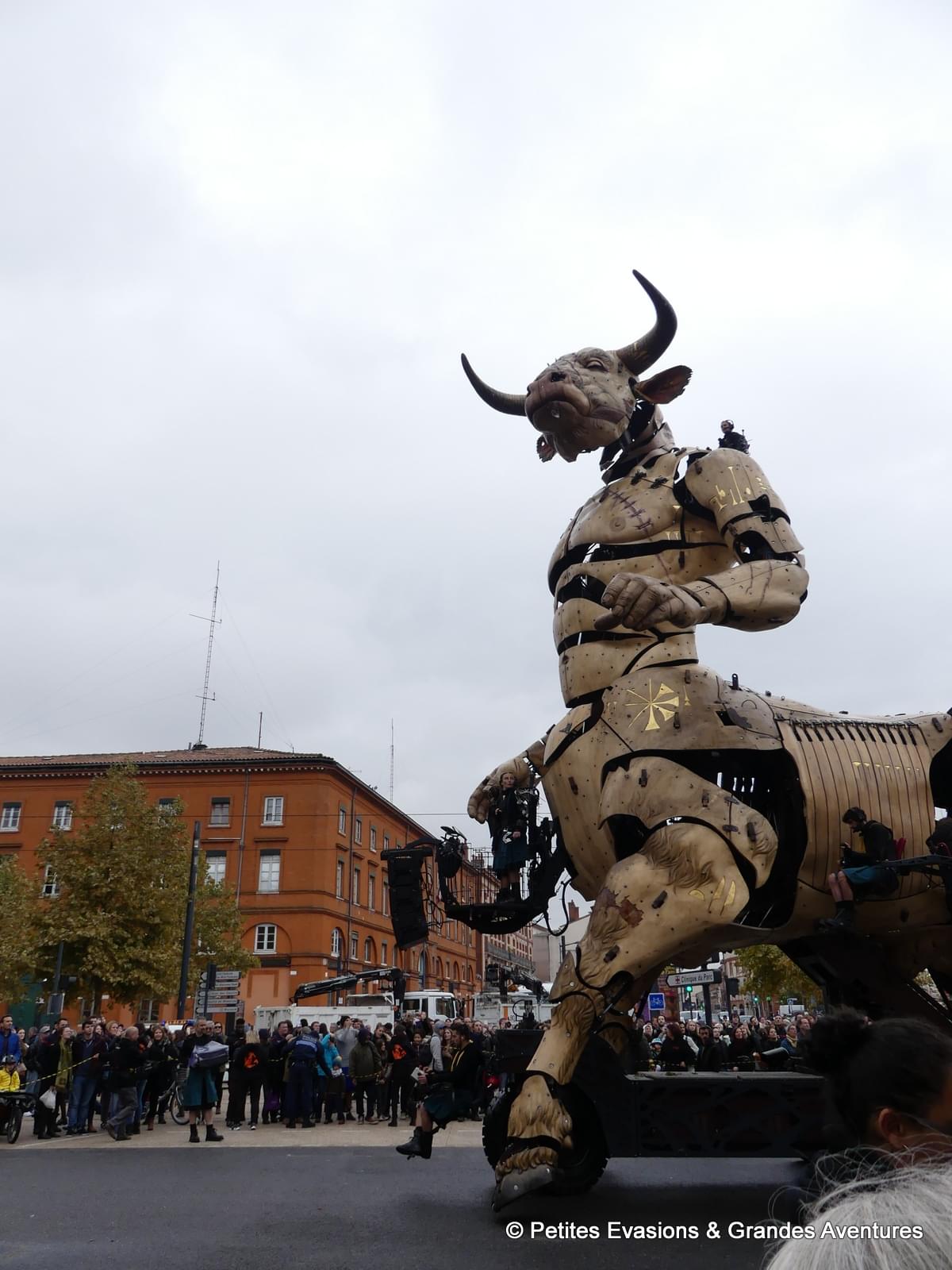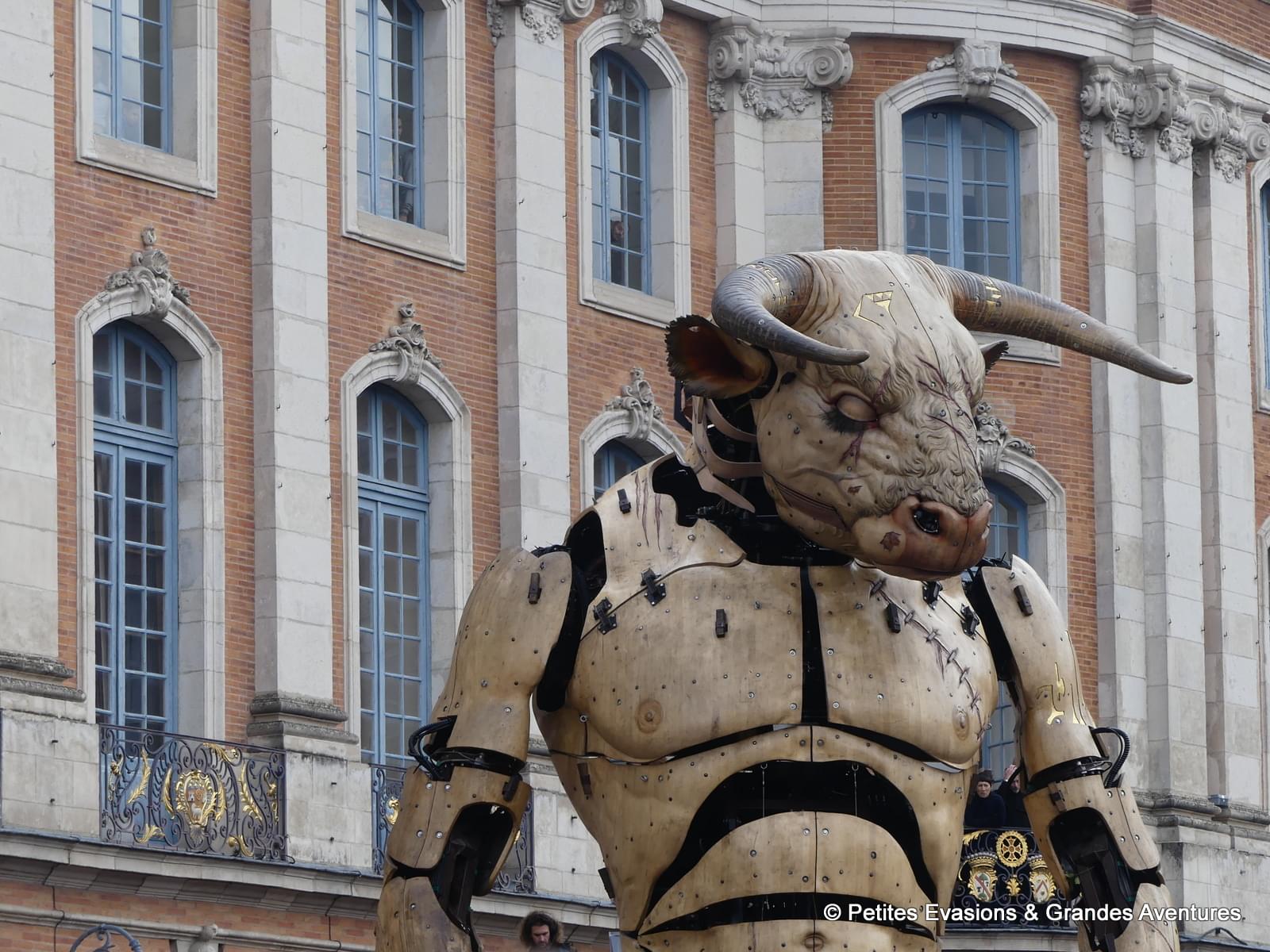 - Astérion, le Minotaure créé spécialement pour Toulouse, qui mesure 14 mètres de haut, 13 mètres de long, 4 mètres de large qui pèsent 47 tonnes ;