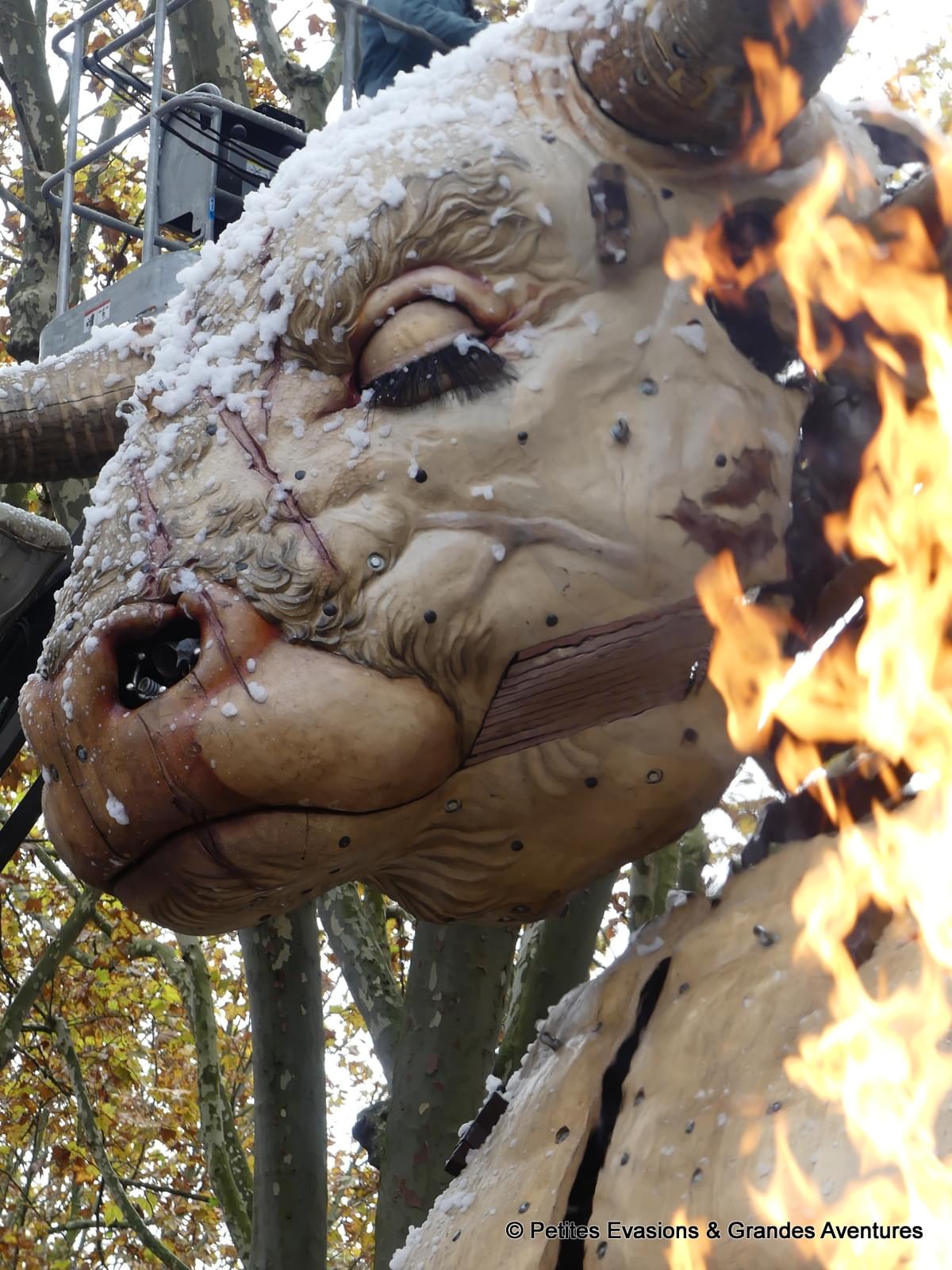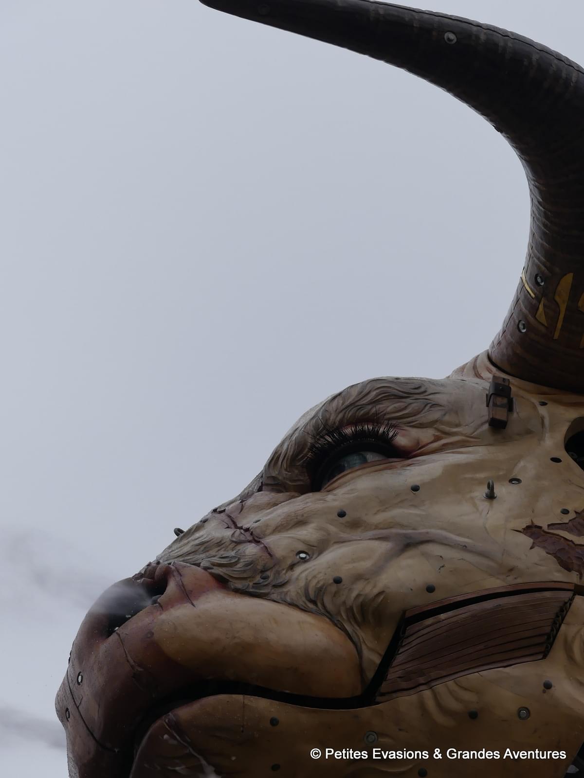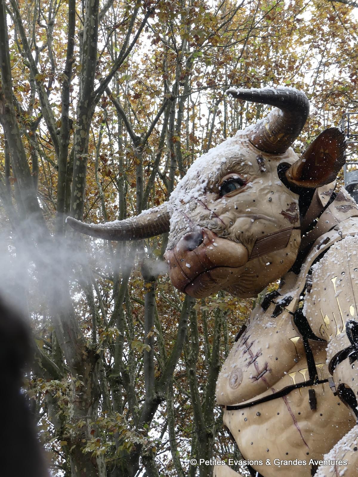 Chacune de ces actions, aussi anodines puissent-elles peut-être paraître en lisant cet article, relèvent pourtant d’une grande qualité et d’un important réalisme dans la conception du minotaure au départ mais aussi d’une tout aussi importante maîtrise de ses commandes par l’équipe qui l’anime. C’est aussi ça qui fait la grandiosité (ce mot-là existe bien par contre) de ce spectacle, l’impressionnante concentration et technicité mises en œuvre tout au long des représentations.