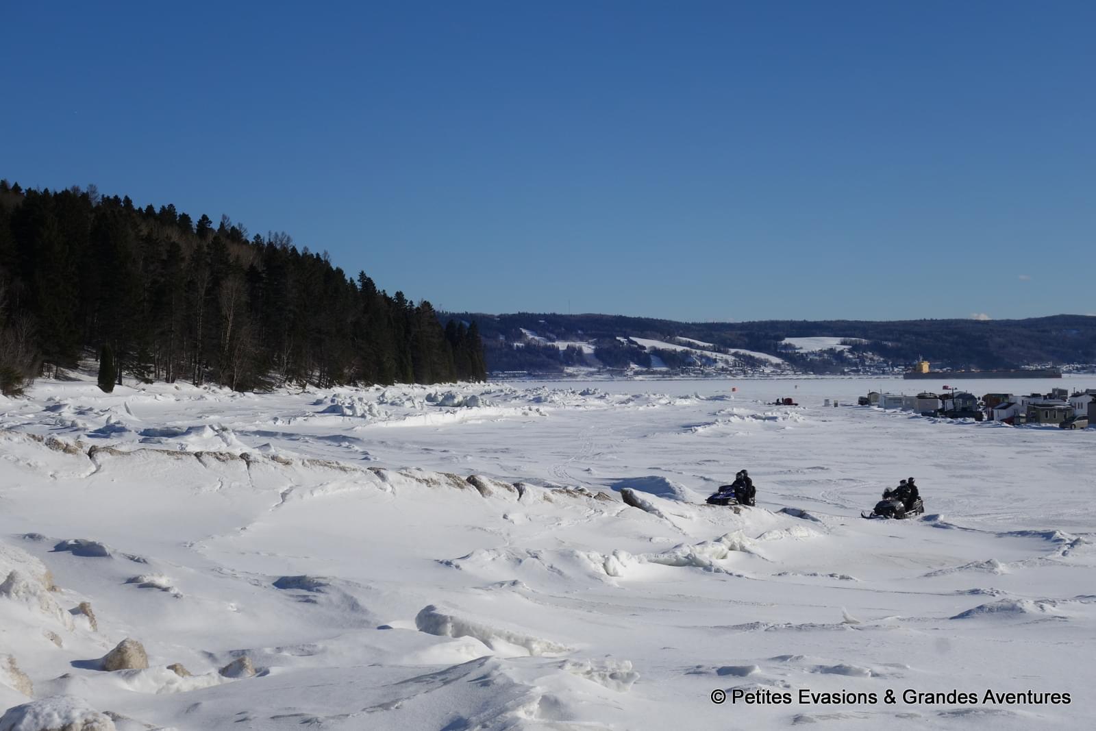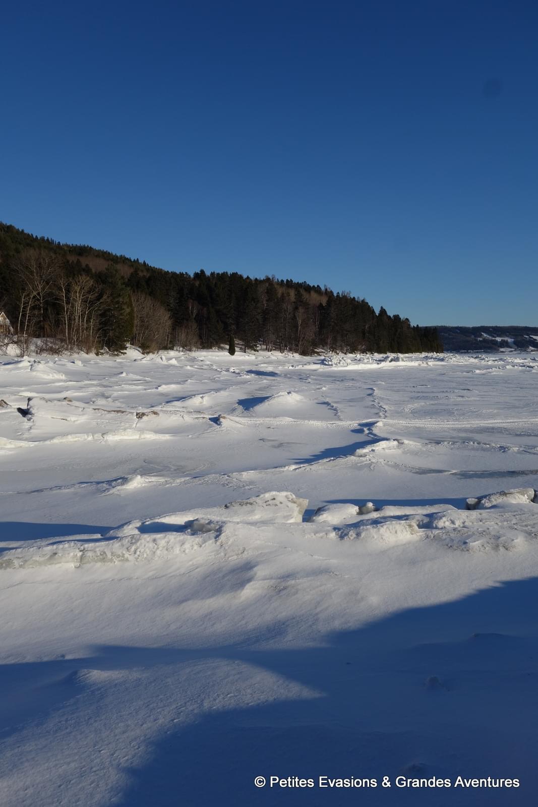 Rapidement, on s’est remis en route pour aller randonner dans le Parc National du Fjord-du-Saguenay, dont guides, blogs et locaux nous avaient conté les merveilles. Pour rejoindre le Parc, on a emprunté le Boulevard de la Grande-Baie Sud, la route qui longe la Baie des Ha! Ha!, immense et impressionnante étendue recouverte de neige, craquelée par endroits et habitée par des petites cabanes de pêche colorées à d’autres (et parfois à seulement quelques mètres de distance !). Un arrêt devant ce panorama à la fois apaisant et accidenté, immensément blanc et coloré, s’est bien naturellement imposé à nous !