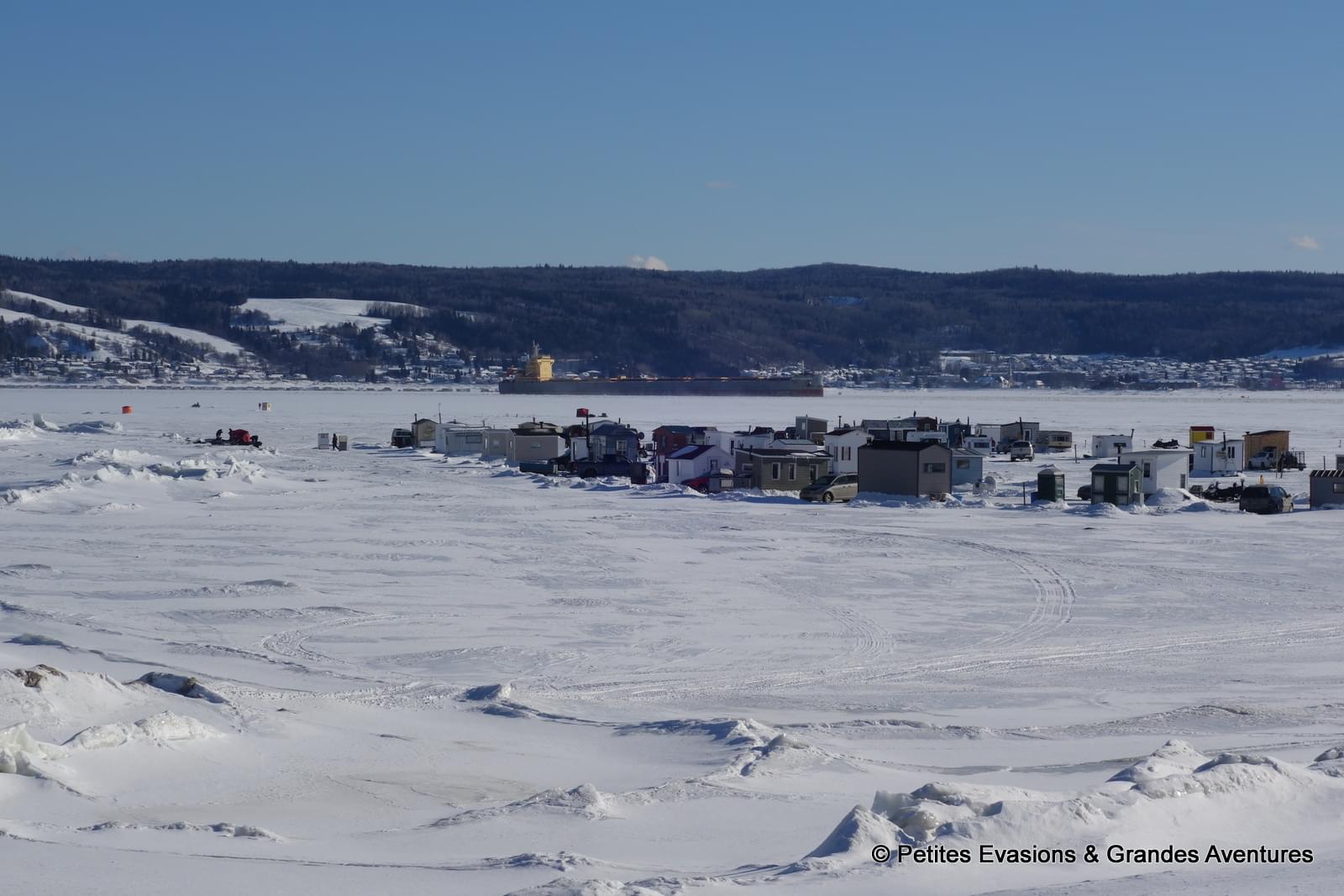 De là-haut, on perçoit bien l’étendue de La Baie des Ha! Ha! et aussi le nombre incroyable de cabanes qui reposent sur sa glace. De là-haut, on voit aussi, en arrière-plan, les reliefs qui modulent ce bout de Québec et l’immensité de ce territoire. On se sent petits face à la nature, privilégiés de pouvoir l’observer ainsi, heureux d’être là, tout simplement.