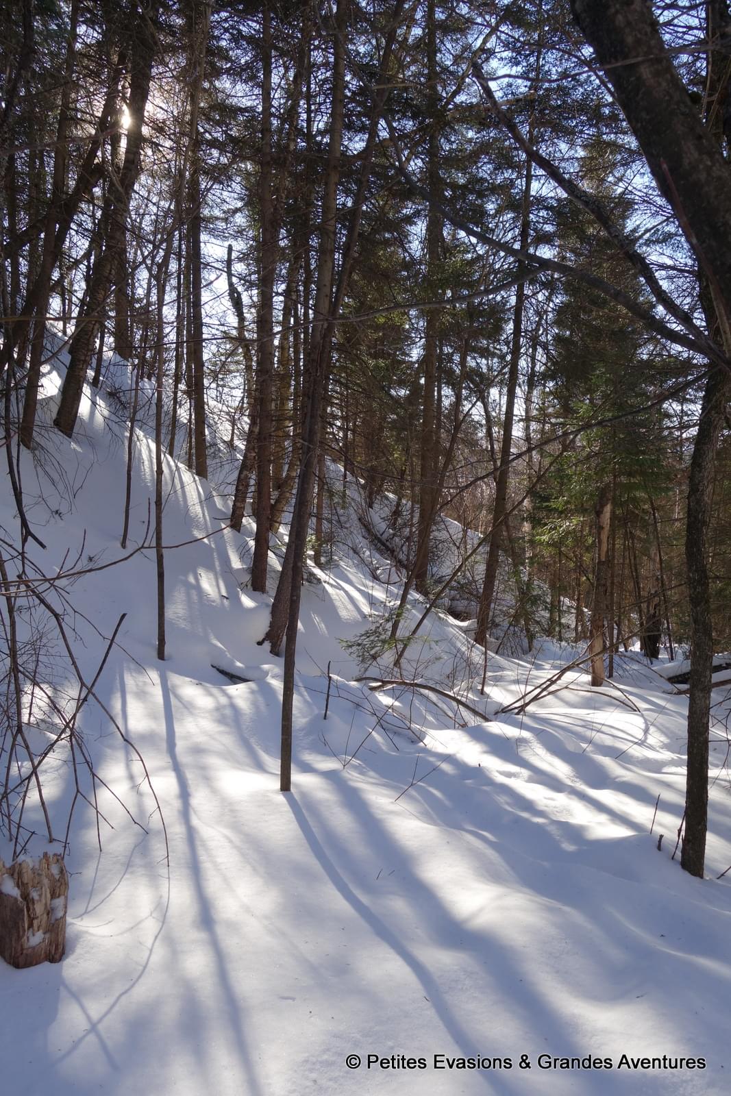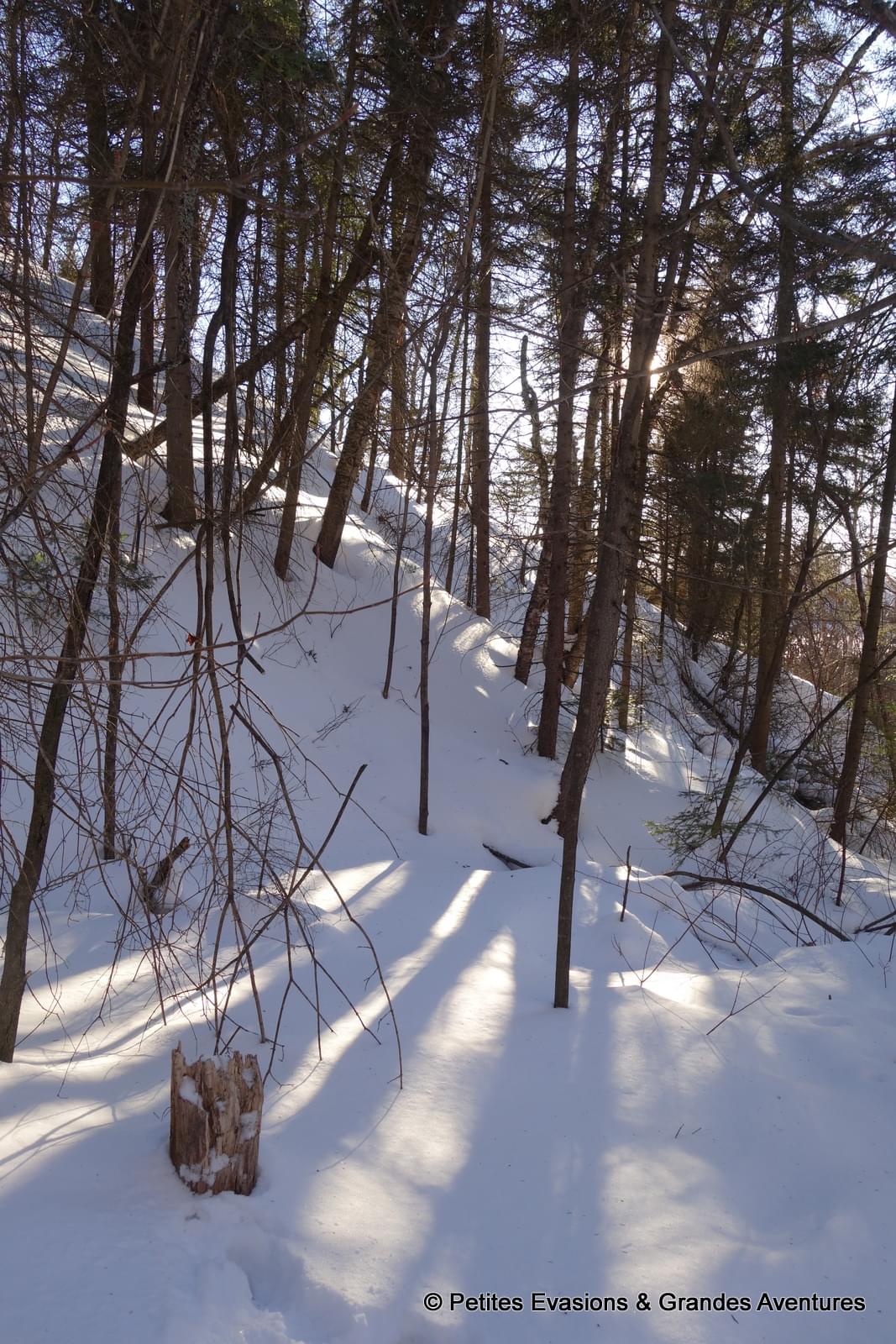 La redescente se fait avec quelques étoiles toujours accrochées aux yeux et à un coin de la tête, ravis de cette balade, fatigante certes, mais vraiment magnifique. Le spectacle de la nature se prolonge avec quelques rayons de soleil qui percent à travers les silhouettes des arbres et les allongent à l’infini sur le sol recouvert de sa ouate d’hiver. Tout en bas, dans l’Anse-à-Benjamin, le soleil qui décline allonge aussi les ombres des petites dunes de glace et donne encore plus de relief à ce paysage glacé, lunaire et merveilleux.