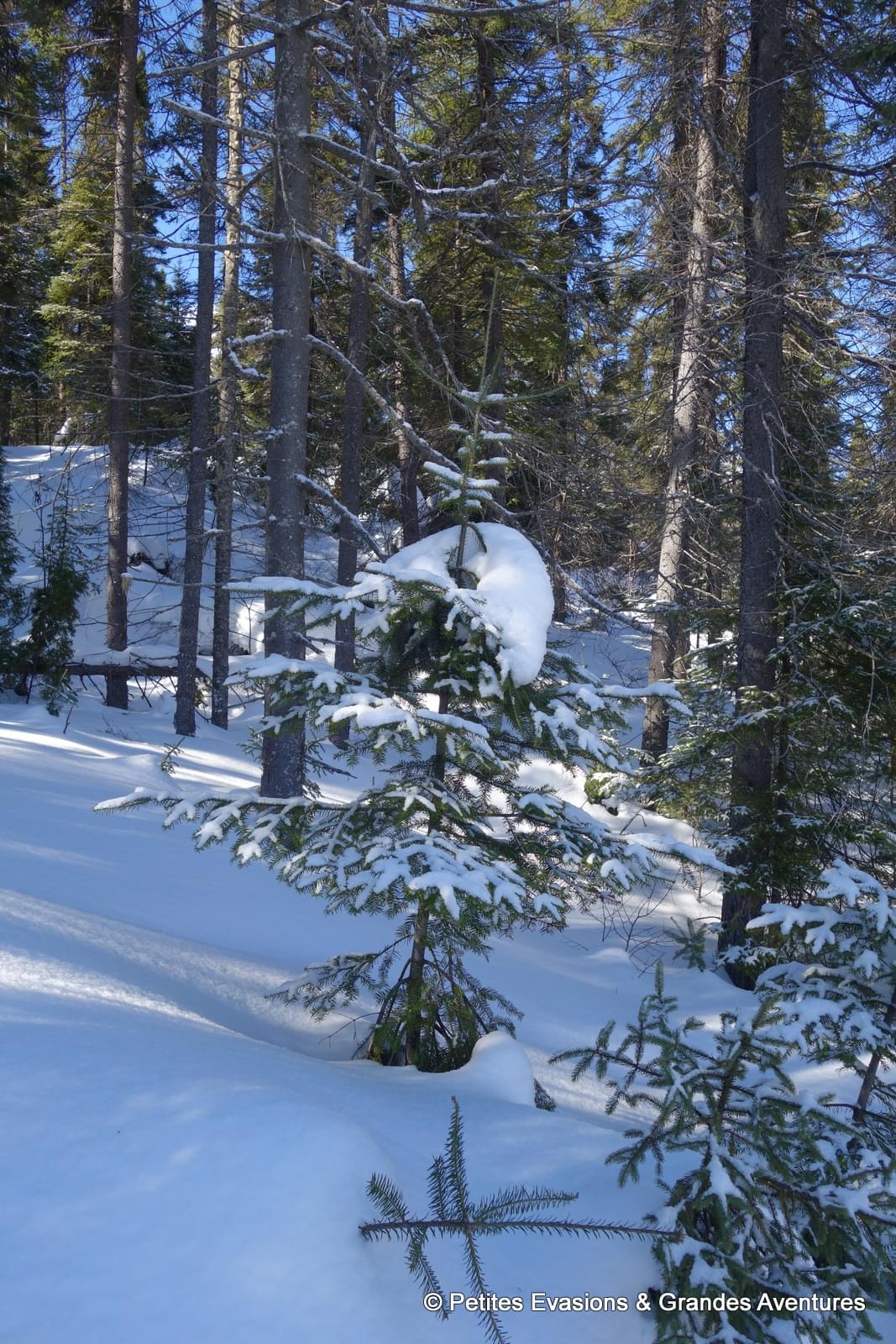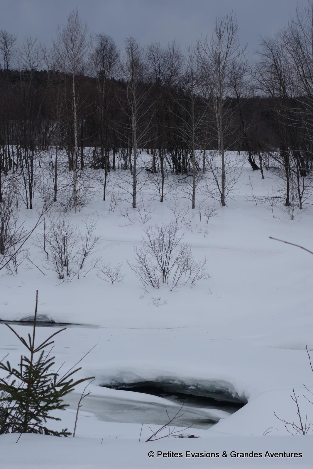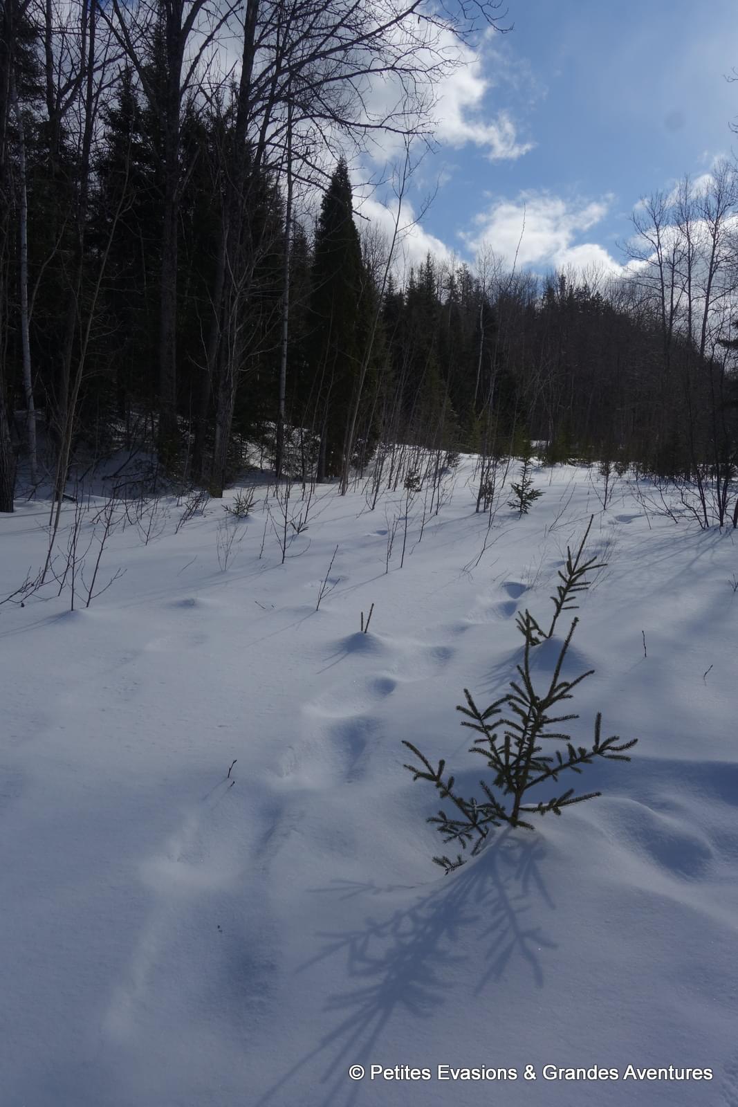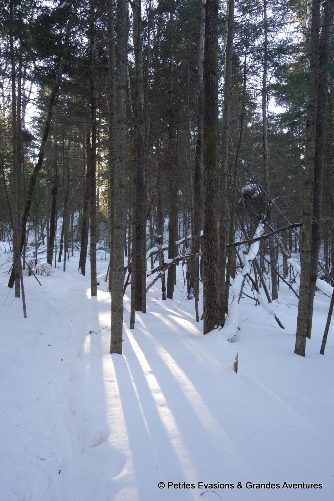 Arrivés de l’autre côté de la rivière, on a suivi un nouveau sentier et rallongé la balade de trois kilomètres … pour le plus grand plaisir de nos yeux (et un petit peu moins celui de mes jambes !). Sur le sentier « La Passe du Matelot », on a vu de jolis paysages aux arbres largement blanchis ou juste saupoudrés de neige ; le tapis blanc qui recouvrait le sol scintillait sous le soleil nous offrant un petit moment de féerie au cœur d’une forêt québécoise.