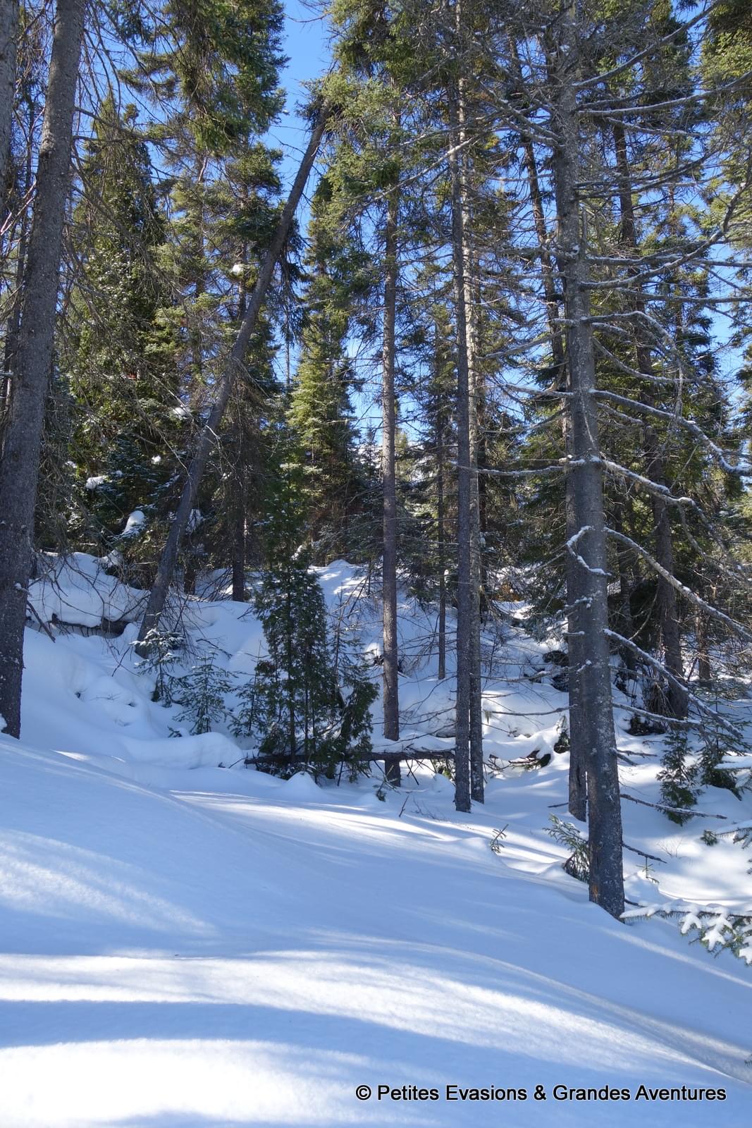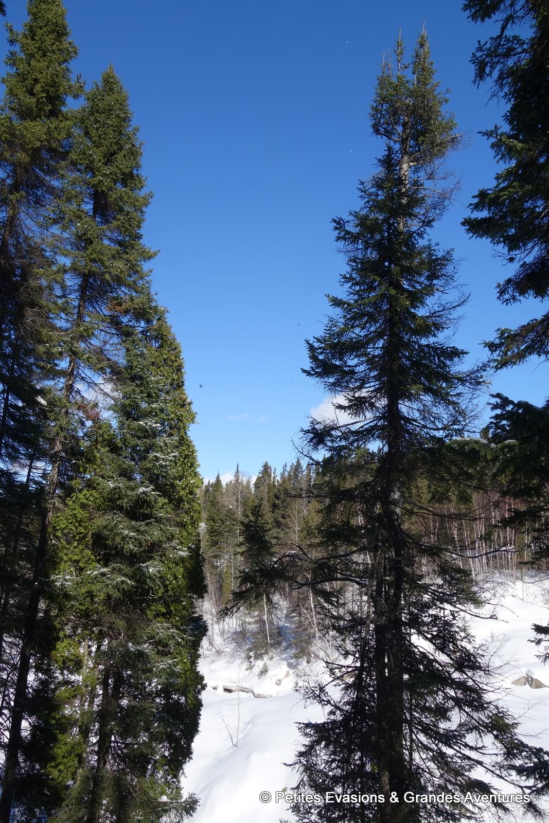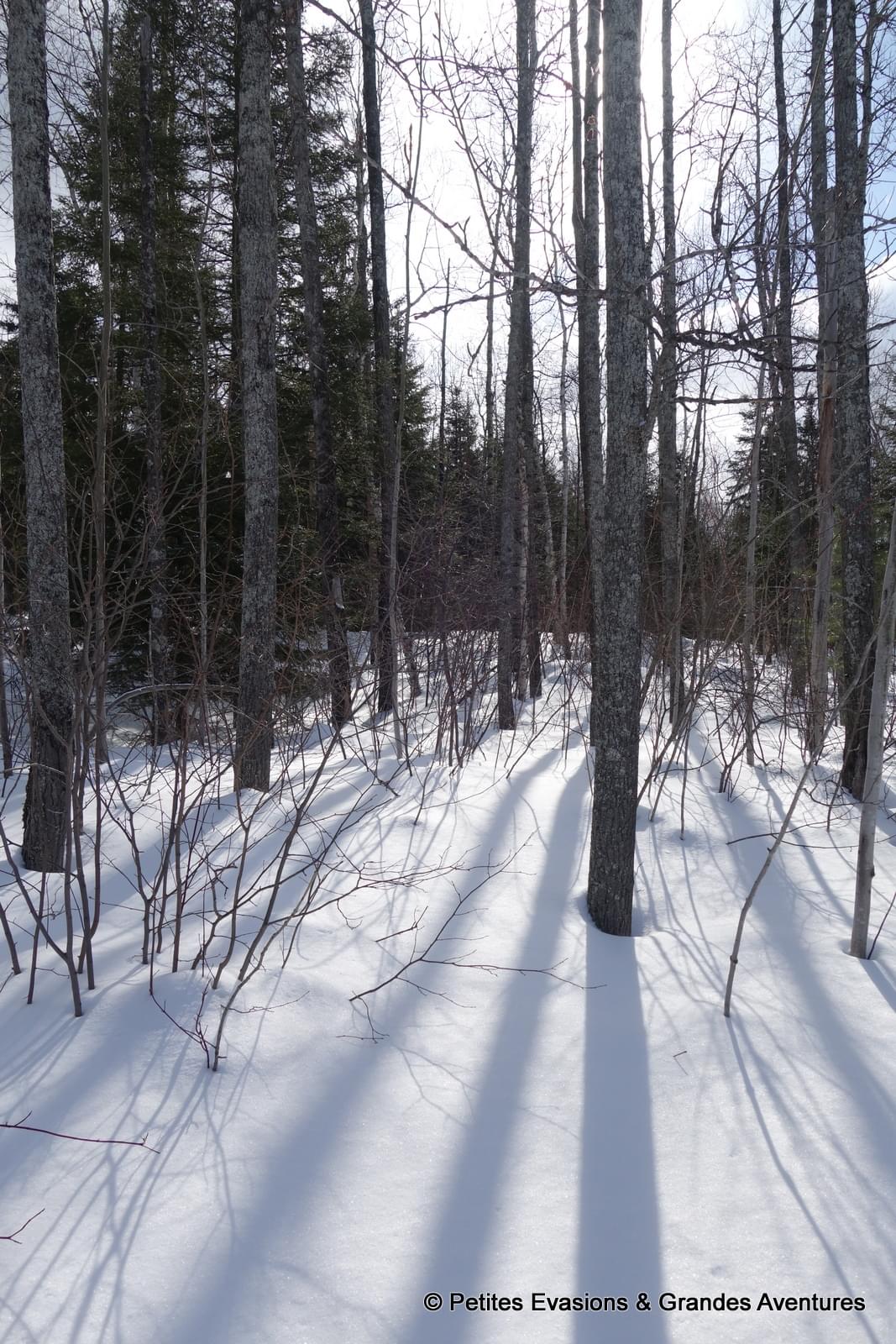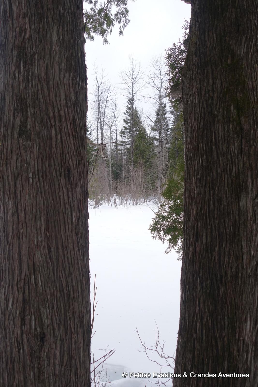 Arrivés de l’autre côté de la rivière, on a suivi un nouveau sentier et rallongé la balade de trois kilomètres … pour le plus grand plaisir de nos yeux (et un petit peu moins celui de mes jambes !). Sur le sentier « La Passe du Matelot », on a vu de jolis paysages aux arbres largement blanchis ou juste saupoudrés de neige ; le tapis blanc qui recouvrait le sol scintillait sous le soleil nous offrant un petit moment de féerie au cœur d’une forêt québécoise.