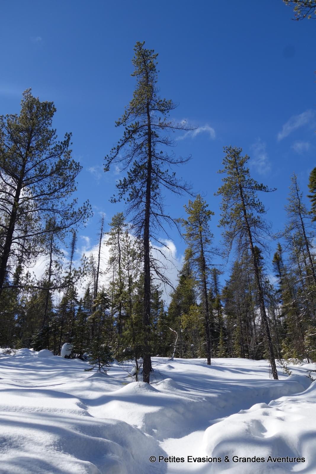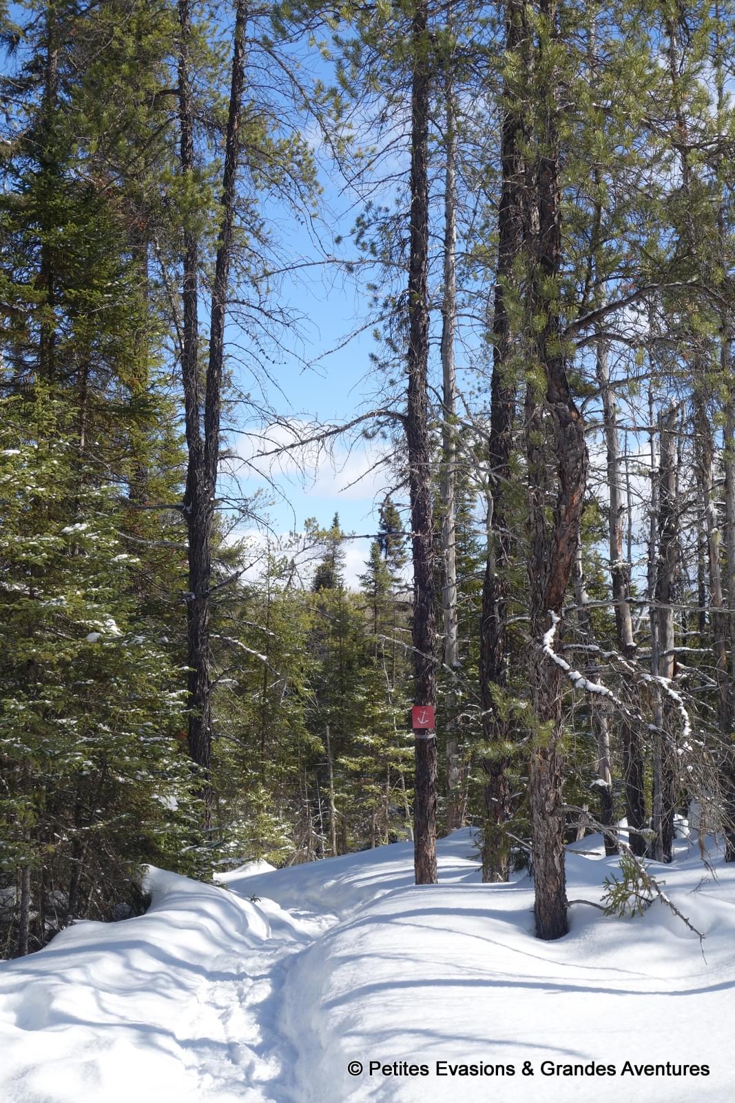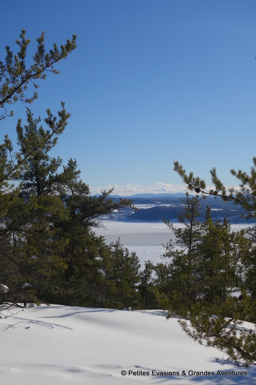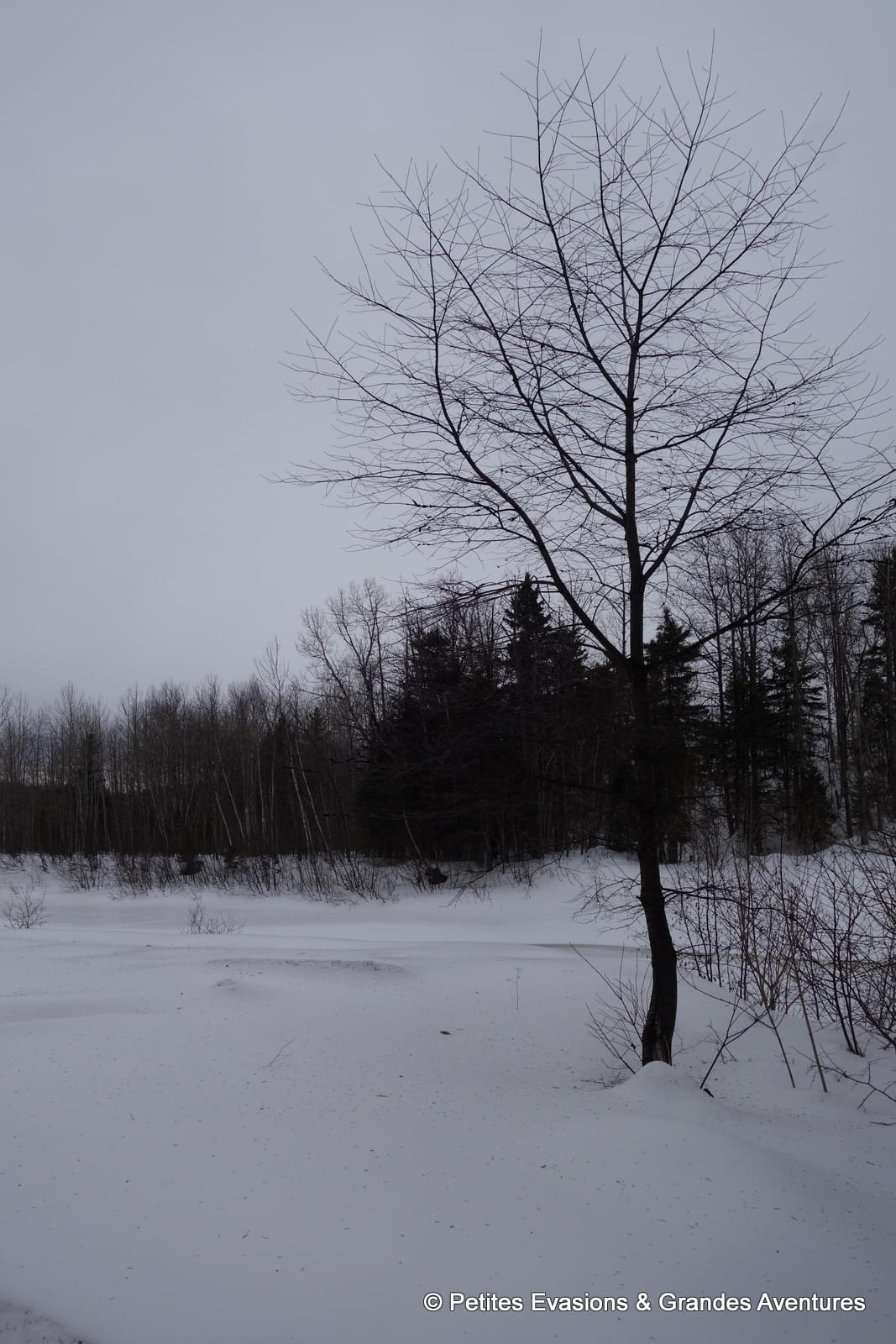 Arrivés de l’autre côté de la rivière, on a suivi un nouveau sentier et rallongé la balade de trois kilomètres … pour le plus grand plaisir de nos yeux (et un petit peu moins celui de mes jambes !). Sur le sentier « La Passe du Matelot », on a vu de jolis paysages aux arbres largement blanchis ou juste saupoudrés de neige ; le tapis blanc qui recouvrait le sol scintillait sous le soleil nous offrant un petit moment de féerie au cœur d’une forêt québécoise.