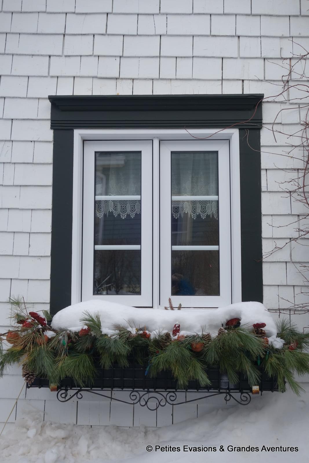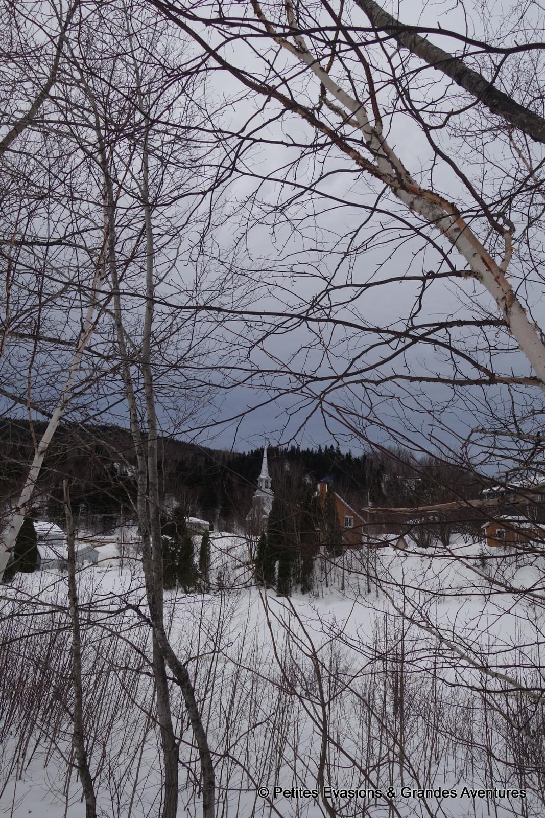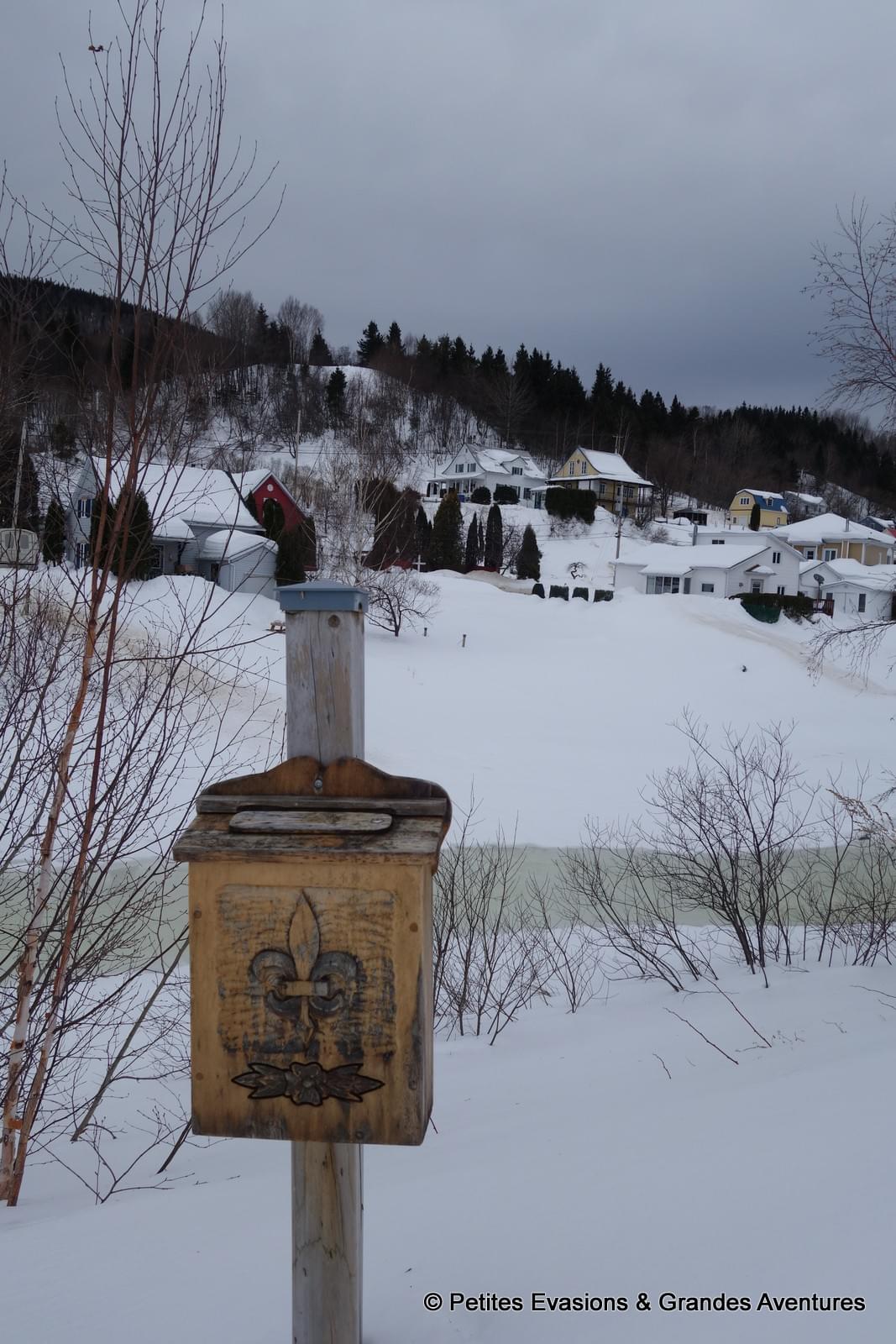 Depuis le Pont du Faubourg, pont couvert qui enjambe la rivière Saint-Jean et point de départ de notre randonnée, le point de vue sur la petite ville de L’Anse-Saint-Jean est des plus charmants. Dressées le long de la route ou sur des petites collines, de jolies petites maisons aux toits en tôles et aux murs de bois, colorés ou non, surplombent la rivière, semant çà et là des tâches de couleurs dans le paysage hivernal.
