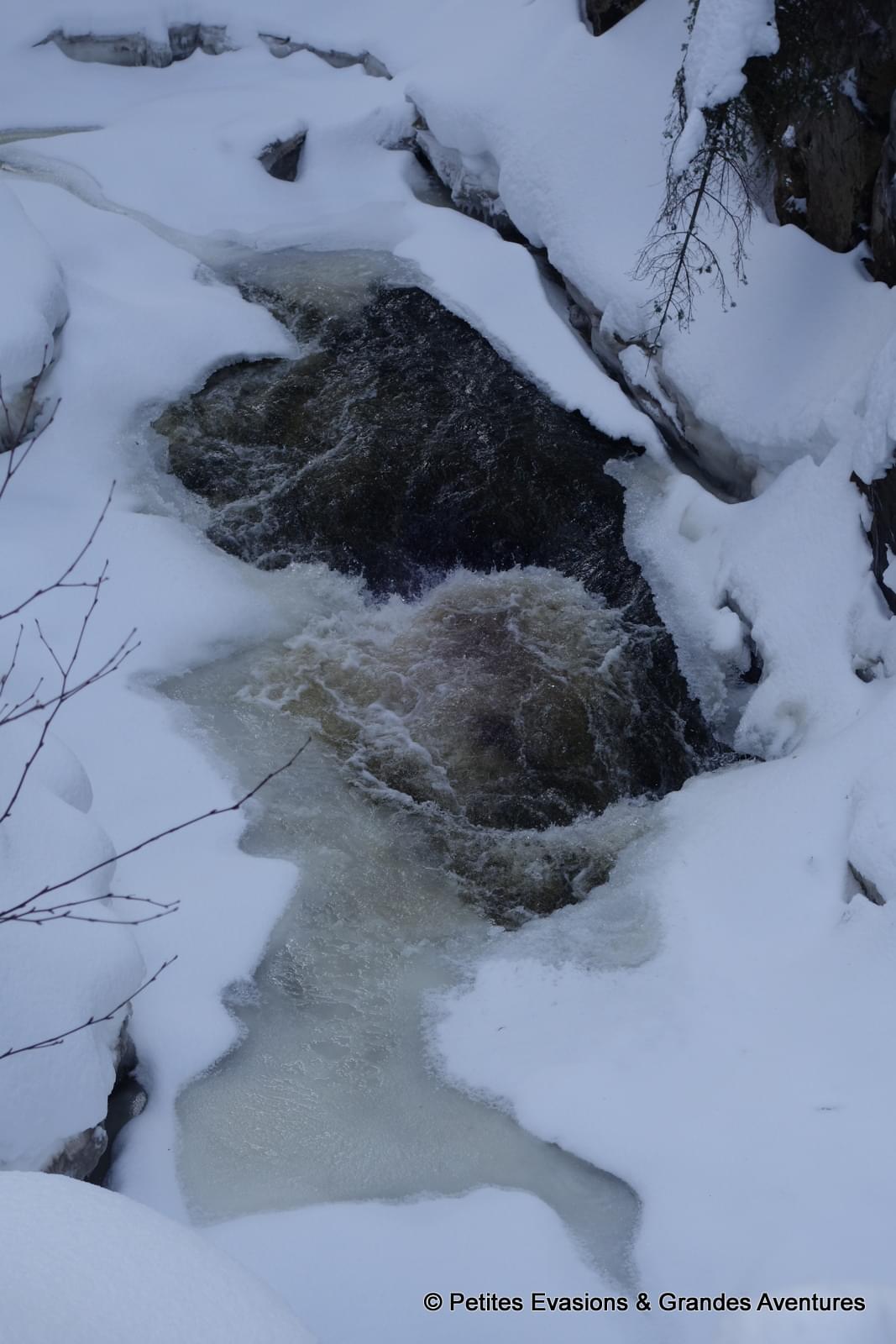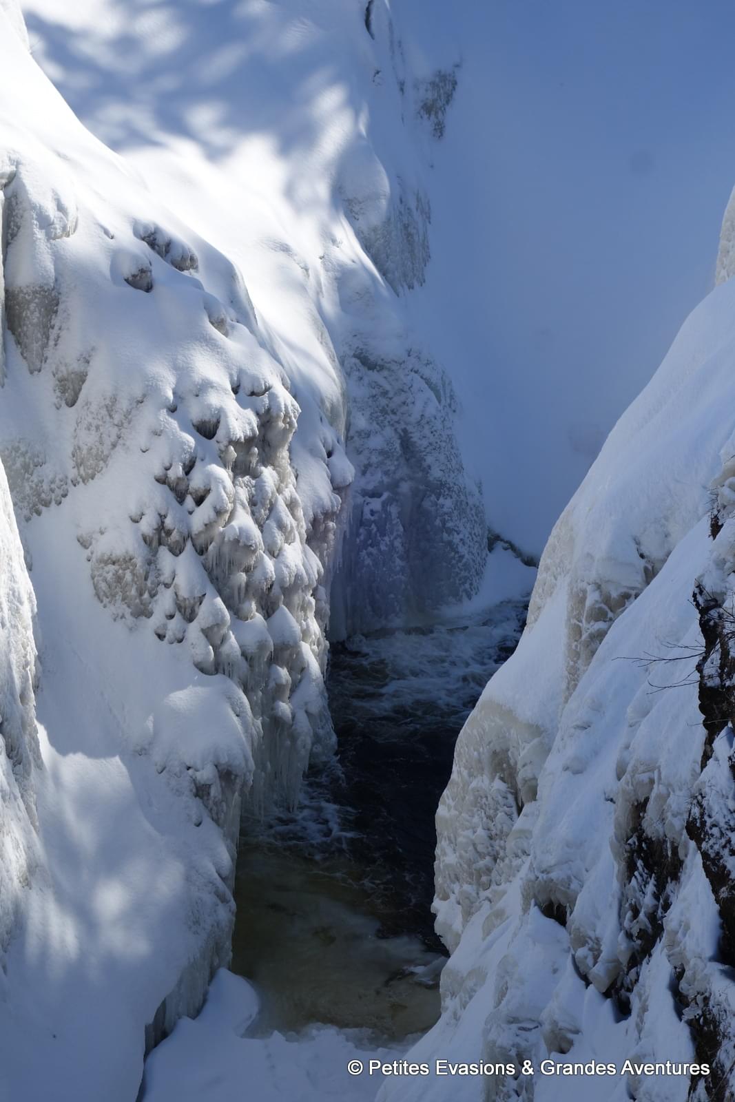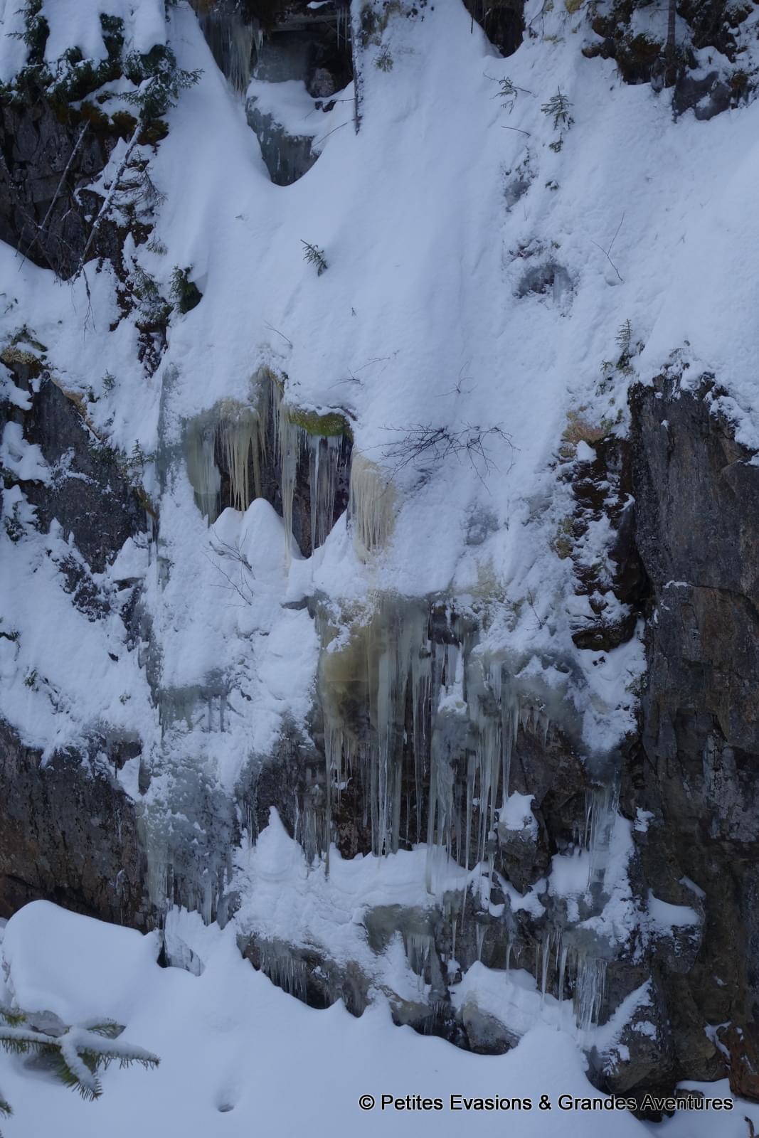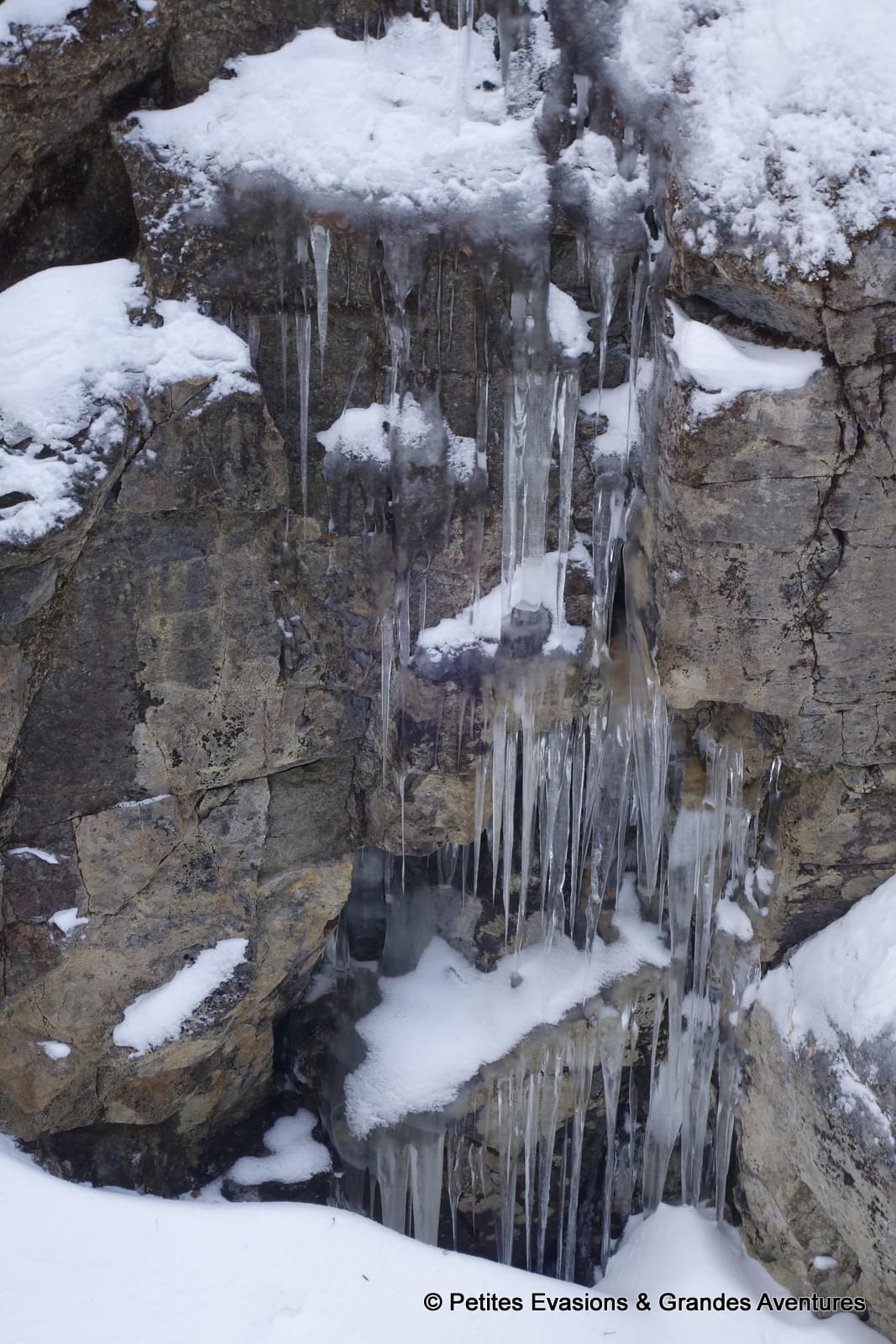 Heureusement, des plateformes aménagées pour surplomber le canyon, nous ont permis de faire quelques pauses rafraîchissantes et contemplatives. Malgré le froid et la glace qui la recouvrait en partie, la Rivière-à-Mars continuait de courir au fond de son canyon, noire, puissante. Les parois rocheuses du canyon dégoulinaient de glace, emprisonnant par endroit la nature en hibernation.