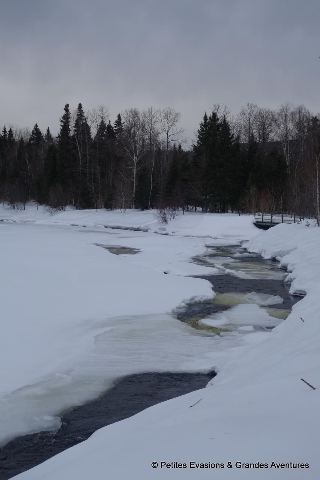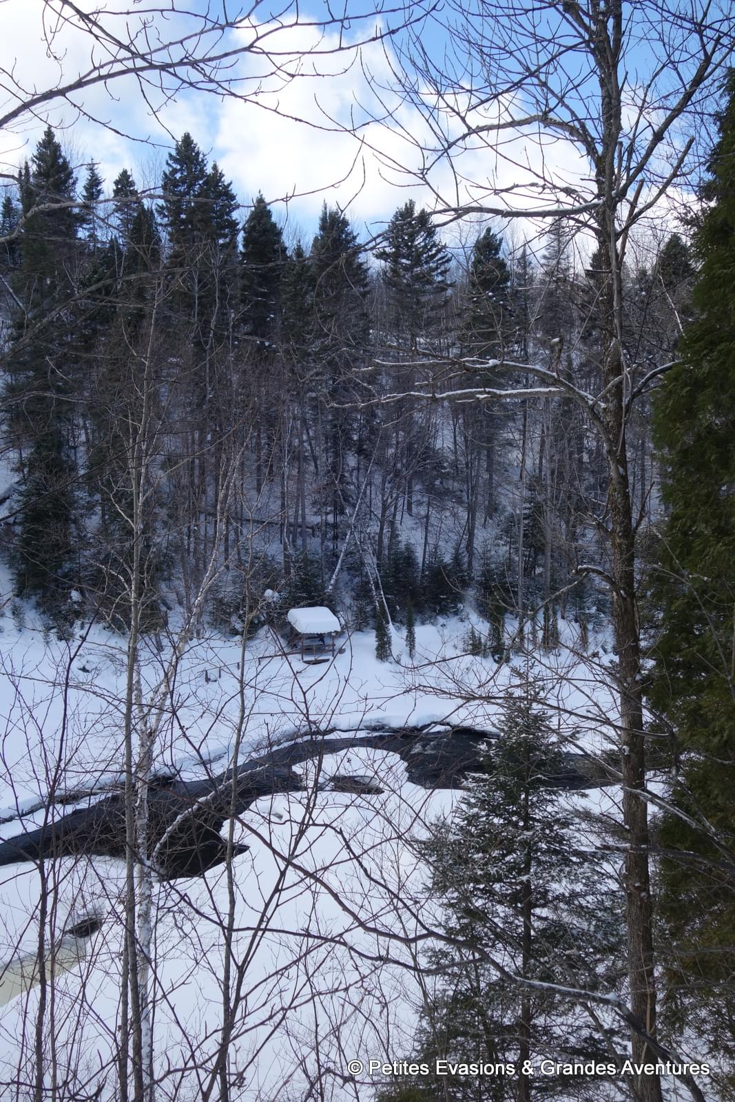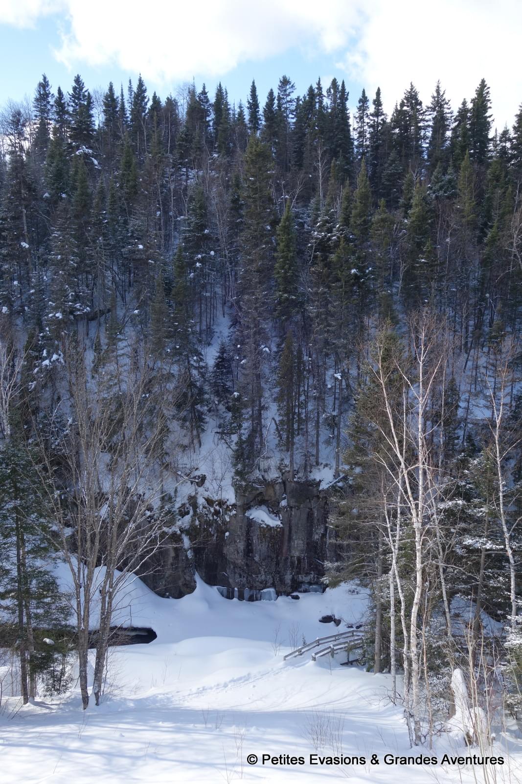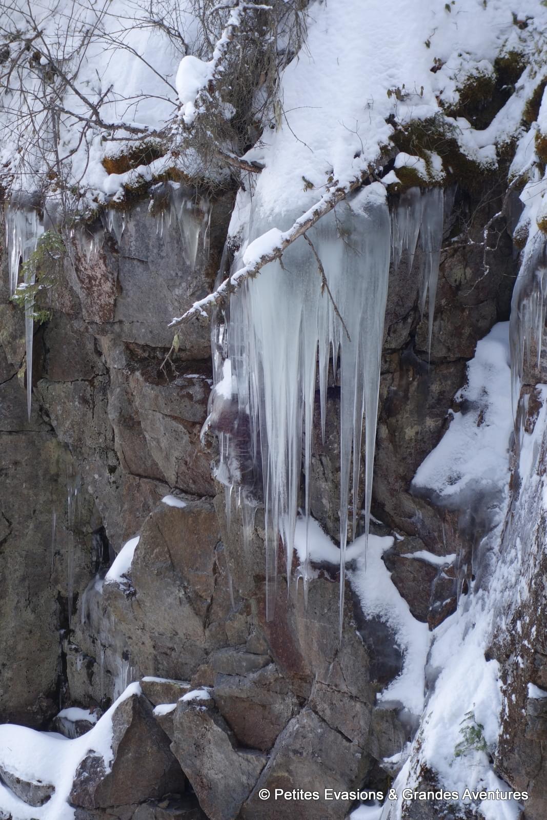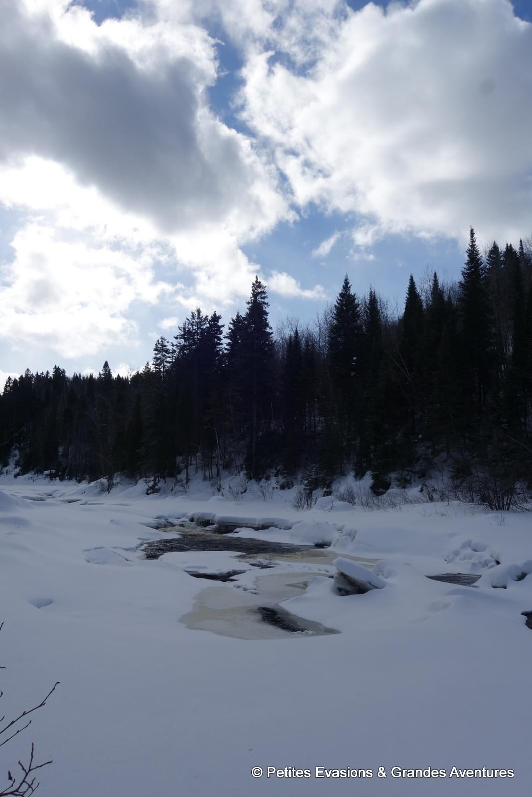 Heureusement, des plateformes aménagées pour surplomber le canyon, nous ont permis de faire quelques pauses rafraîchissantes et contemplatives. Malgré le froid et la glace qui la recouvrait en partie, la Rivière-à-Mars continuait de courir au fond de son canyon, noire, puissante. Les parois rocheuses du canyon dégoulinaient de glace, emprisonnant par endroit la nature en hibernation.