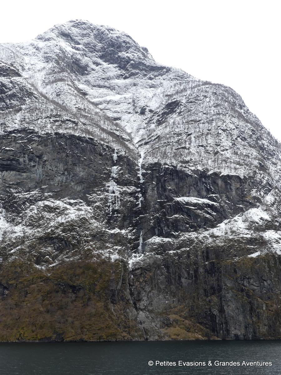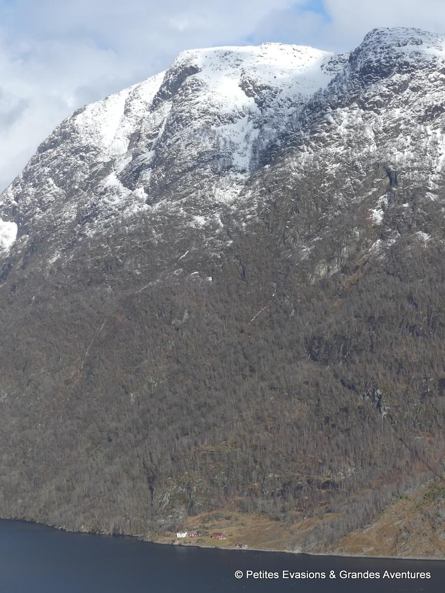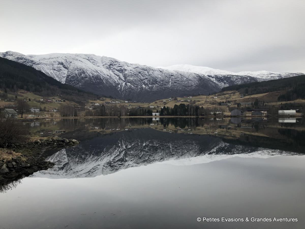 Je ne veux pas oublier, qu’en dehors de ces hauts plateaux, la neige, bien que plus timide, venait quand même agrémenter joliment les paysages. Surtout présente sur les reliefs, sa quantité augmentait, logiquement, avec l’altitude. Elle magnifiait les sommets et attirait invariablement nos regards vers eux, nous aidant à prendre toute la mesure, et la hauteur, du décor enchanteur qui nous entourait. Et, dans les miroirs d’eau qu’offraient parfois les fjords, elle soulignait à merveille les reflets parfaits qui s’étendaient devant nous.