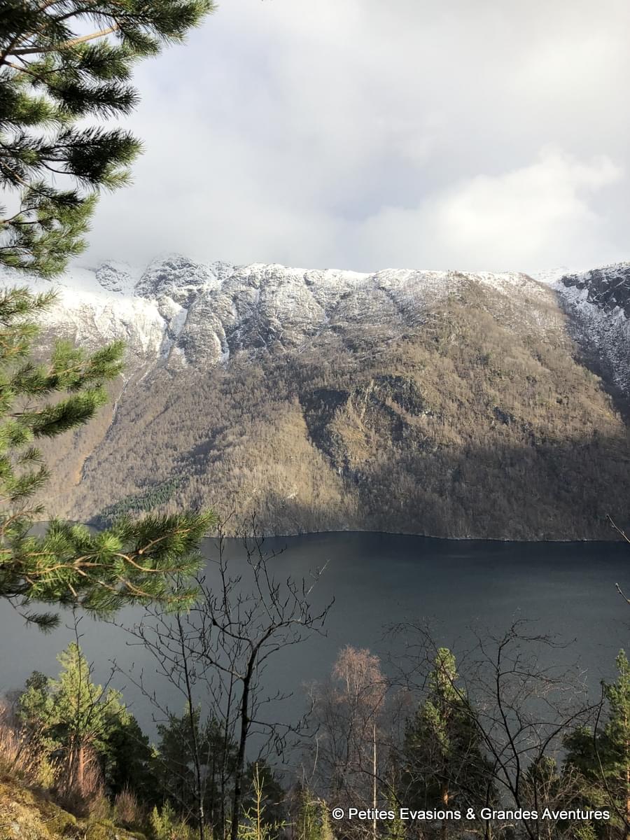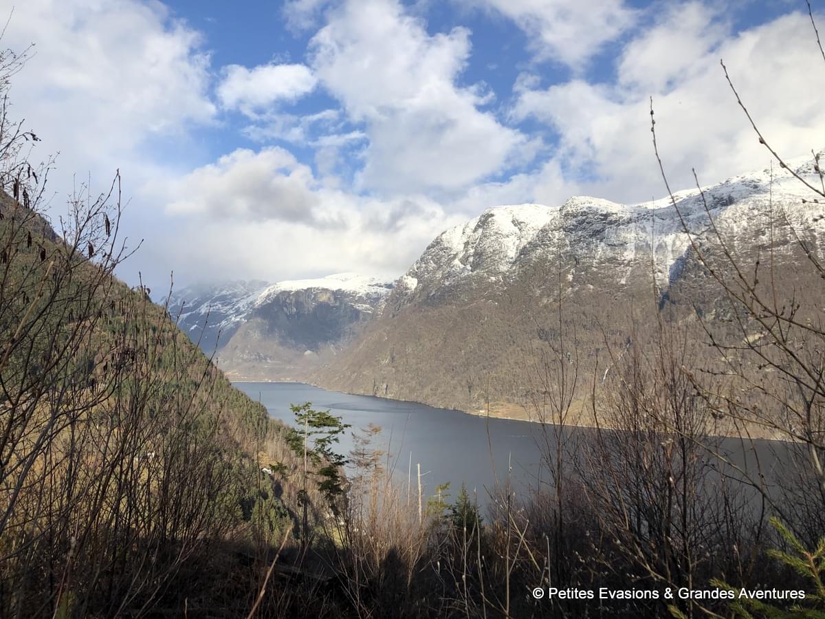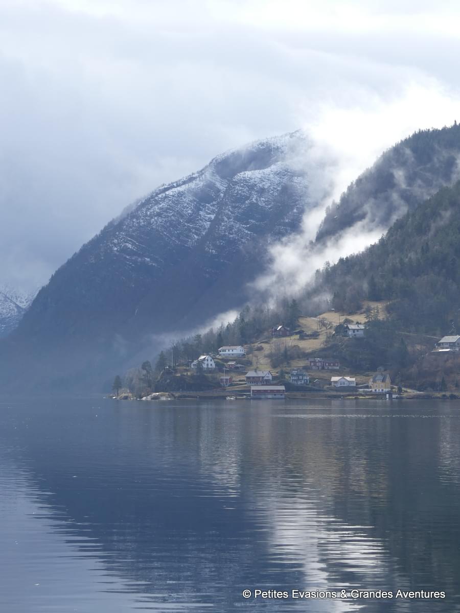 Je ne veux pas oublier, qu’en dehors de ces hauts plateaux, la neige, bien que plus timide, venait quand même agrémenter joliment les paysages. Surtout présente sur les reliefs, sa quantité augmentait, logiquement, avec l’altitude. Elle magnifiait les sommets et attirait invariablement nos regards vers eux, nous aidant à prendre toute la mesure, et la hauteur, du décor enchanteur qui nous entourait. Et, dans les miroirs d’eau qu’offraient parfois les fjords, elle soulignait à merveille les reflets parfaits qui s’étendaient devant nous.