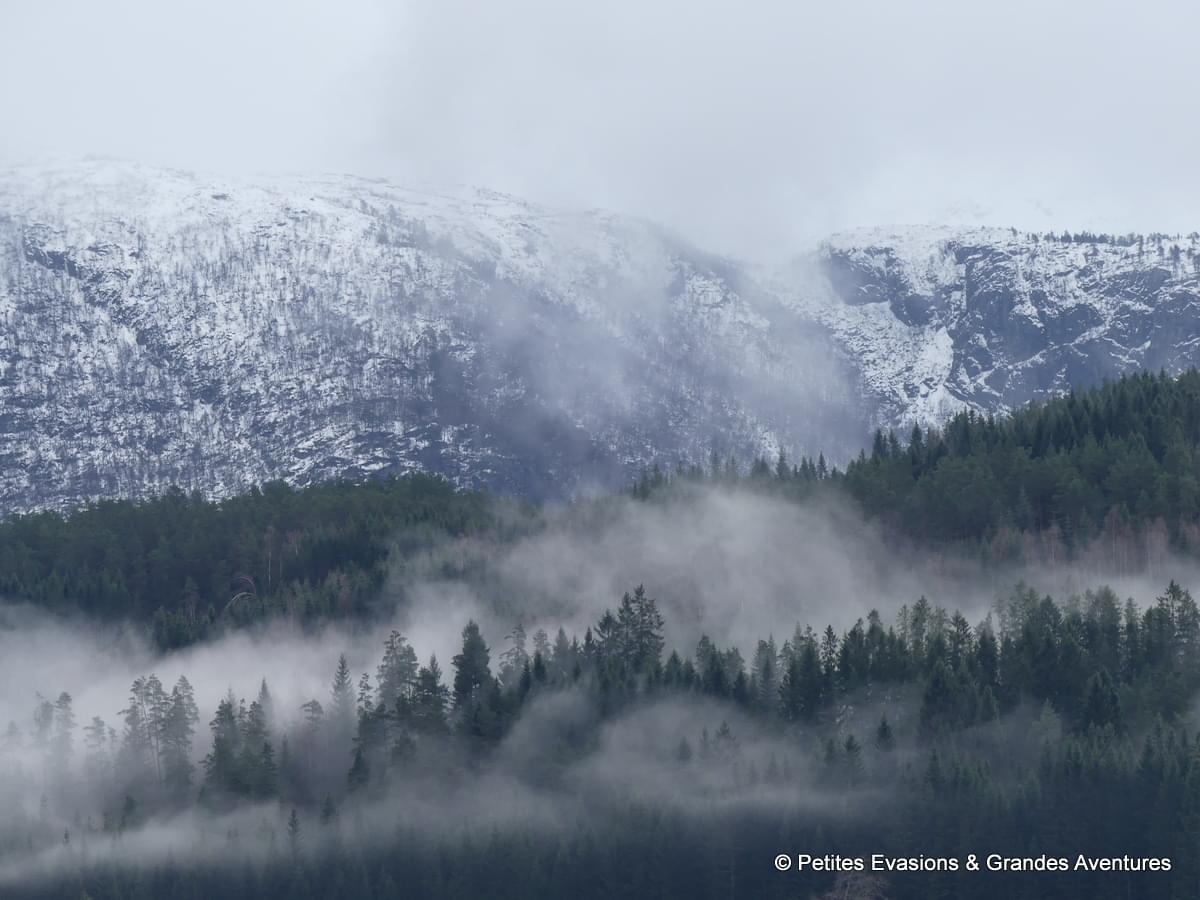 Je ne veux pas oublier la beauté de ces panoramas parés de brume ; dont l’apparente légèreté, l’évidente fragilité, l’évanescence imminente, contrastait indéniablement avec l’aspect solide des roches plusieurs fois millénaires qui forment les paysages de Norvège. Accrochées aux reliefs, ou dans les arbres qui hérissent ceux-ci, ces étoles de brouillard apportaient une touche d’infinie douceur à des paysages bruts, abruptes, rugueux ; mais aussi une touche de mystère, de secret, de terre qui ne se dévoile pas totalement à moins d’y rester un long moment, de l’explorer au fil des saisons, au plus près de sa nature.