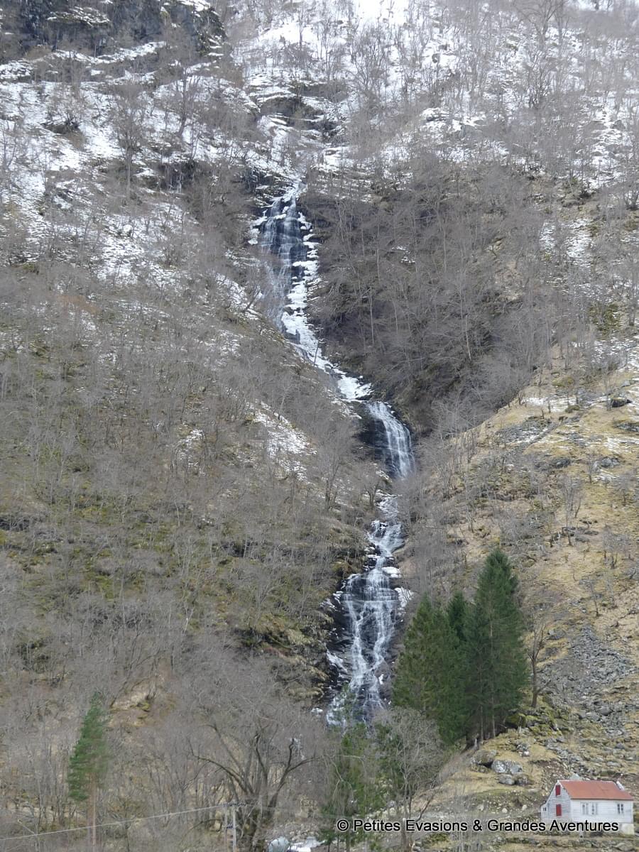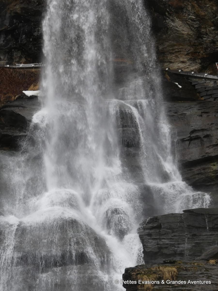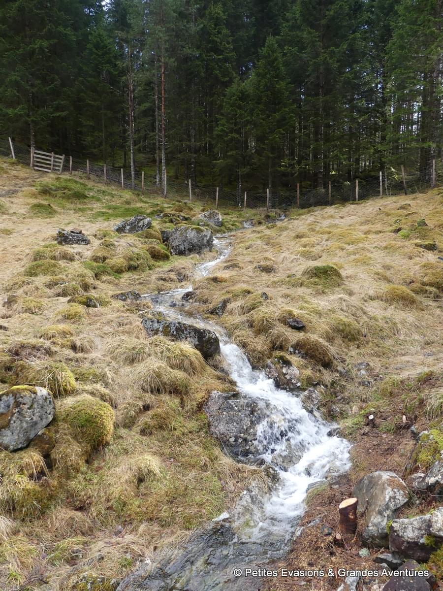 Je ne veux pas oublier que dans ces paysages massifs, rocailleux et même dans les mousses vertes des forêts norvégiennes, l’eau, toujours arrive à se frayer un chemin. Venue d’on ne sait où, des entrailles de la terre ou d’un autre monde qui vivrait derrière les rochers ou sous la mousse, l’eau ruisselle, cascade, se déverse, partout, pour finir sa course dans les fjords ; en arrosant au passage la nature qui s’épanouit sous ce ruissellement continu, en murmurant au passage une douce mélodie aux oreilles des promeneurs. Du petit filet d’eau qui suinte des rochers à la cascade majestueuse qui s’écoule avec fracas, la Norvège est une terre où l’eau jaillit de toute part, animée, bruyante, pour alimenter les étendues infiniment calmes que sont les fjords.