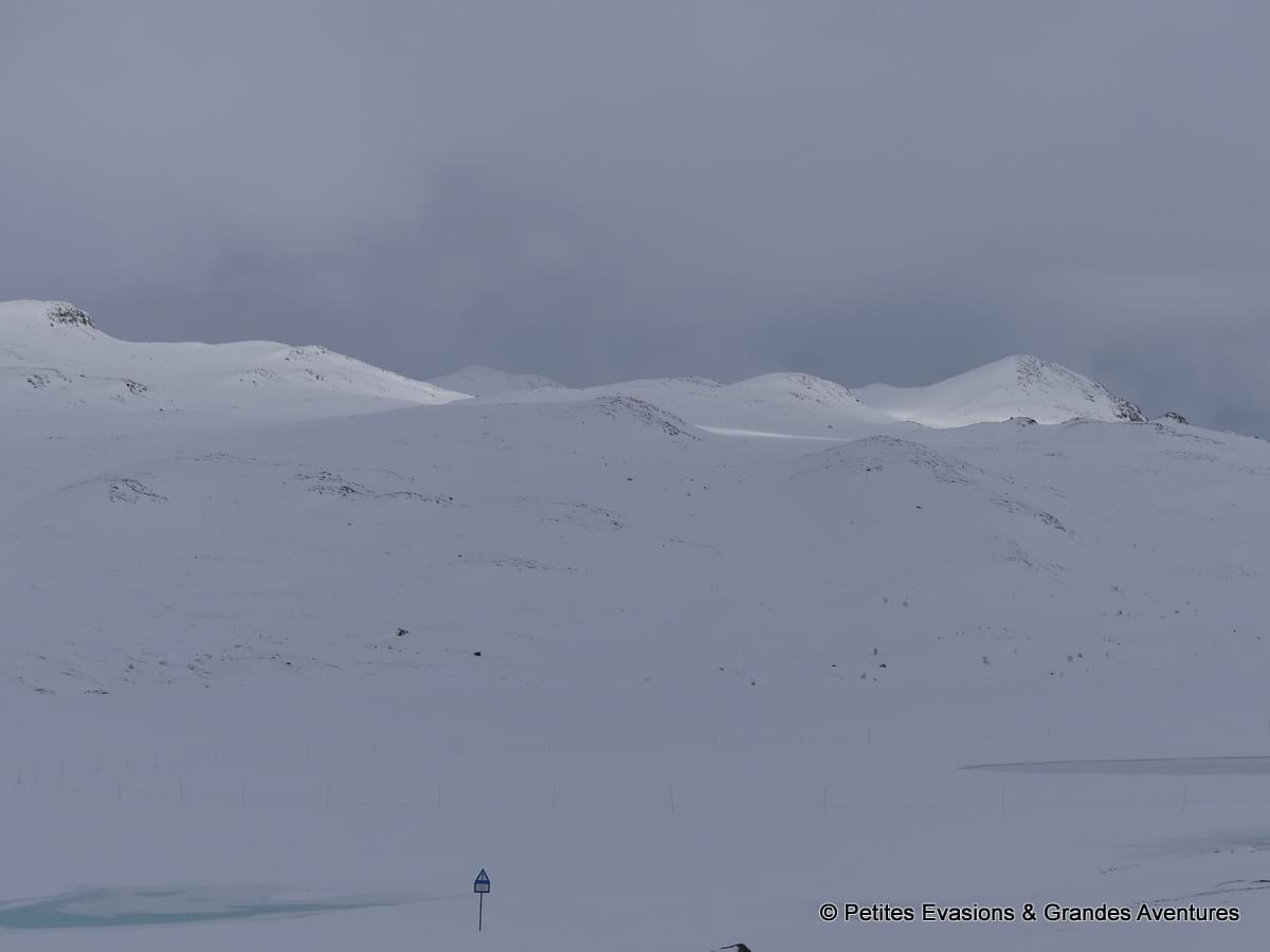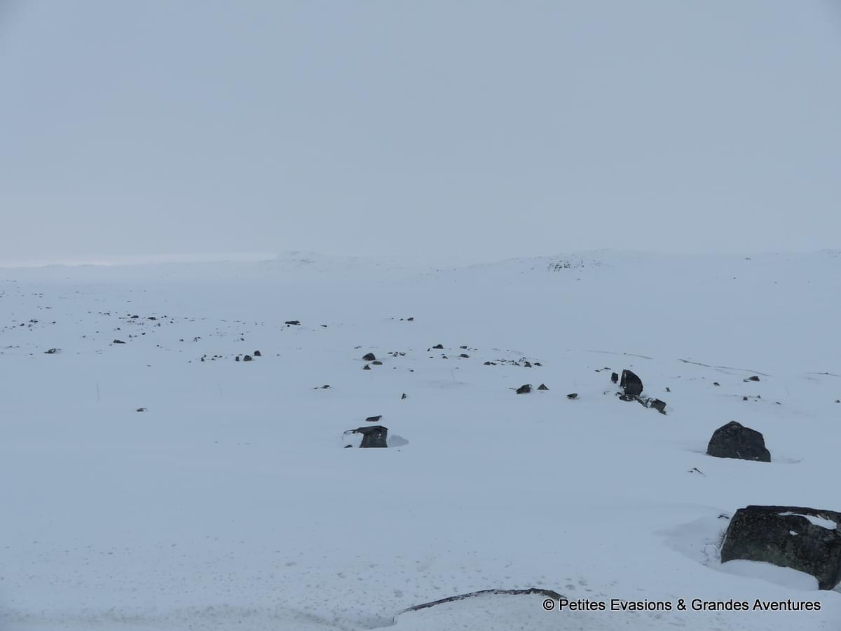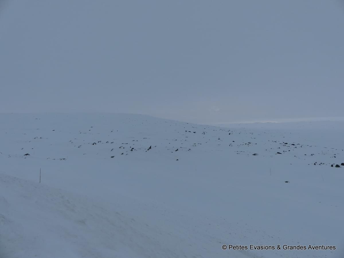 Je ne veux pas oublier, ce blanc, incroyable, enveloppant, aveuglant même, sur les hauts plateaux près de l’Eldrevatnet ou de Dyranut. Ce blanc tant attendu, espéré comme au matin de Noël, celui de la neige, d’un hiver que l’on attend toujours à Toulouse ... Sur ces hauts plateaux où tout n’était que blancheur, du ciel au sol, rendant complexe le discernement entre les deux, j’ai eu le sentiment de voir plus de neige là que dans toute ma vie jusqu’à présent. A perte de vue, de toute part, il n’y avait que du blanc, et même les rares maisons plantées dans ce décor hivernal s’enfonçaient dans et sous la neige, disparaissant presque entièrement dans ce manteau blanc.