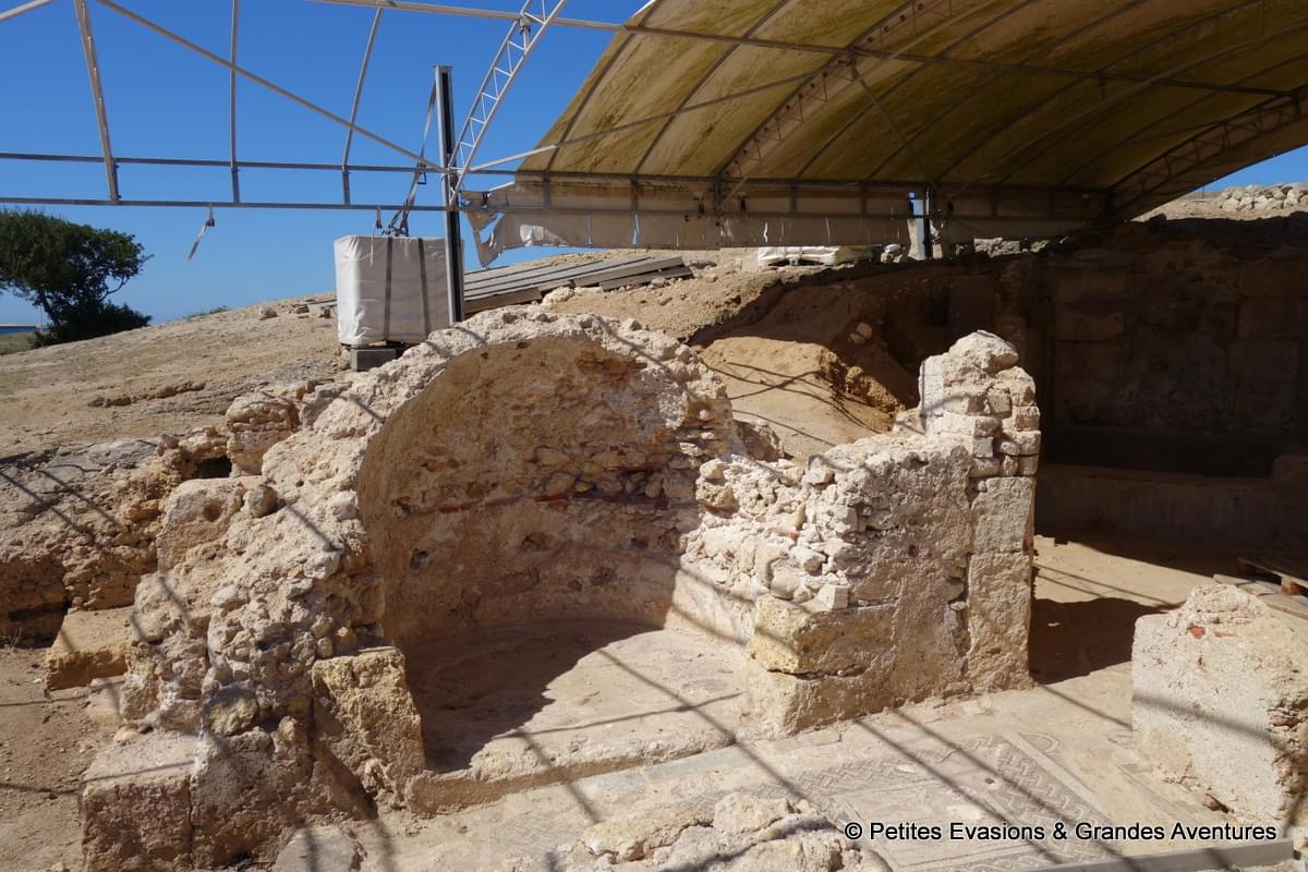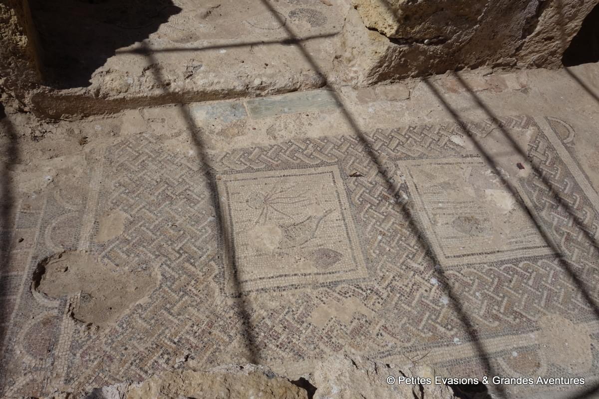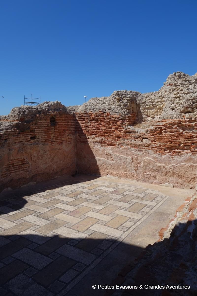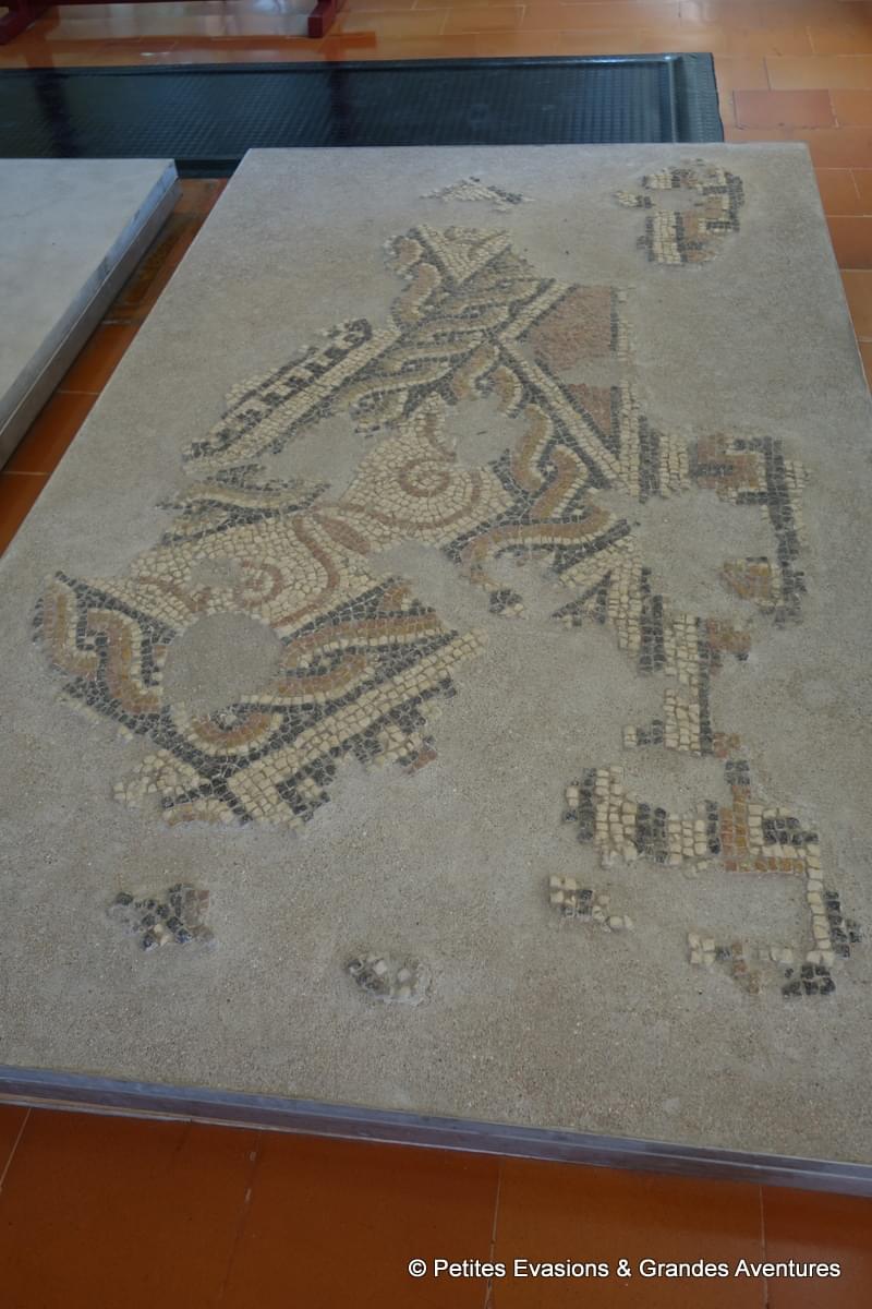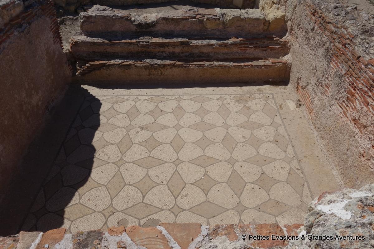 Lors de cette visite guidée (en italien) sur ce site chargé d'histoire, on a également vu des mosaïques du 2e siècle, remarquablement bien conservées. Depuis quelques années, un abri a été construit au-dessus des bassins ornés de ces magnifiques mosaïques, ce qui permet de préserver ces vestiges contre les intempéries mais aussi contre le soleil et la chaleur qui pourraient également les détériorer.