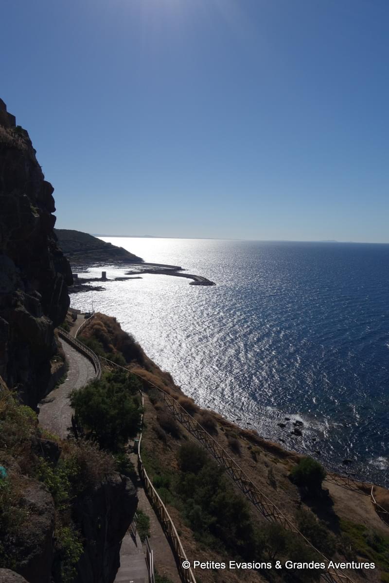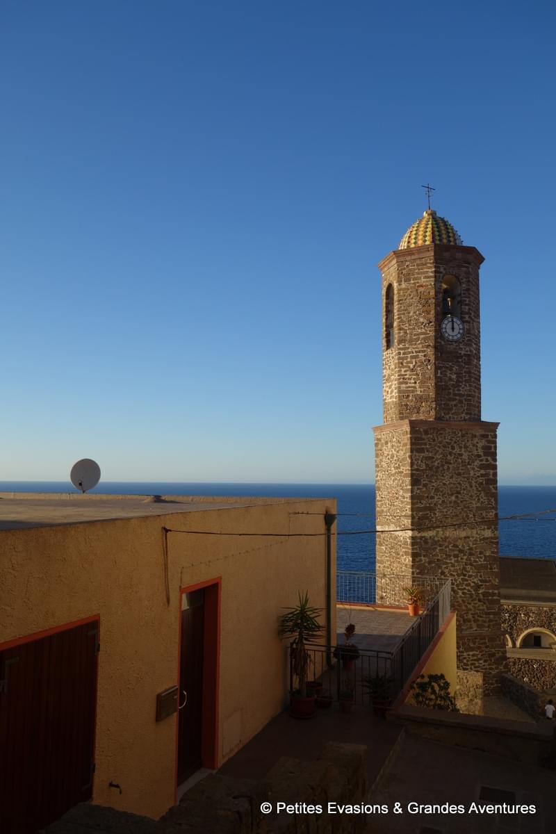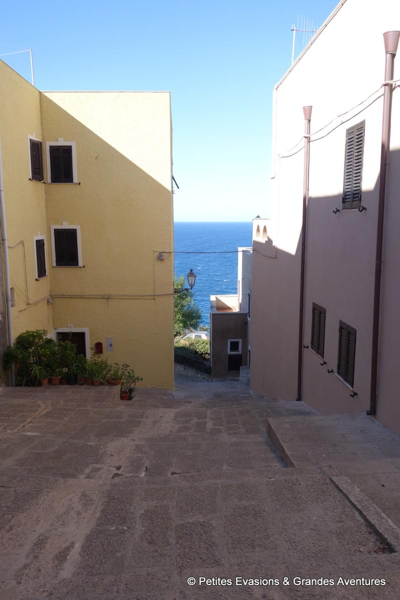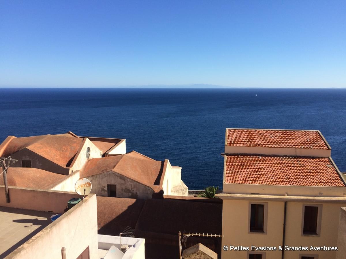 Le cœur de Castelsardo est piéton, les petites rues qui serpentent tout en haut de la colline ne sont pas assez larges pour accueillir des voitures et les escaliers bien trop nombreux pour que la circulation, même en deux roues, soit possible ! On a donc laissé notre voiture le long de la Via Rinascita, embarqué toutes nos affaires et, après quelques flopées de marches en descente ou en montée, on a finalement toqué à la porte du B&B Lupolciu e Calarina où nous attendait notre jolie chambre, et une très sympathique terrasse, toutes deux avec vue sur la mer.