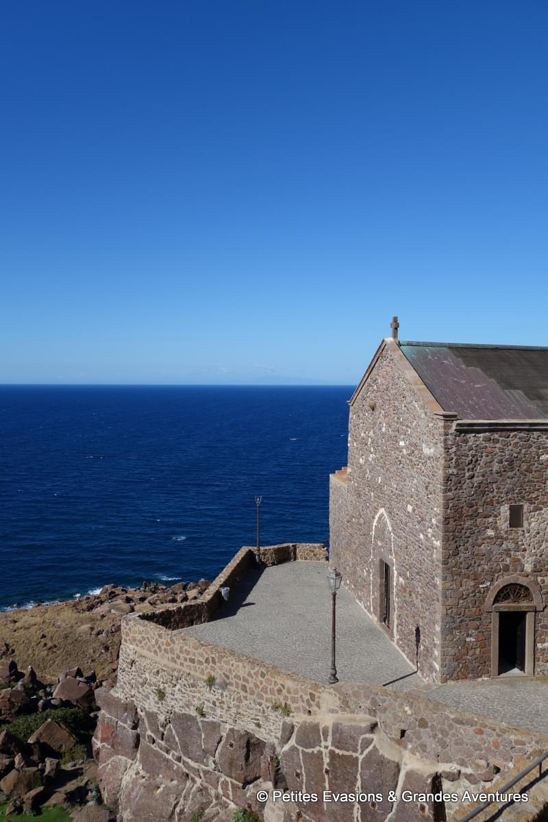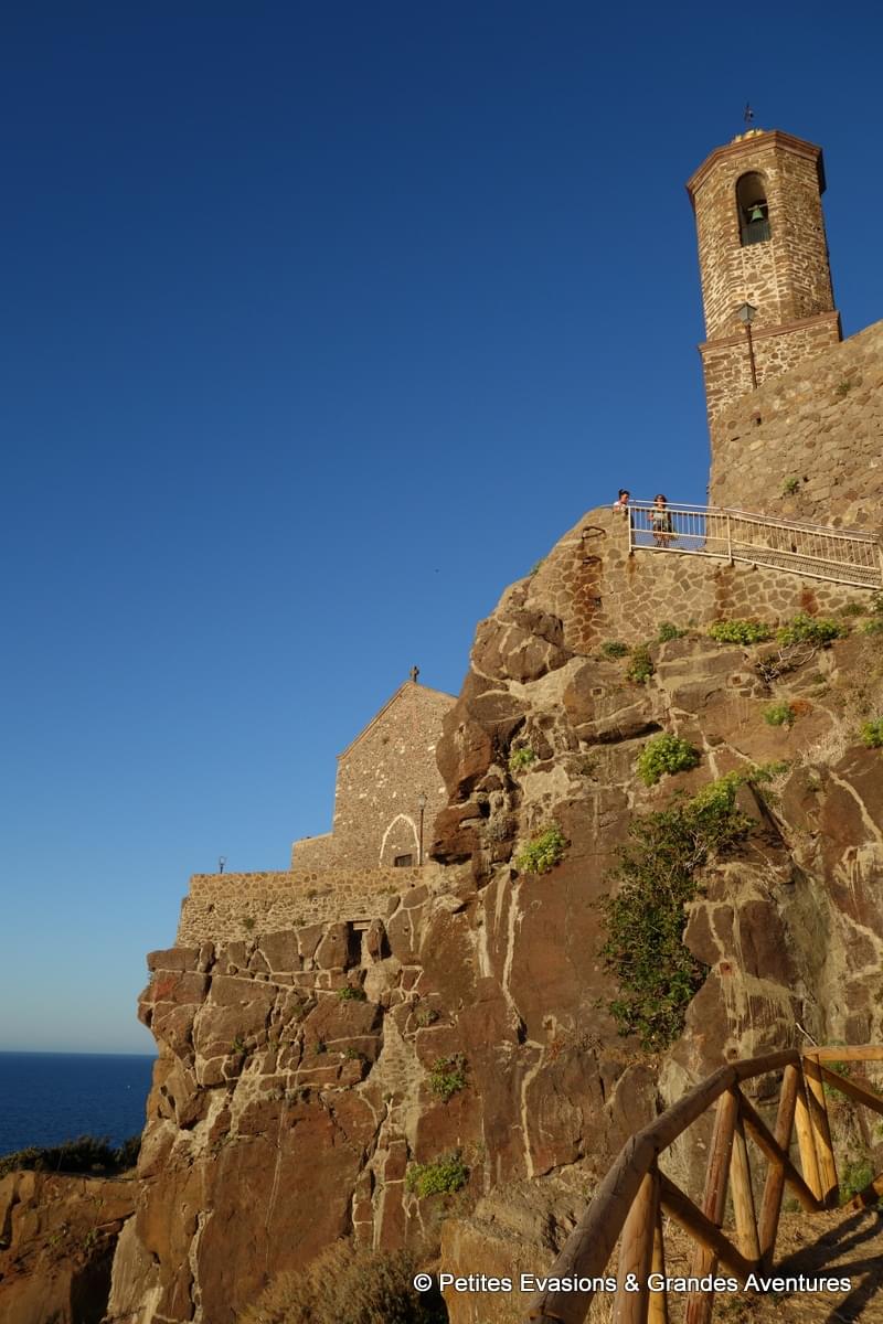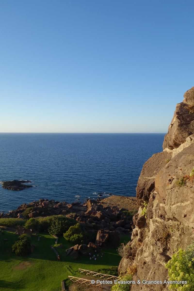 Depuis son parvis, le bleu profond de la Méditerranée offrait un contraste magnifique avec le vert du Parco Lu Grannadu, en contrebas, et la couleur entre le marron et le gris des rochers impressionnants qui se trouvaient là. Au loin, on apercevait le relief de la Corse qui ajoutait une nuance de gris-bleu différente entre le ciel et la mer.