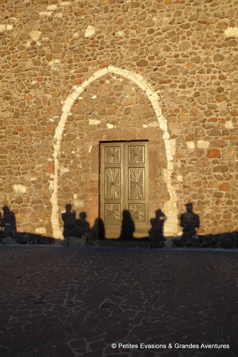 Erigée en 1300, la Chiesa Santa Maria, toute en pierre trachytique et calcaire, a une seule entrée, sur le côté du bâtiment. Quatre arcades ornent cette façade où se trouvent également quelques fenêtres, plus ou moins grandes et sans vitraux. La troisième arcade abrite la porte d'entrée en bois, toute simple, de cette église sans fioriture, mais dont la simplicité justement a marqué nos esprits.