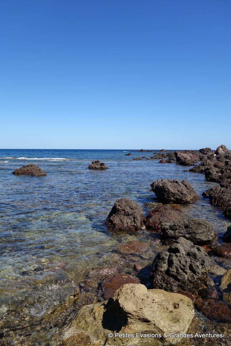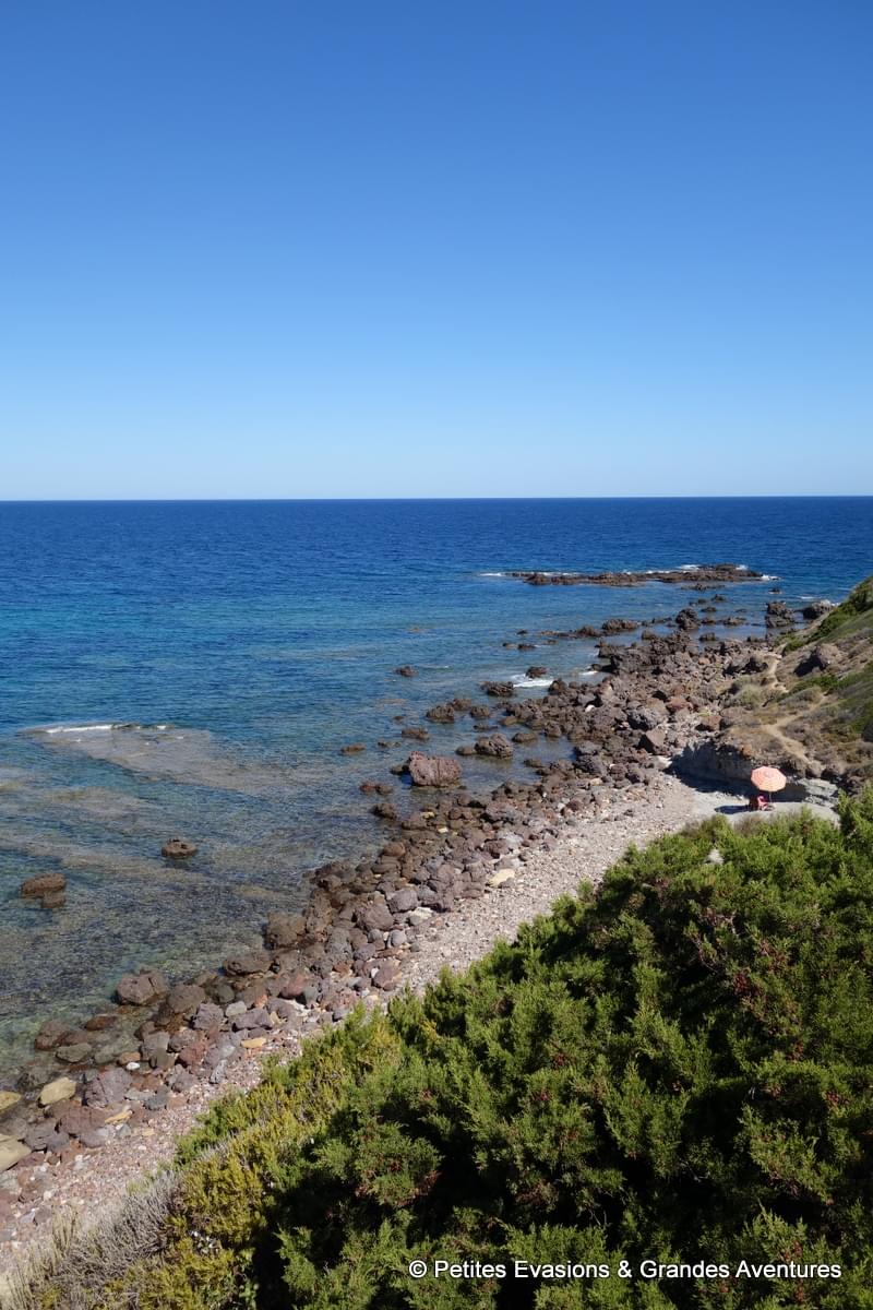 Après une bonne nuit de sommeil, et un petit déjeuner avec une vue de rêve sur les toits colorés de la ville et la mer, le temps était venu pour nous d’aller profiter de la mer … En préparant notre voyage, j’avais vu que la spiaggia di Punta Tramontana était un très bel endroit. Direction donc cette plage de cailloux, à l’ouest de Castelsardo, qui semblait être le lieu idéal pour notre première baignade en Sardaigne et nos retrouvailles avec le snorkeling.